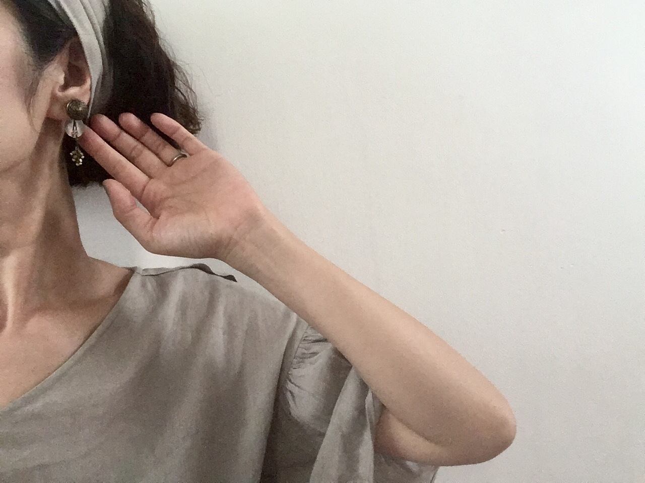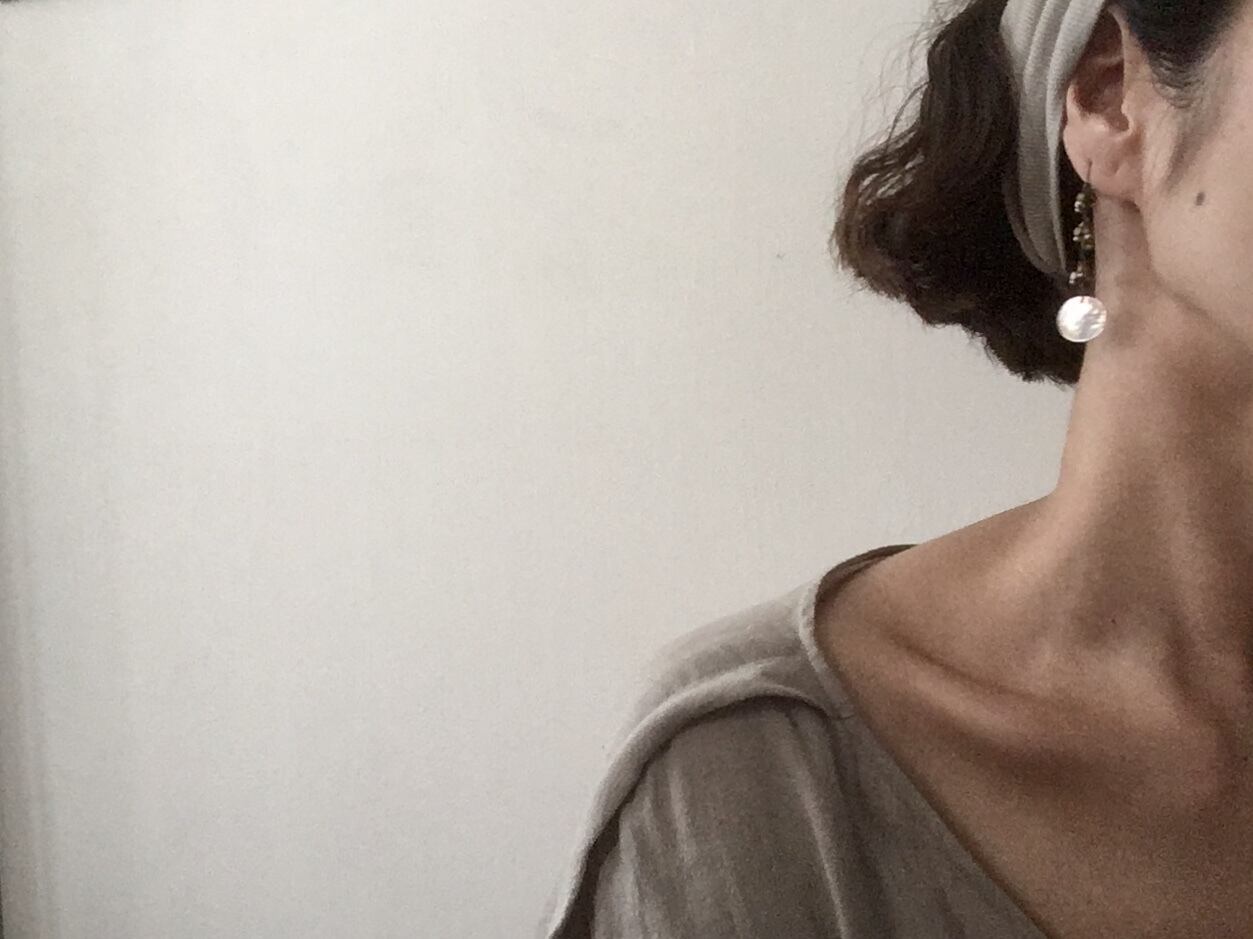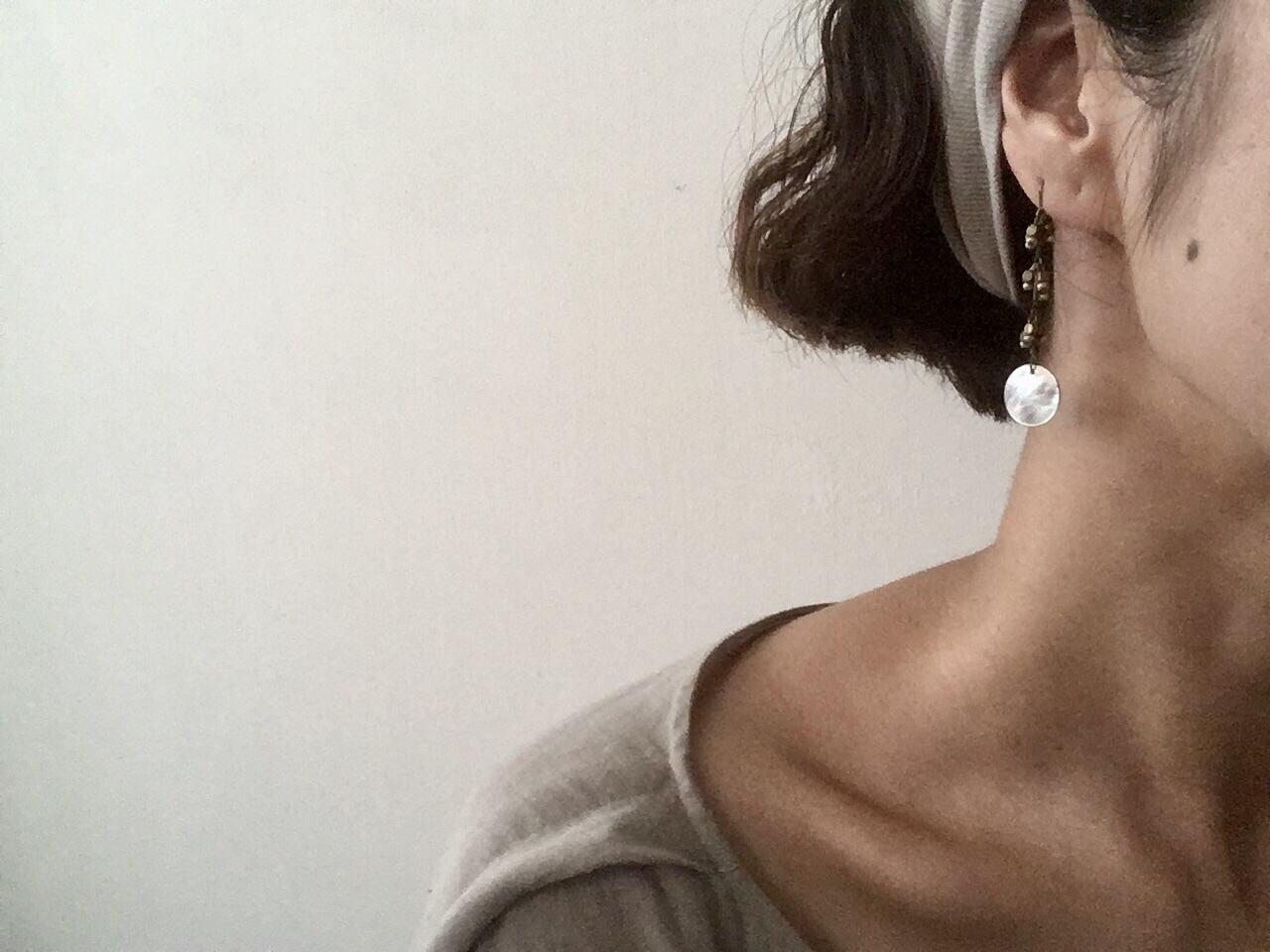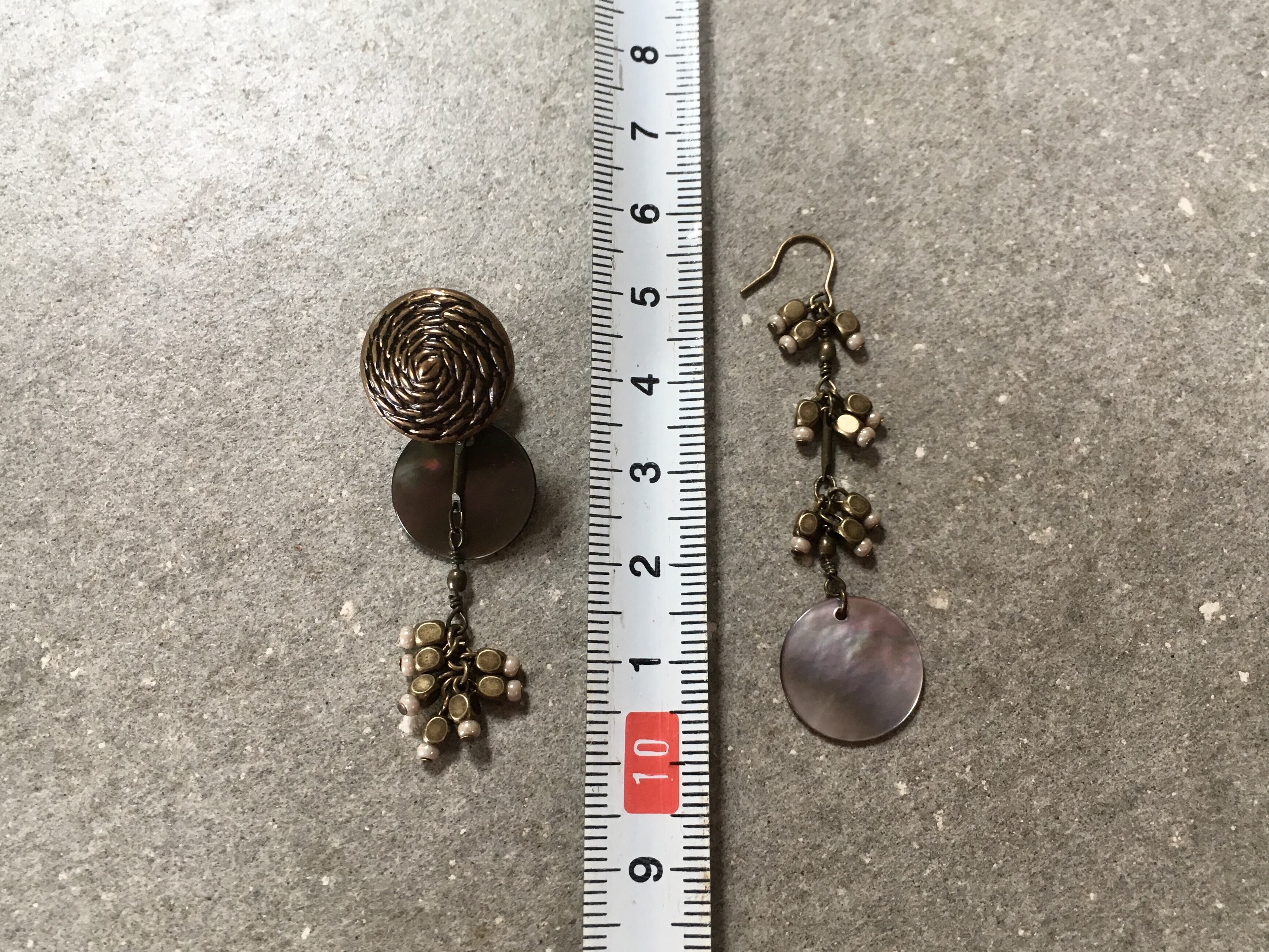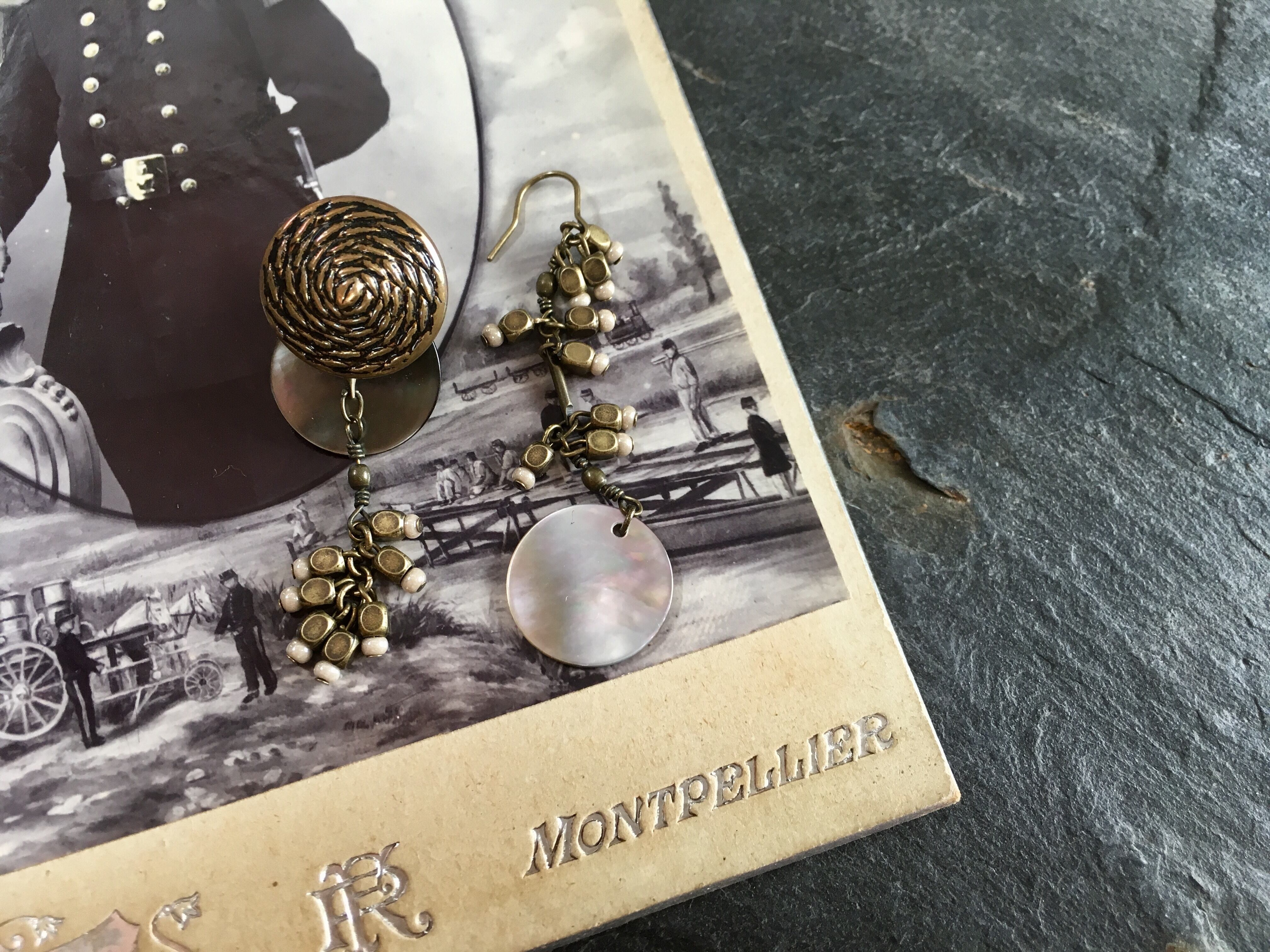 ヴィンテージボタンにシェルやシードビーズを添えて、アシンメトリーなピアスに仕上げました。