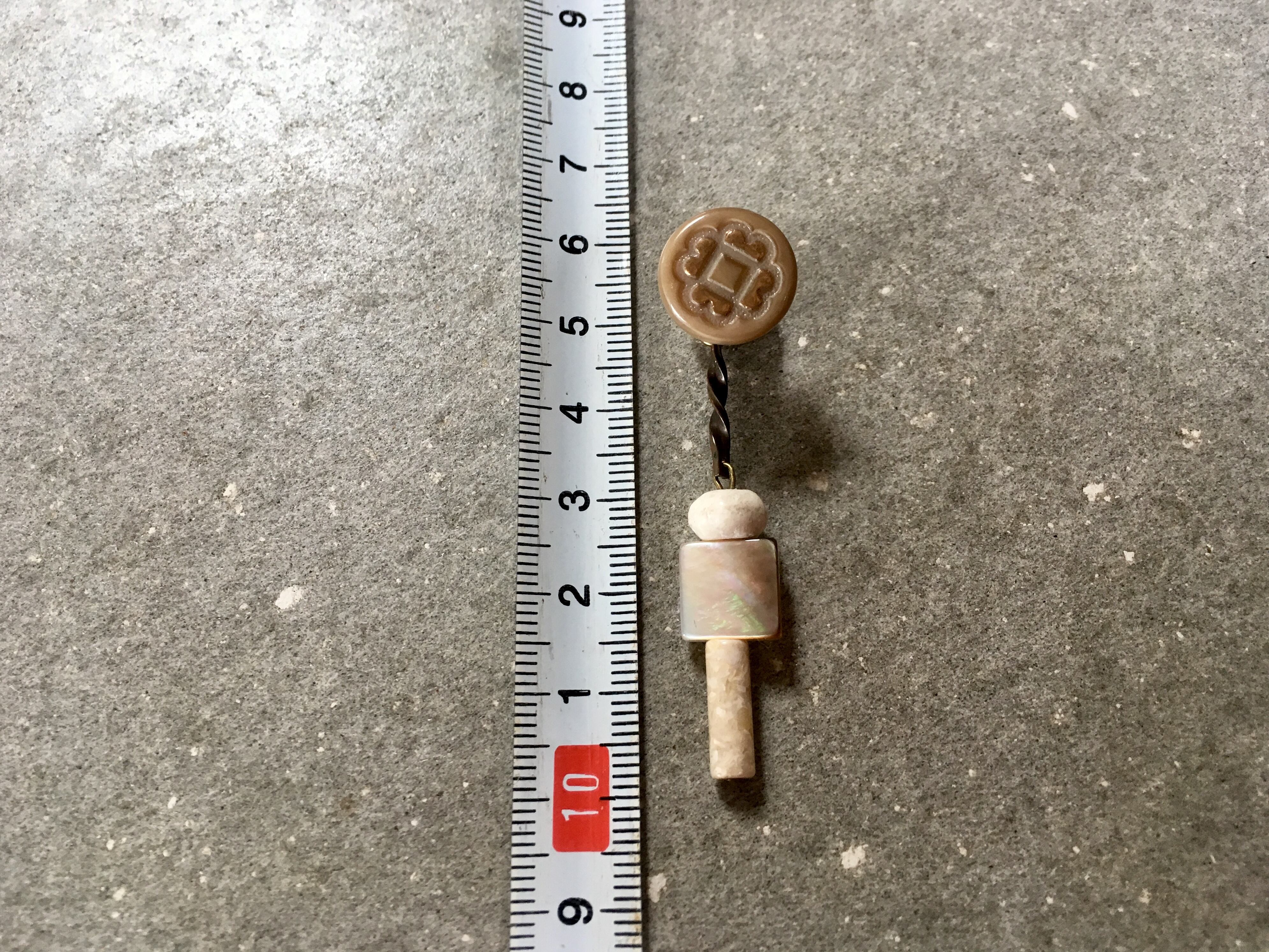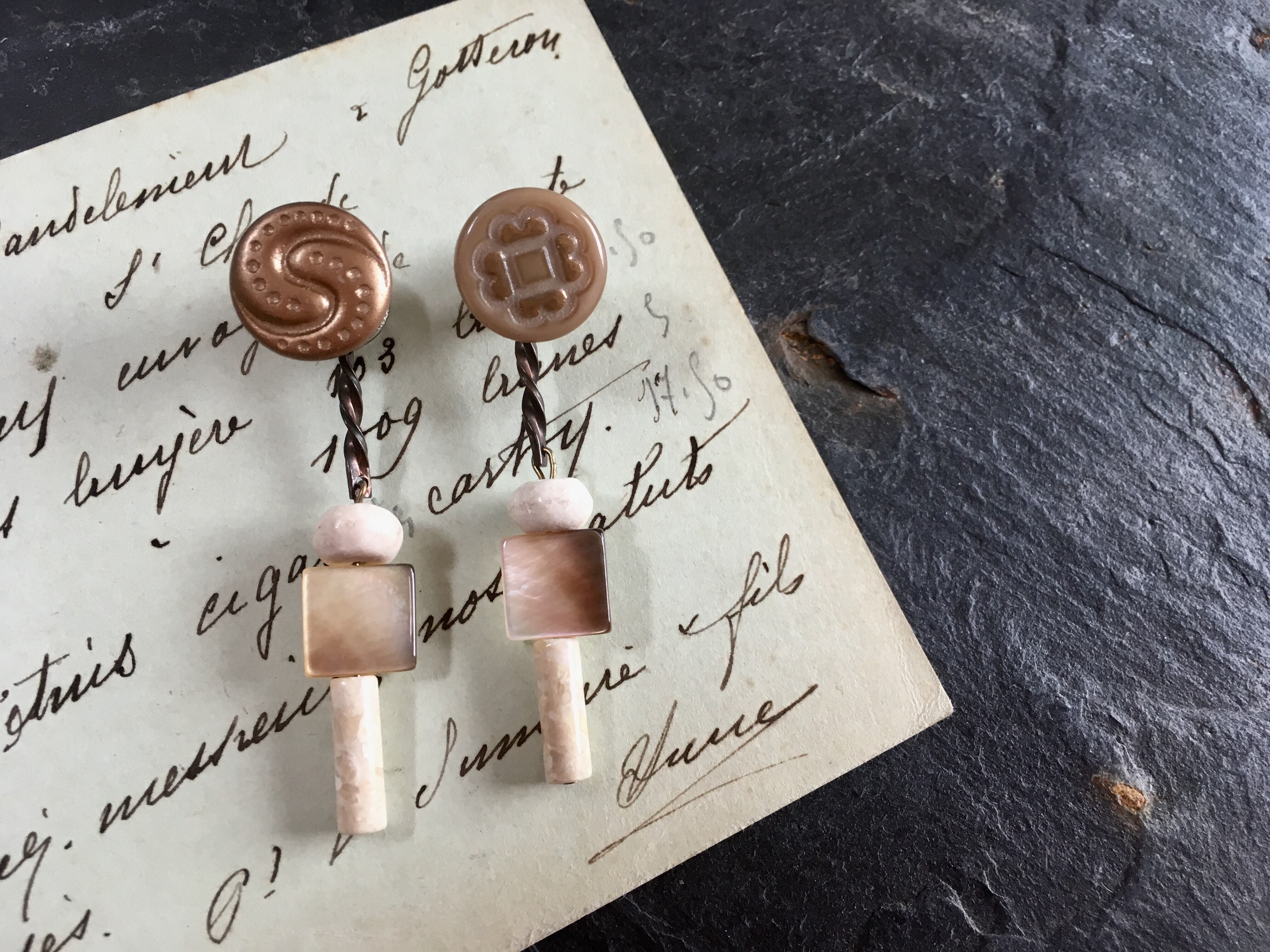 ヴィンテージチェコガラスボタンをカボションに、天然石とシェルを添えて、ピアスに仕上げました。