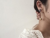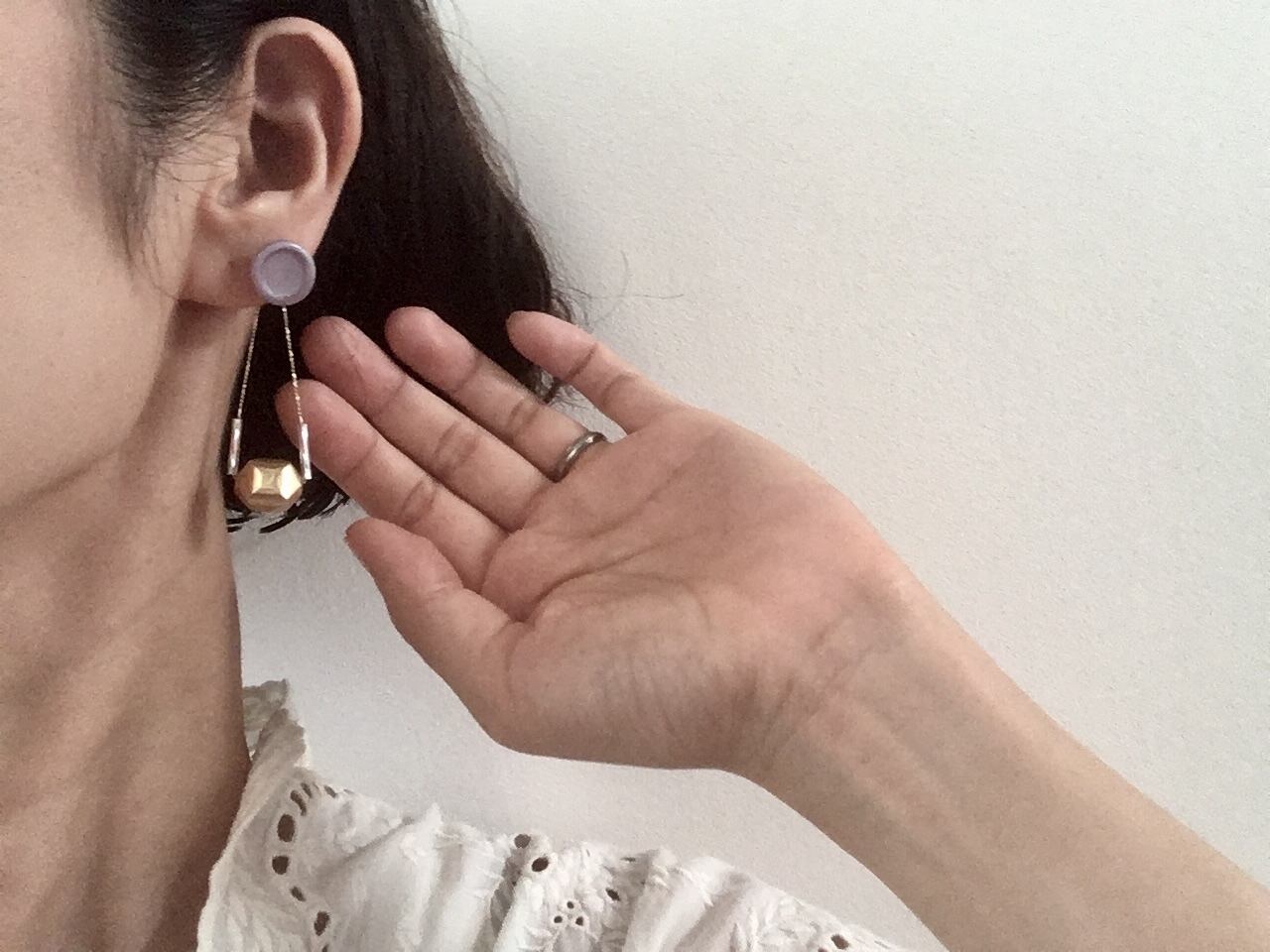 ヴィンテージチェコガラスボタンに、ヴィンテージビーズとガラスチューブをチェーンに通して、アシンメトリーなピアスに仕上げました。