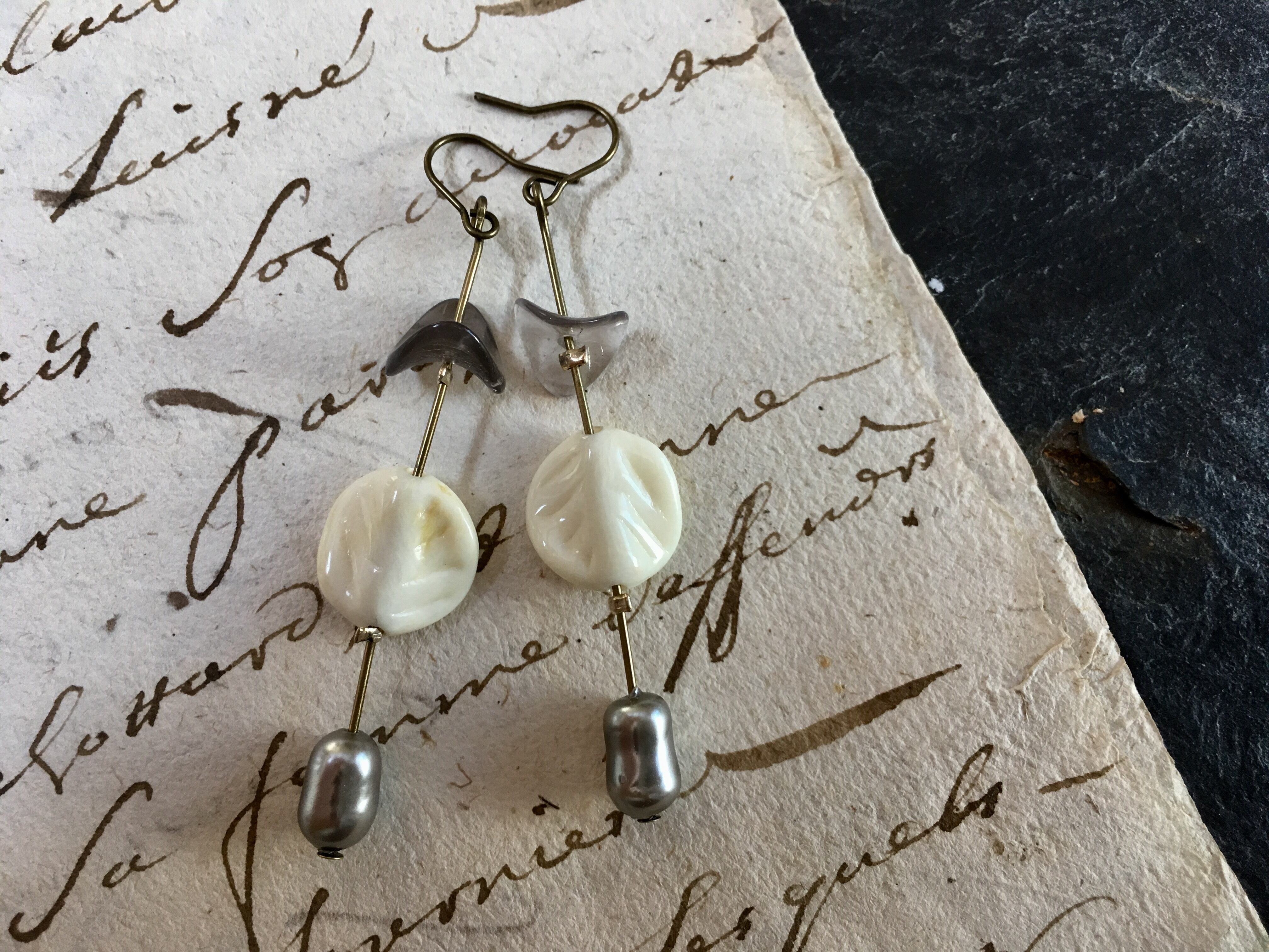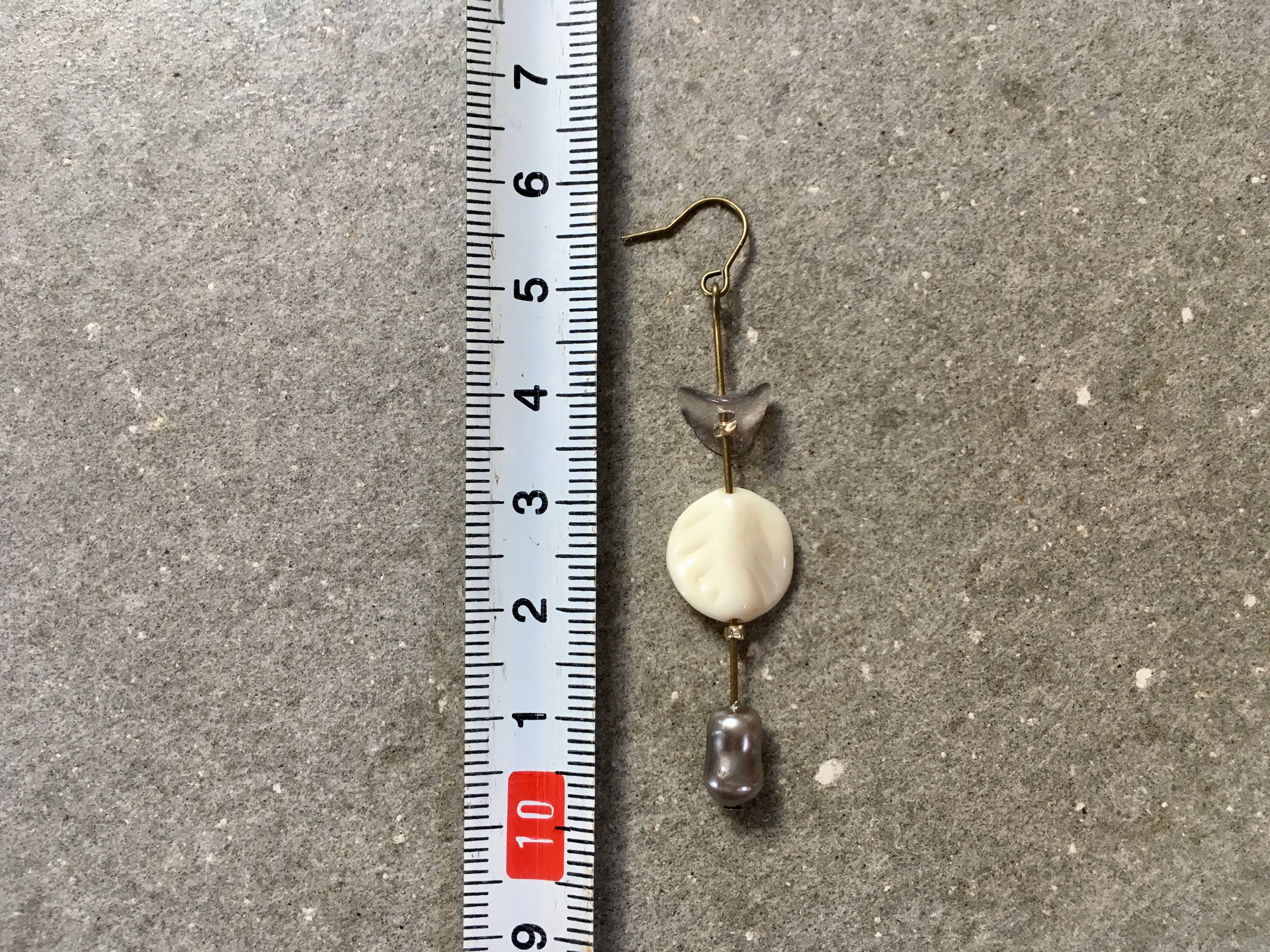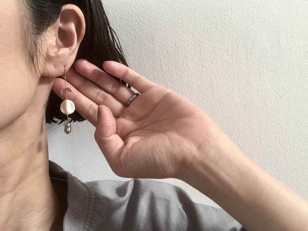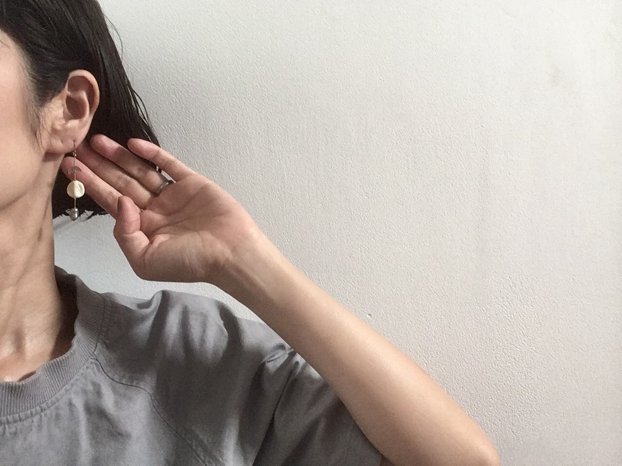 線上に点を置くように、それぞれ素材の異なるビーズを散らし、シンプルなピアスに仕上げました。