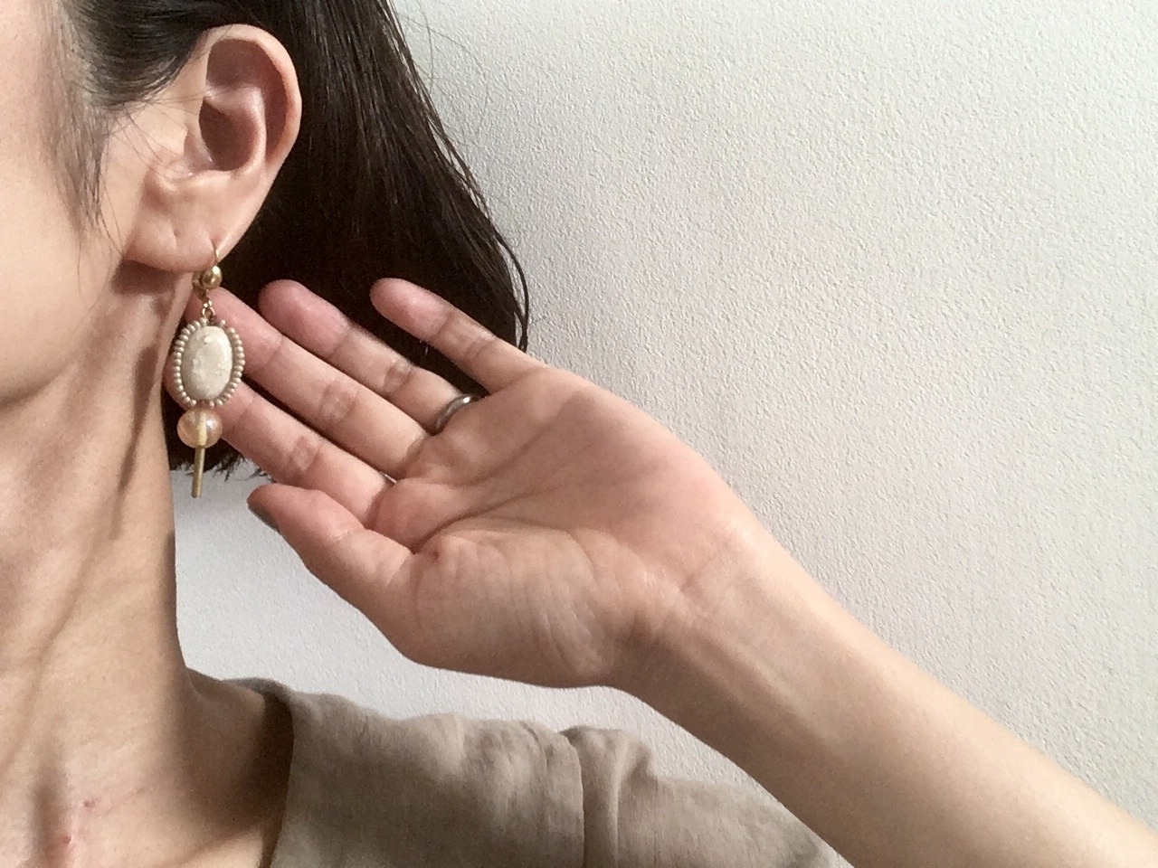 リバーストーンの周りにシードビーズをあしらい、ヴィンテージビーズと真鍮パイプを添えてピアスに仕上げました。