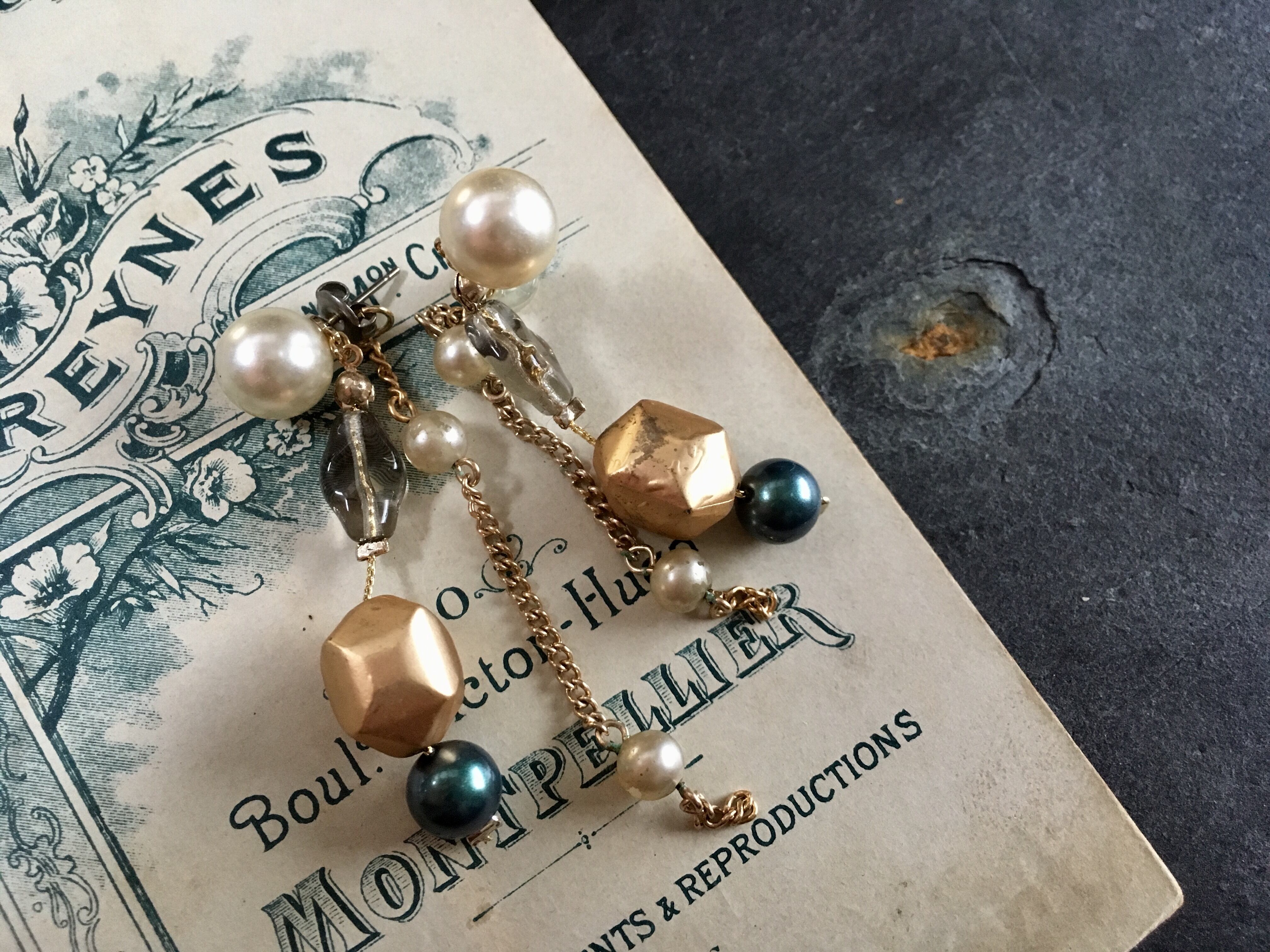 パールビーズやヴィンテージビーズ、ヴィンテージチェーンを組み合わせて、ピアスに仕上げました。