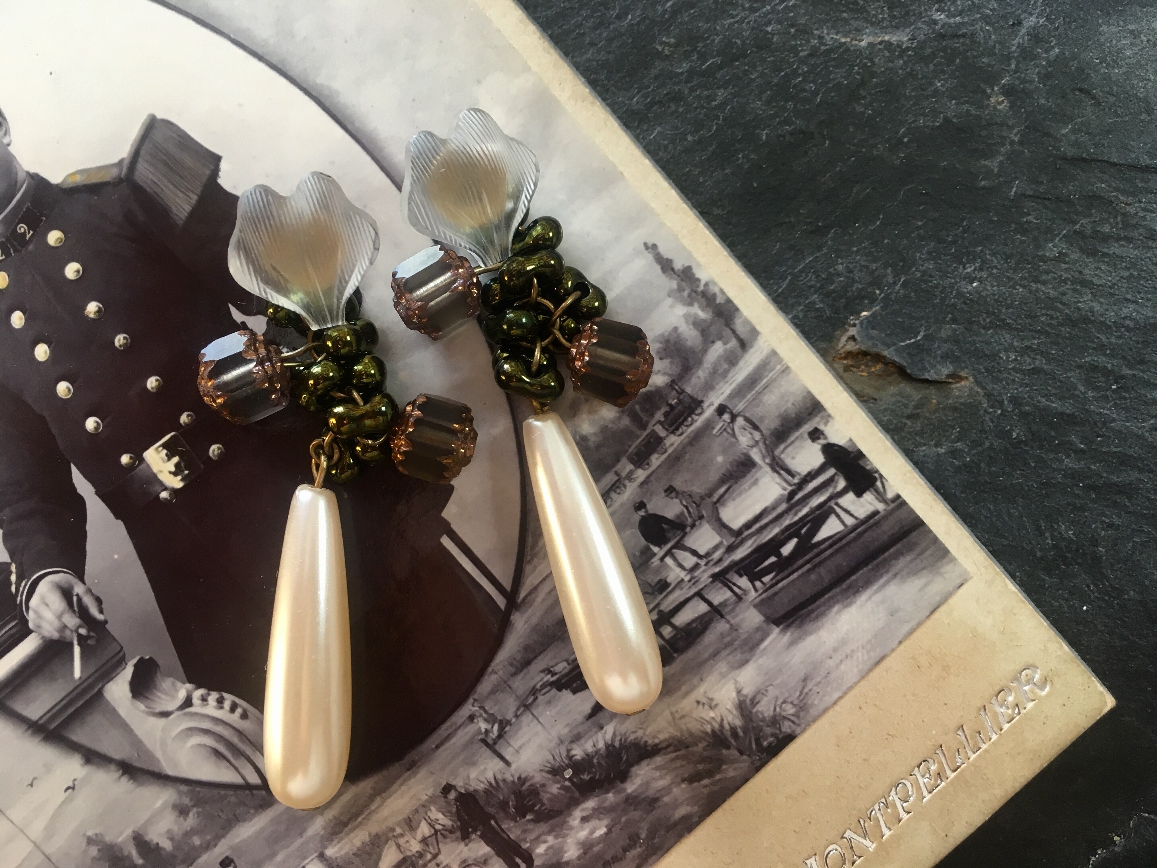 ヴィンテージカボションにヴィンテージパールビーズを添えて、ピアスを作りました。