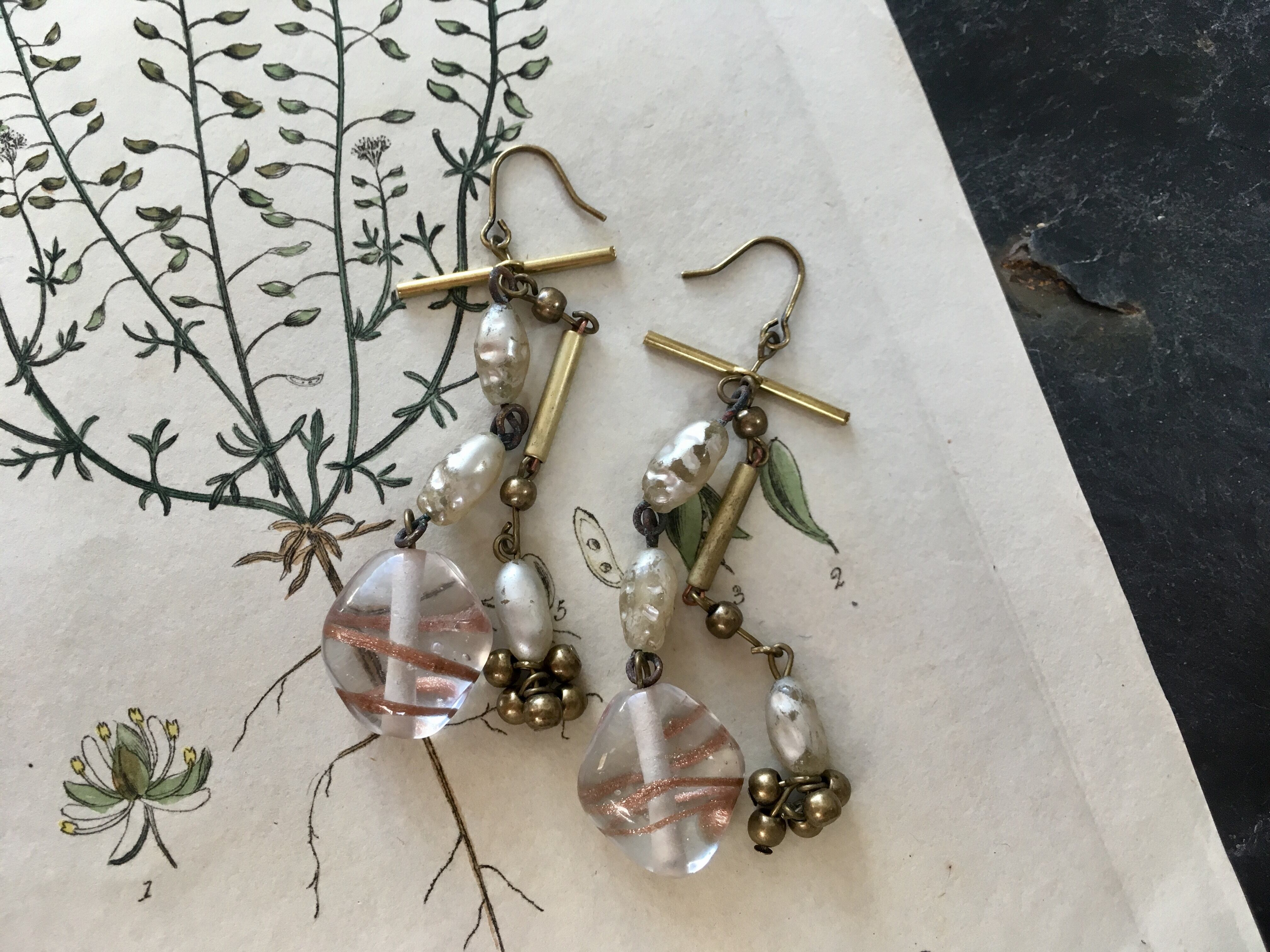 ヴィンテージビーズと真鍮を組み合わせて、ゆらゆらと揺れるフックピアスに仕上げました。