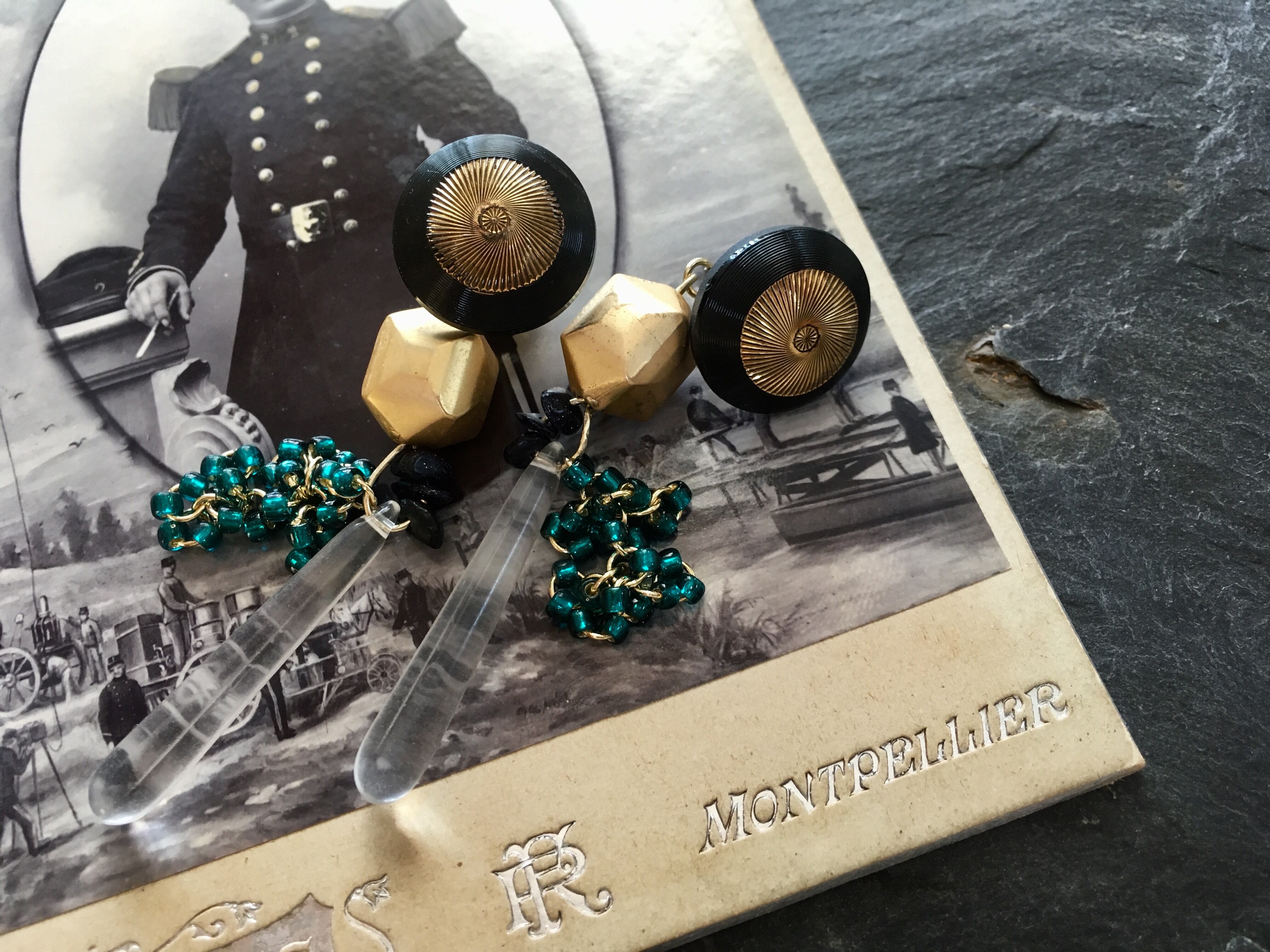 ヴィンテージボタンをカボションに、ヴィンテージビーズを添えてピアスに仕上げました。