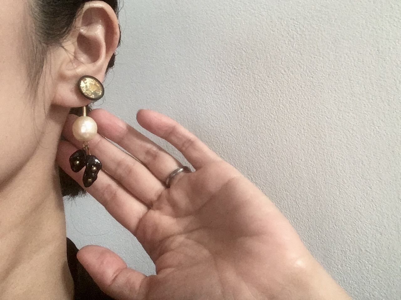 ヴィンテージボタンをカボションに、ヴィンテージビーズとヴィンテージパールを添えてアシンメトリーなピアスを作りました。