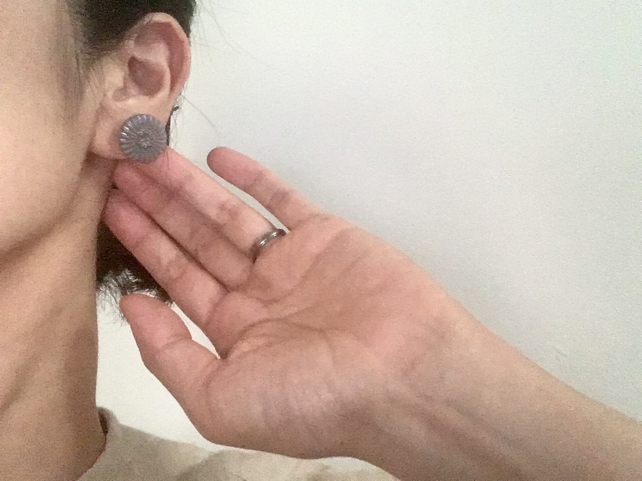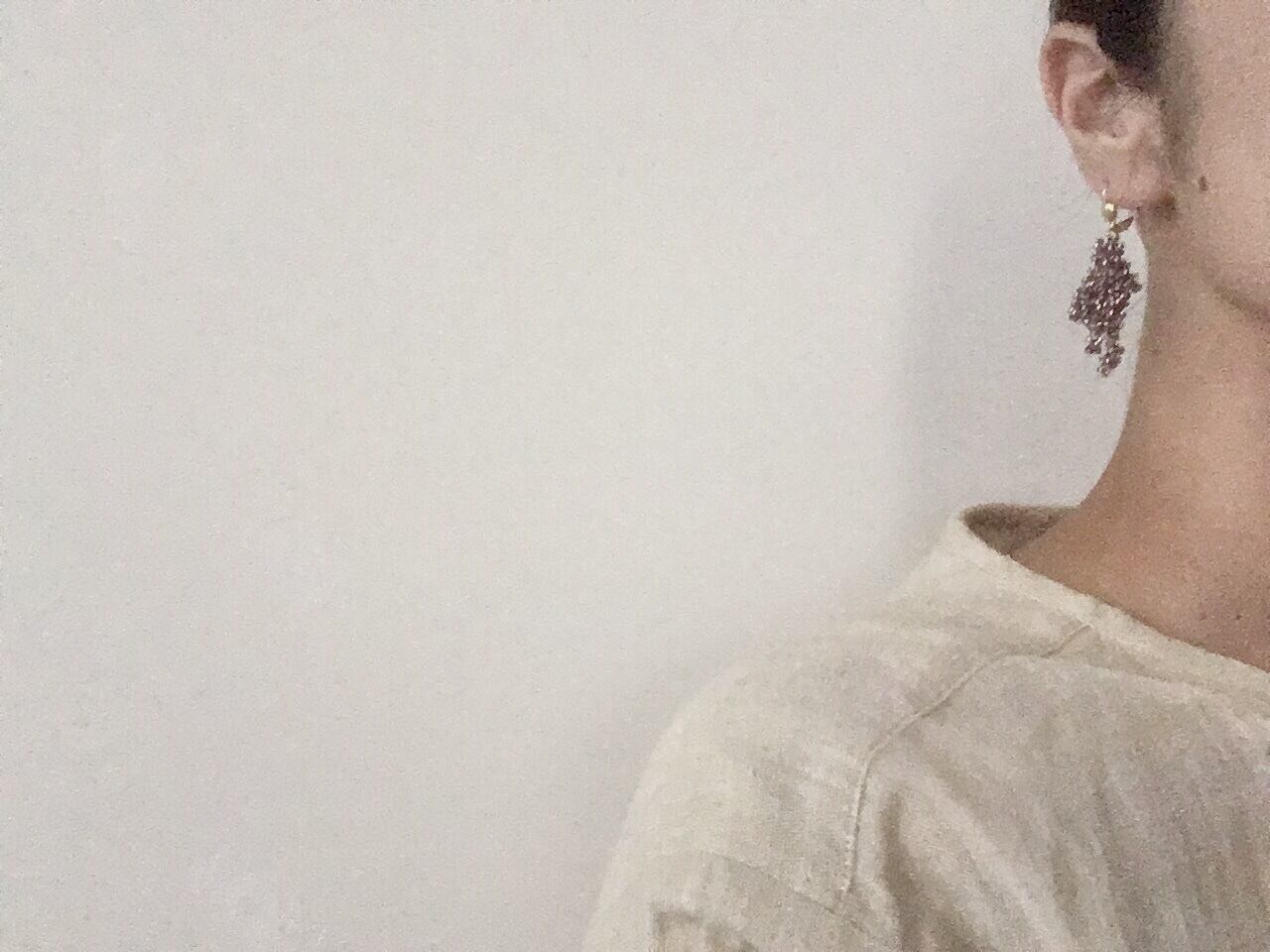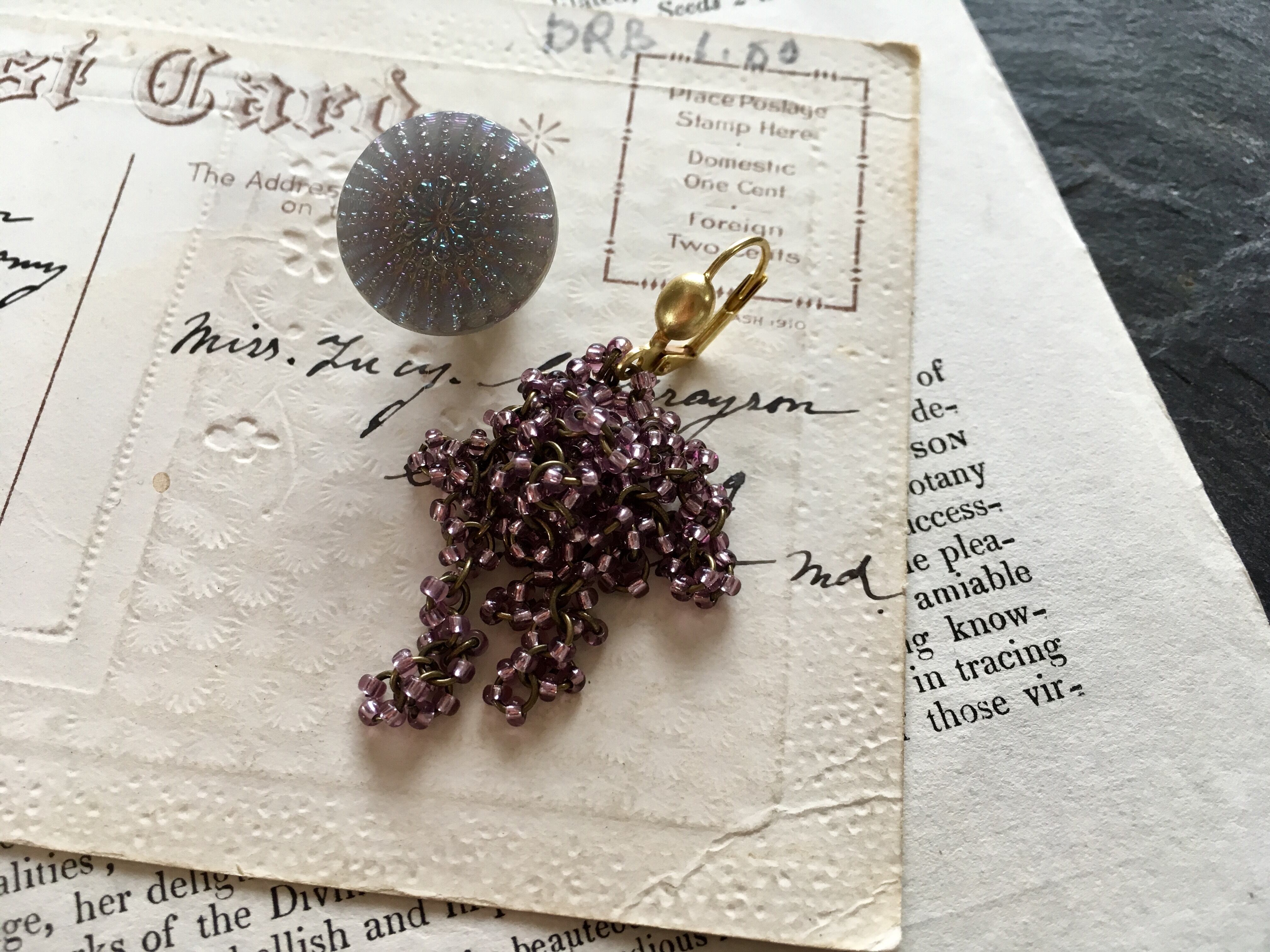 ヴィンテージボタンとシードビーズを使って、アシンメトリーなピアスに仕上げました。