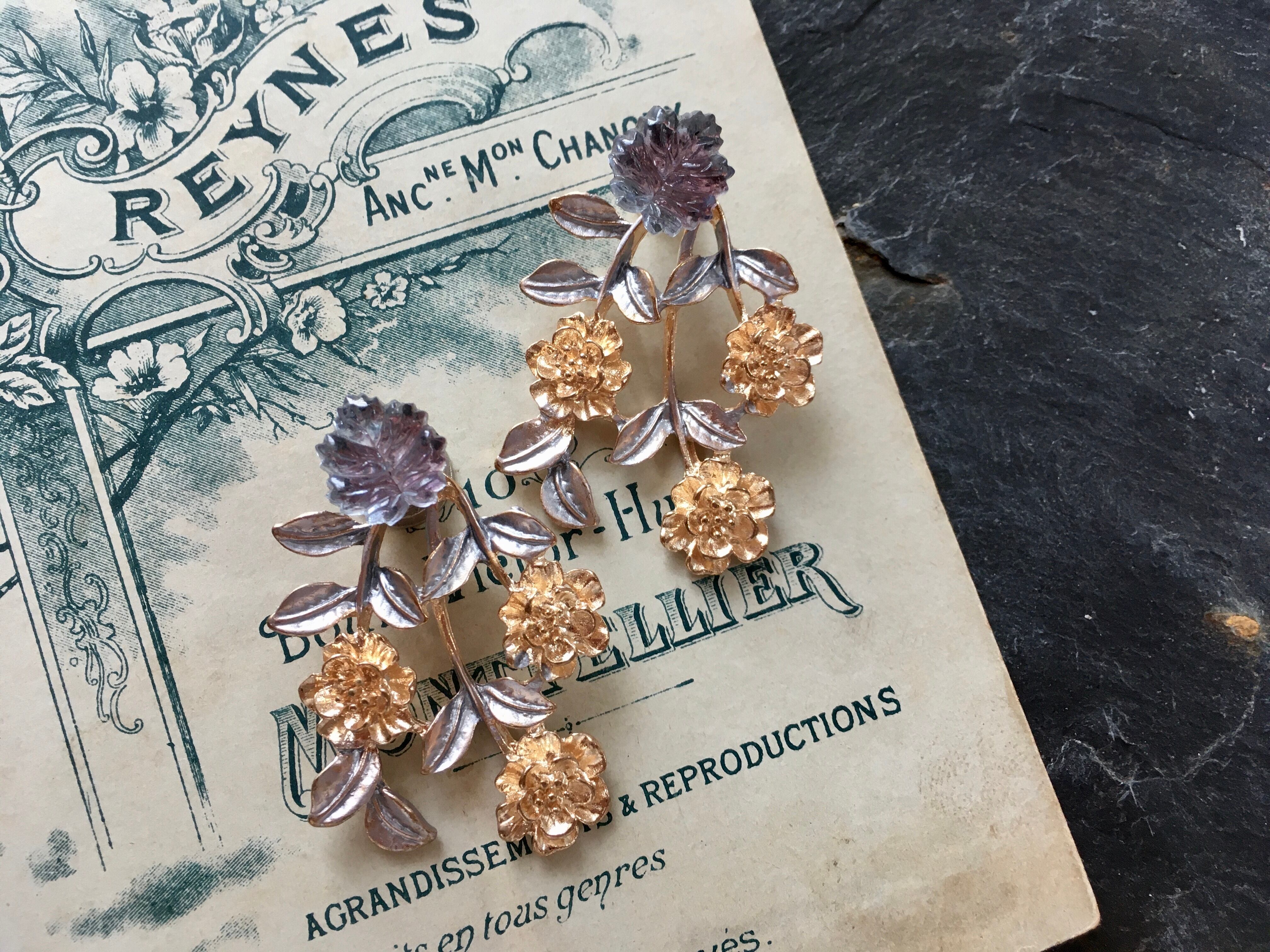 ヴィンテージカボションにお花パーツを添えてピアスに仕上げました。
