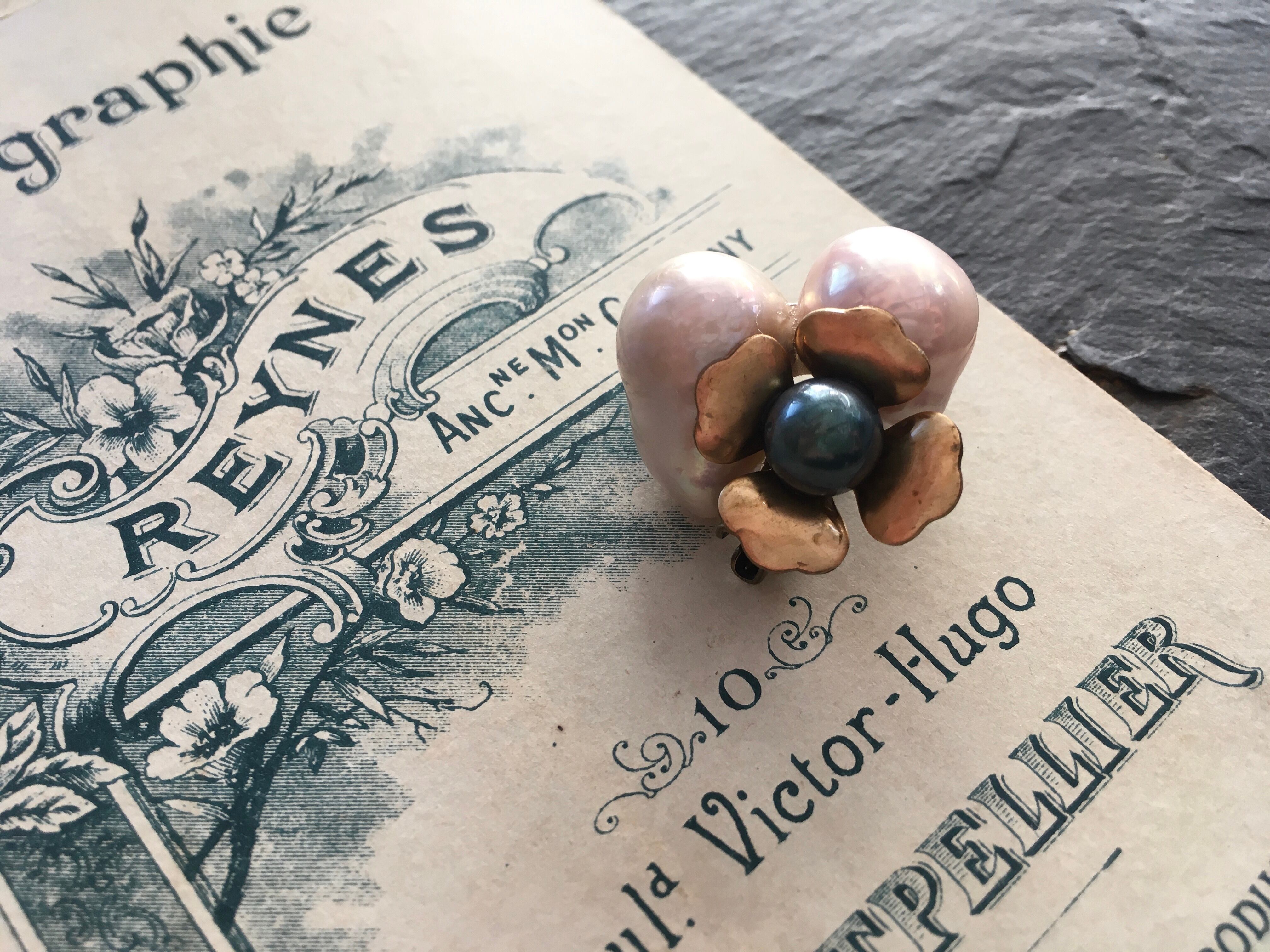 バロックパール、ヴィンテージ真鍮パーツ、ガラスパールを組み合わせて、ブローチに仕上げました。