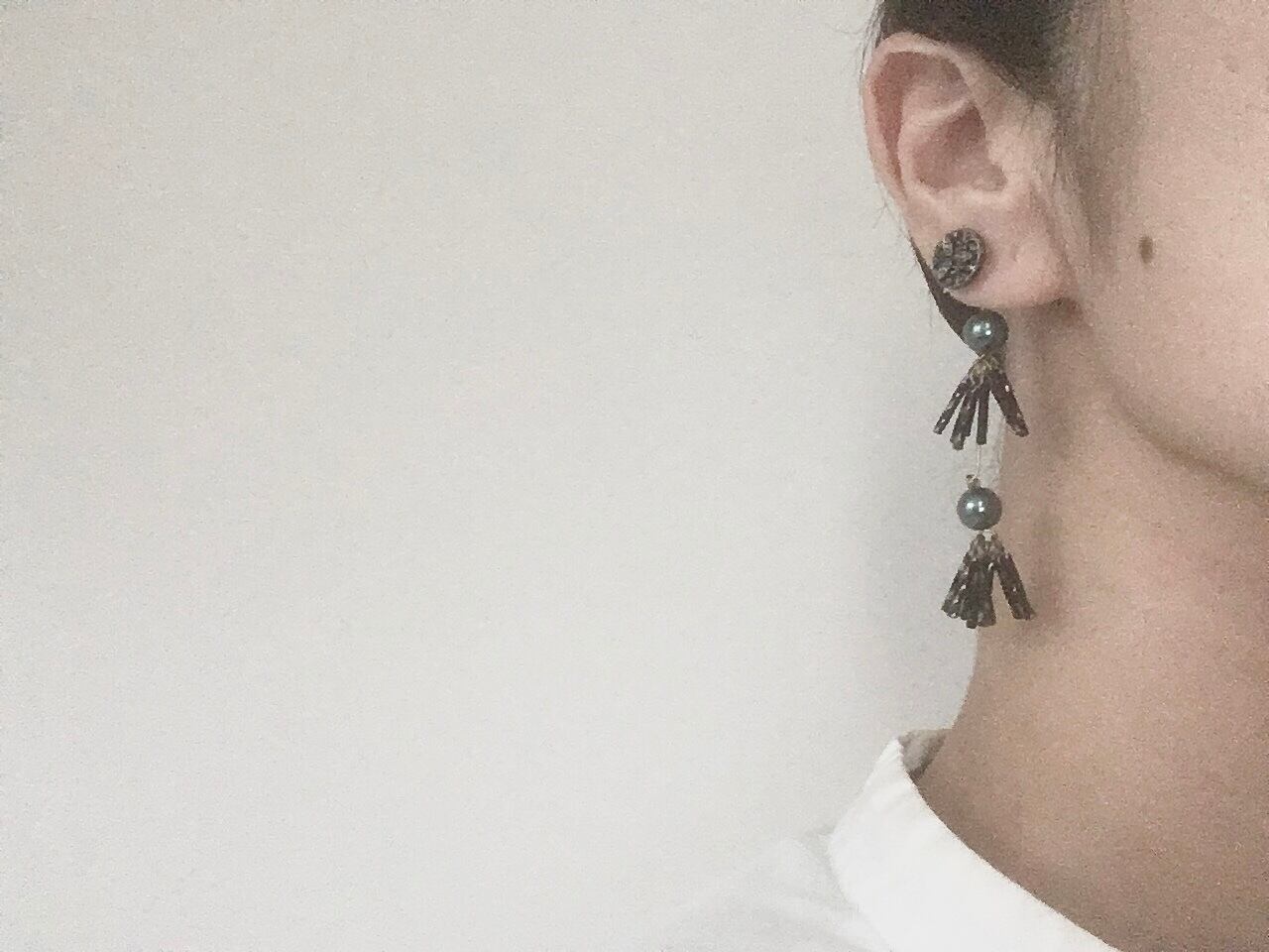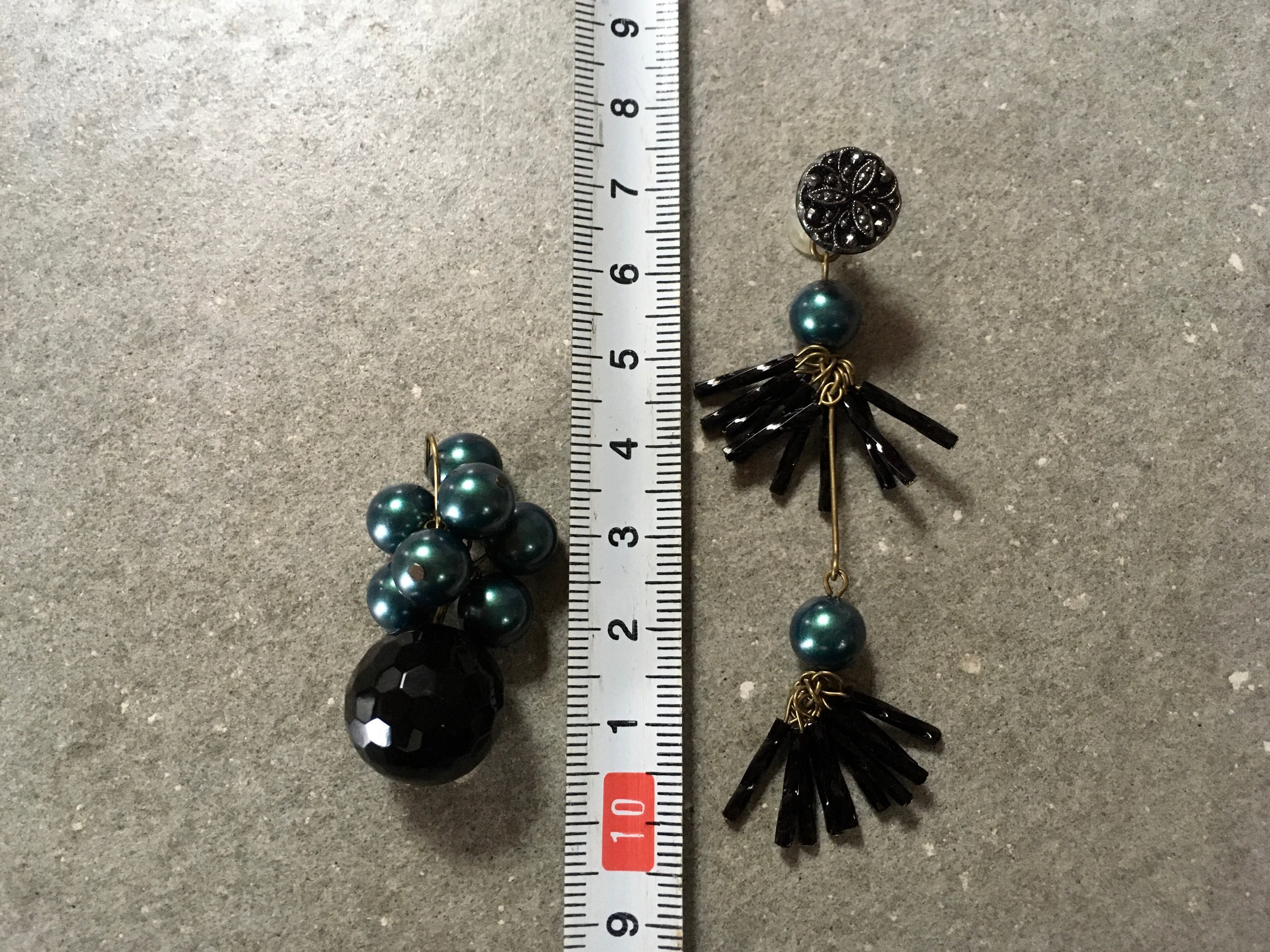 ヴィンテージボタンやヴィンテージビーズ、ガラスパールなどを組み合わせて、アシンメトリーなピアスに仕上げました。
