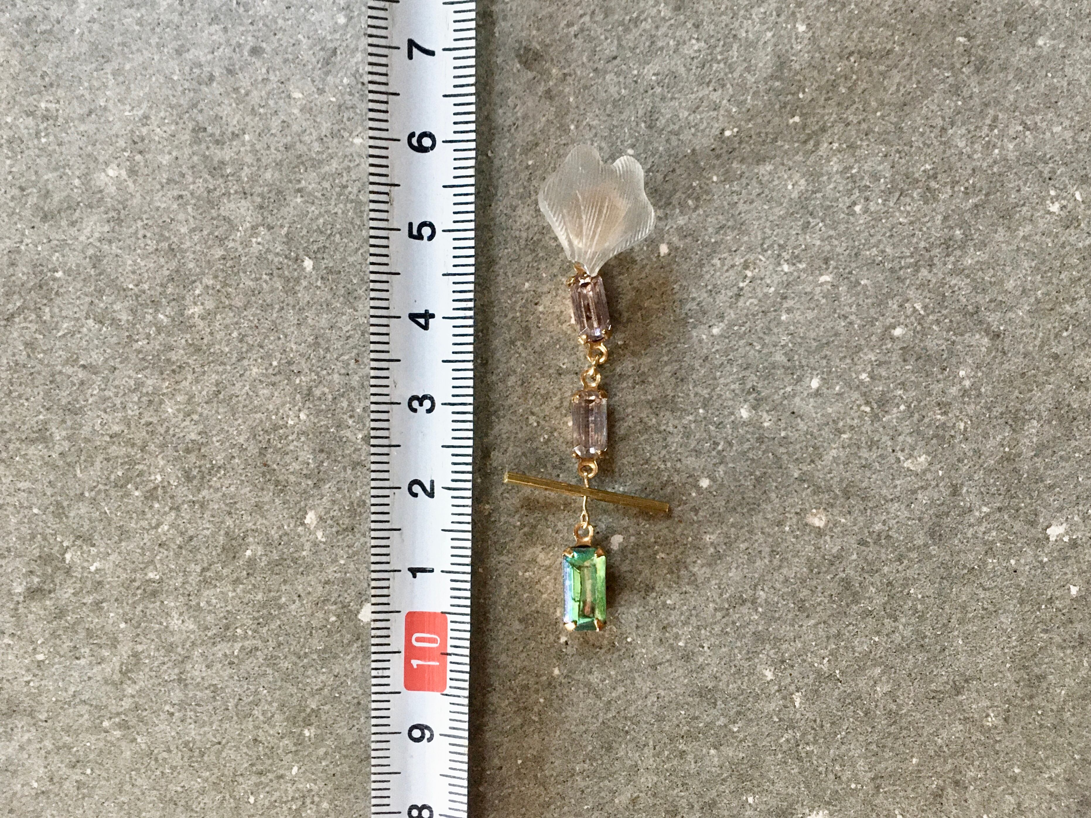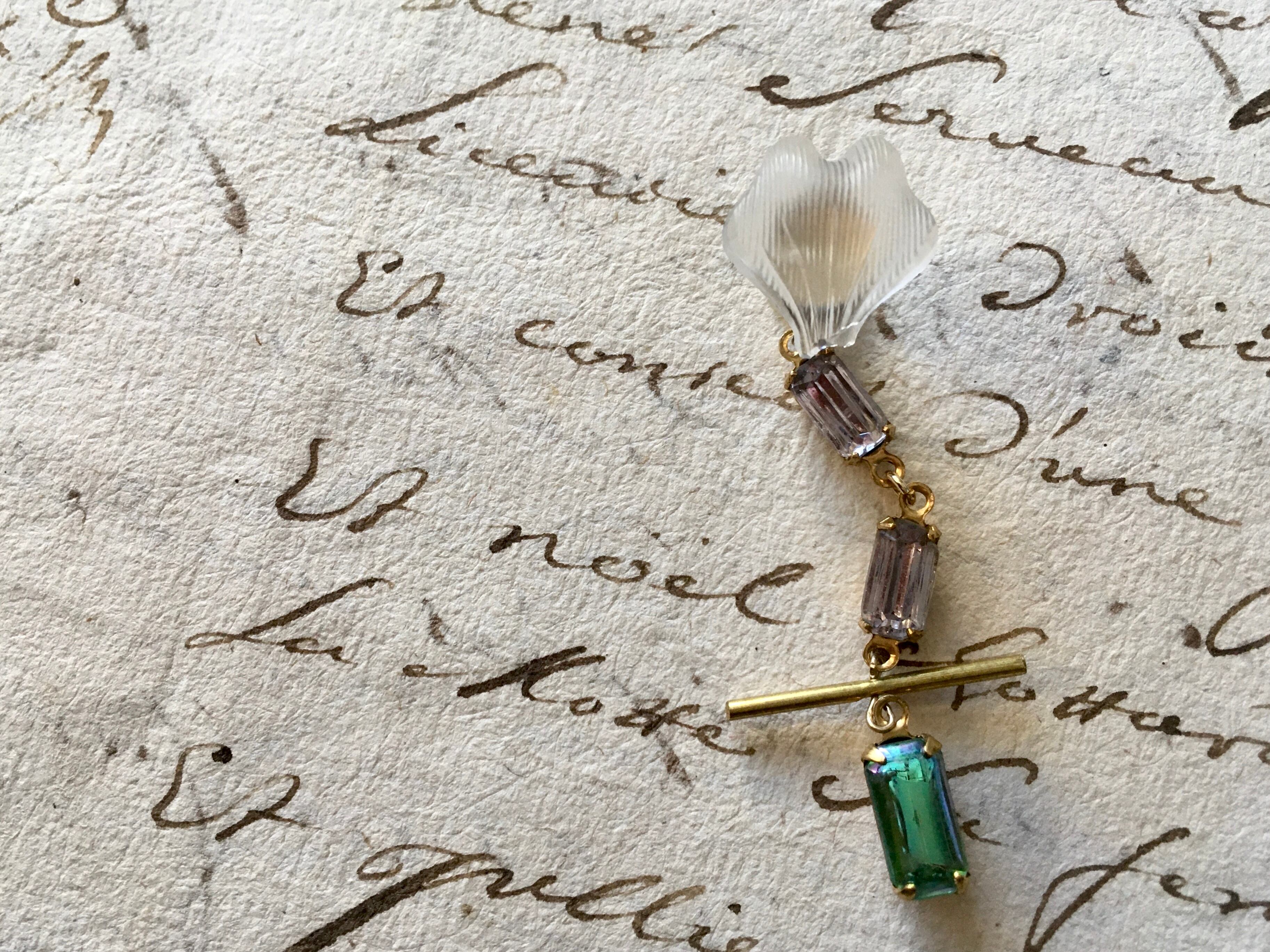 キラキラとしたペールピンクのガラスや不思議なグリーンの光を帯びたガラスに、磨りガラスのカボションや真鍮が上手くまとめ上げ、アンティークな雰囲気を醸し出しています。