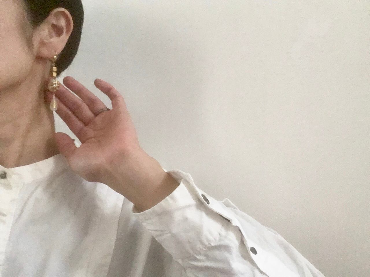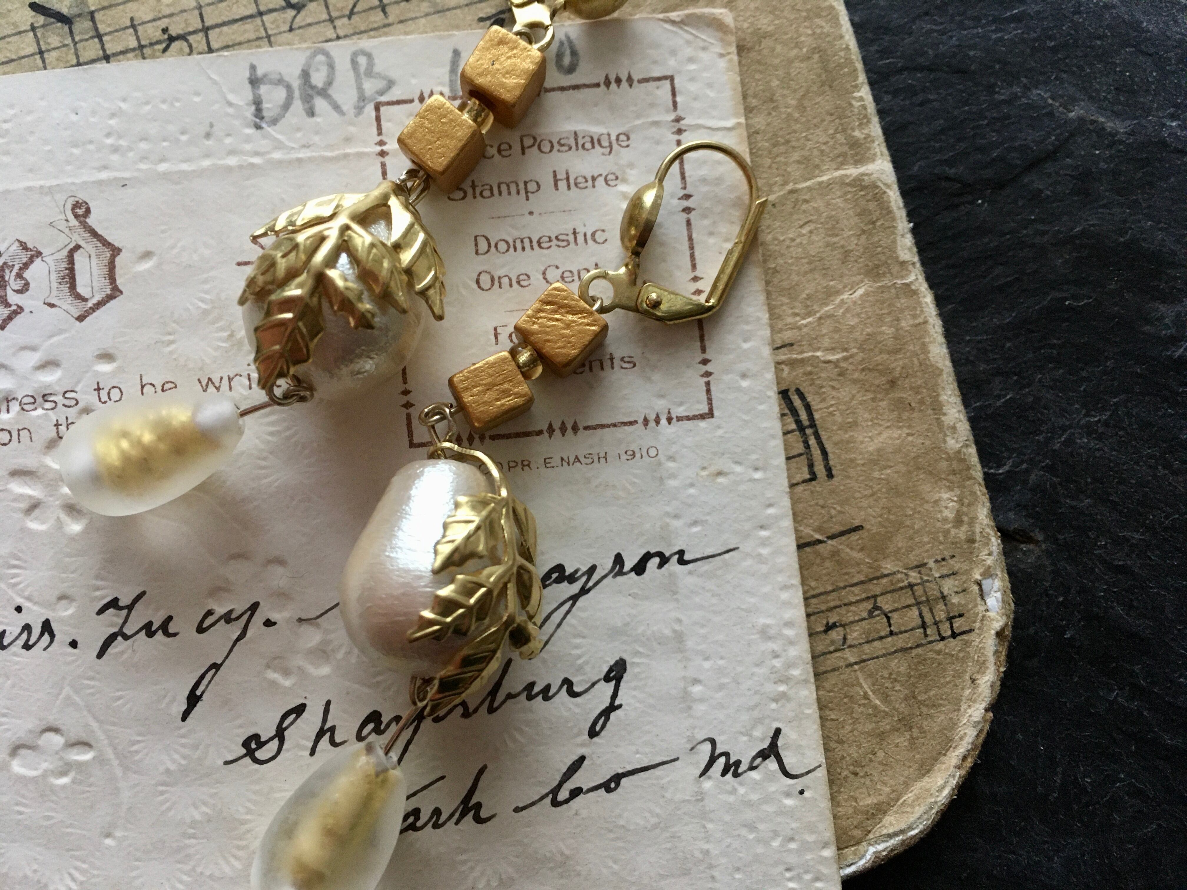 ヴィンテージ真鍮パーツ、コットンパール、ウッドビーズ、ヴィンテージガラスビーズなど、様々な素材を見合わせてピアスに仕上げました。