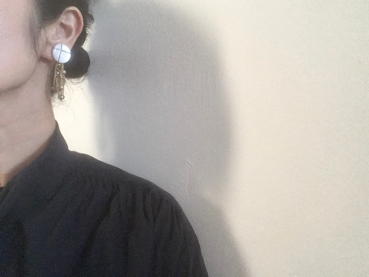 ヴィンテージカボションにヴィンテージパールチェーンを添えて、ピアスに仕上げました。静かで優しい光と、落ち着いた色味が上品な一品です。