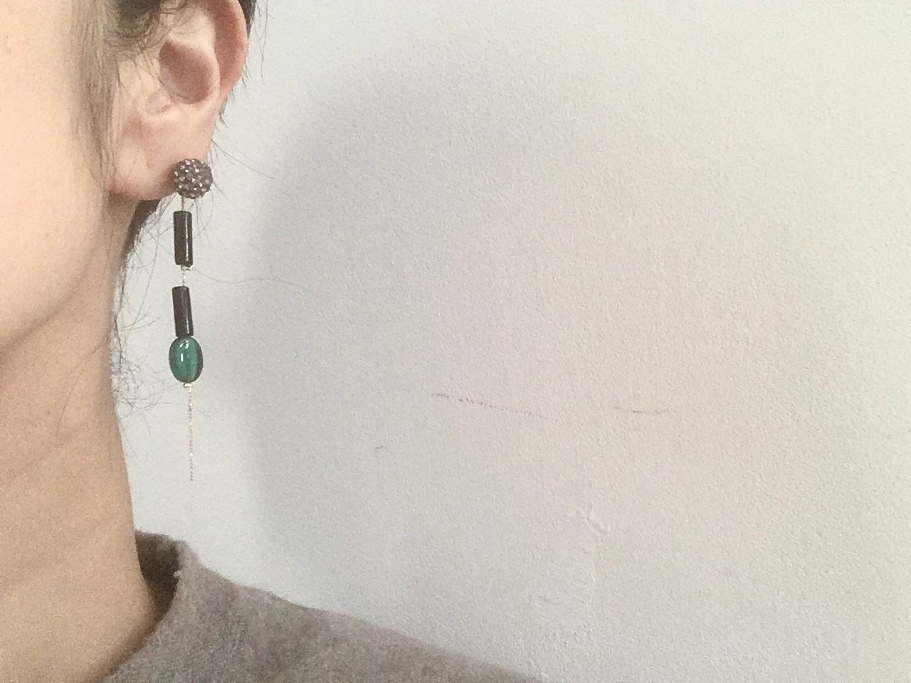 ラインストーンのカボションにオニキスとヴィンテージビーズを添えて、ピアスに仕上げました。