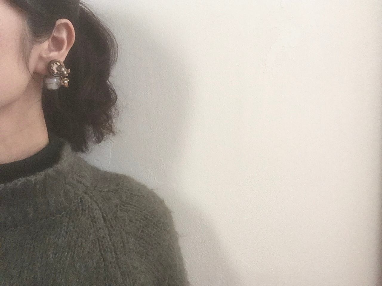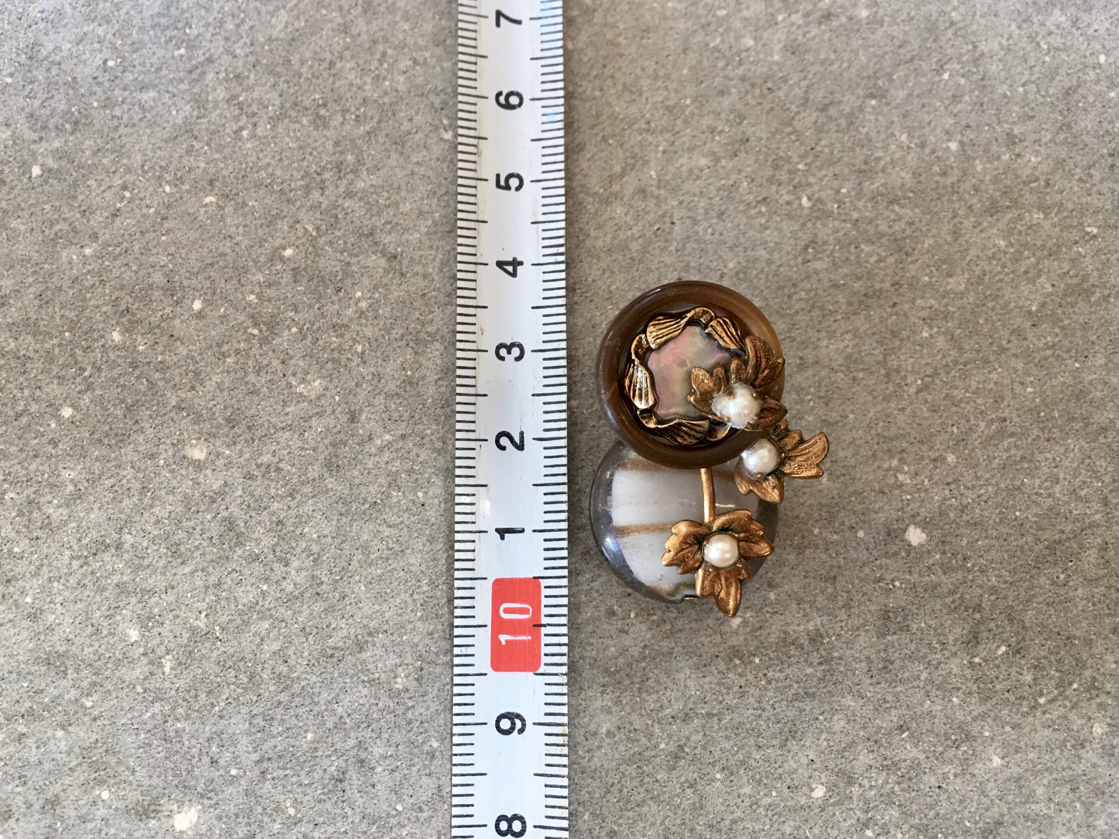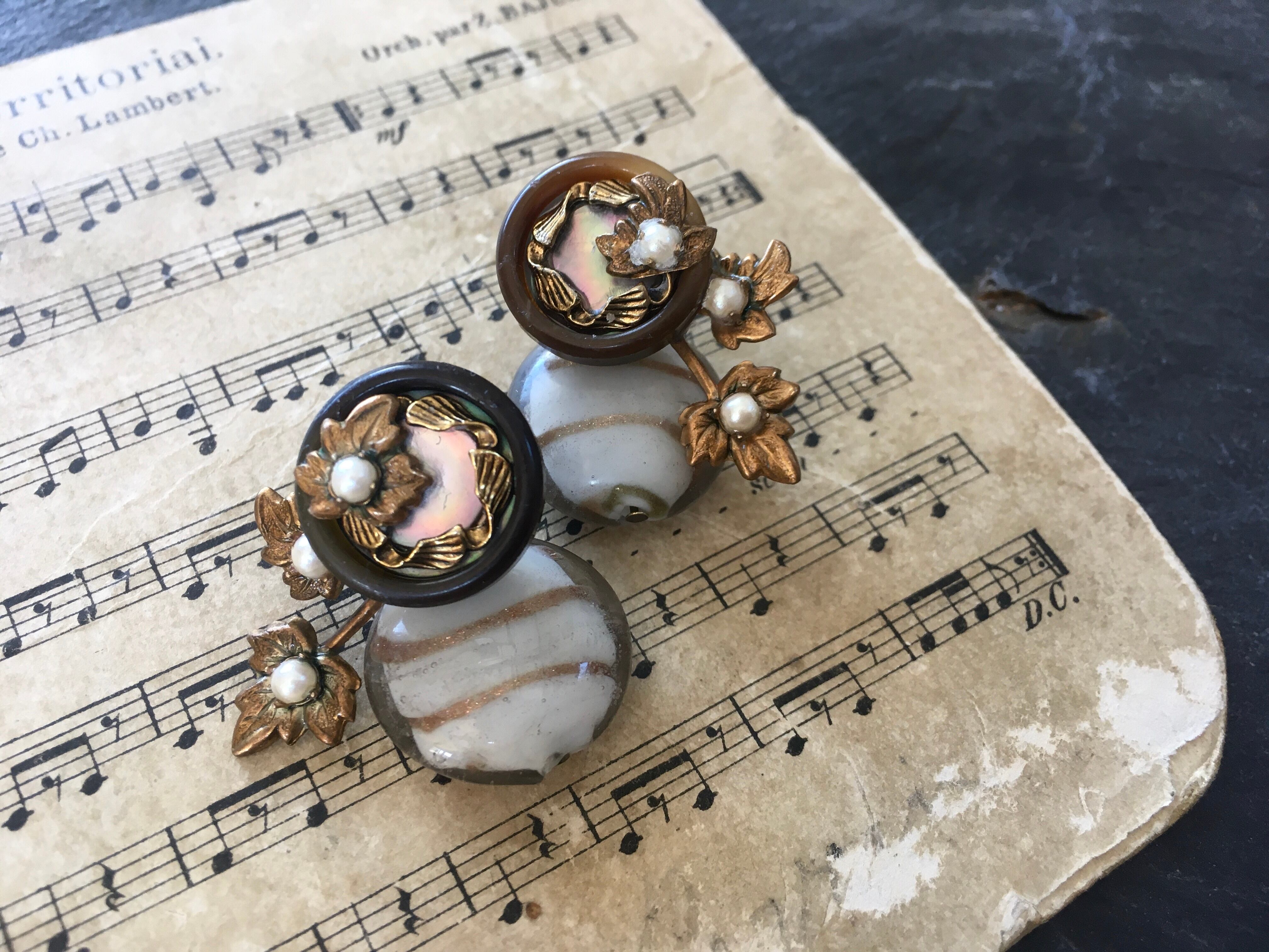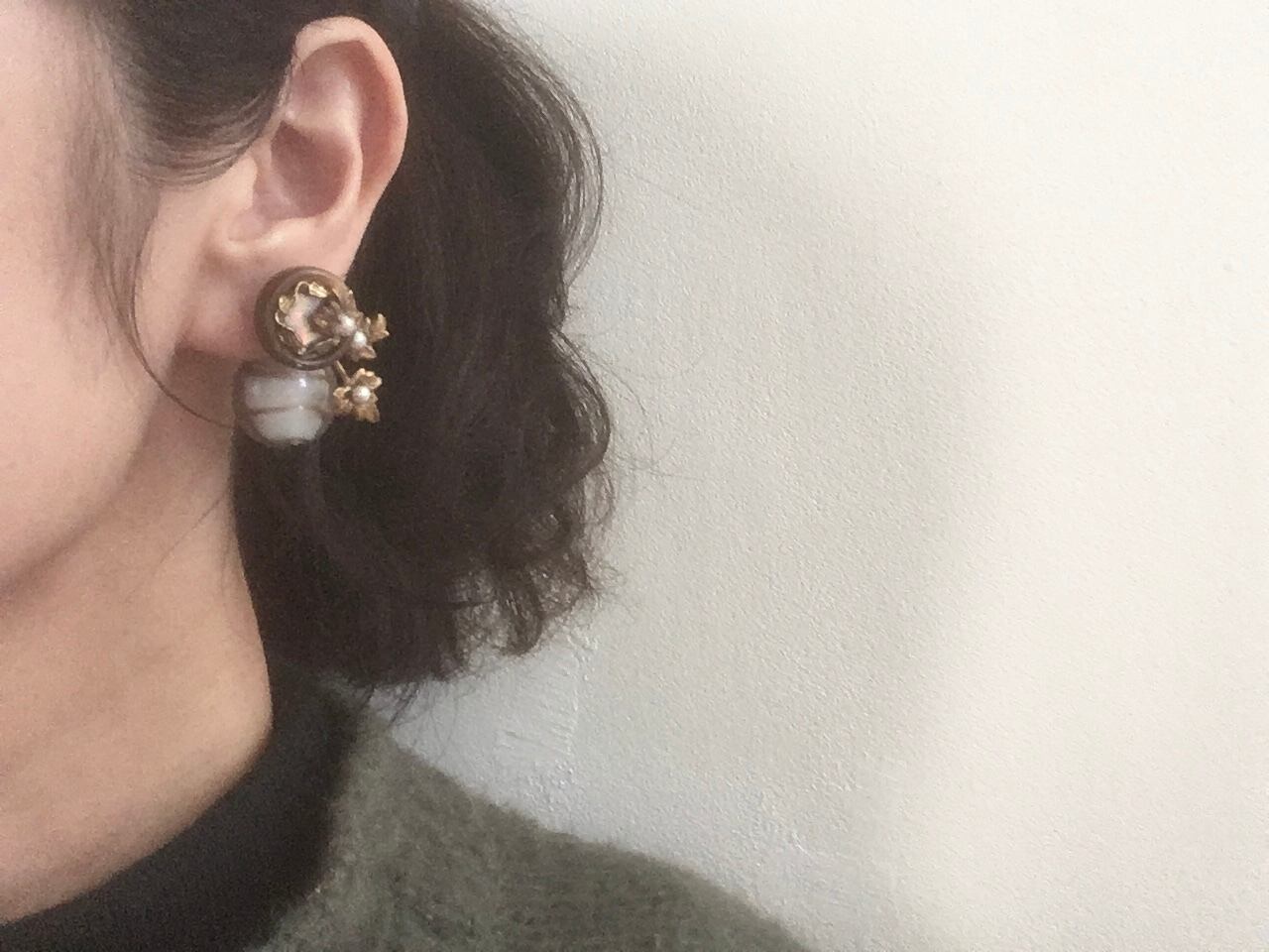 ヴィンテージボタンに真鍮パーツ、ヴィンテージビーズを添えてピアスに仕上げました。