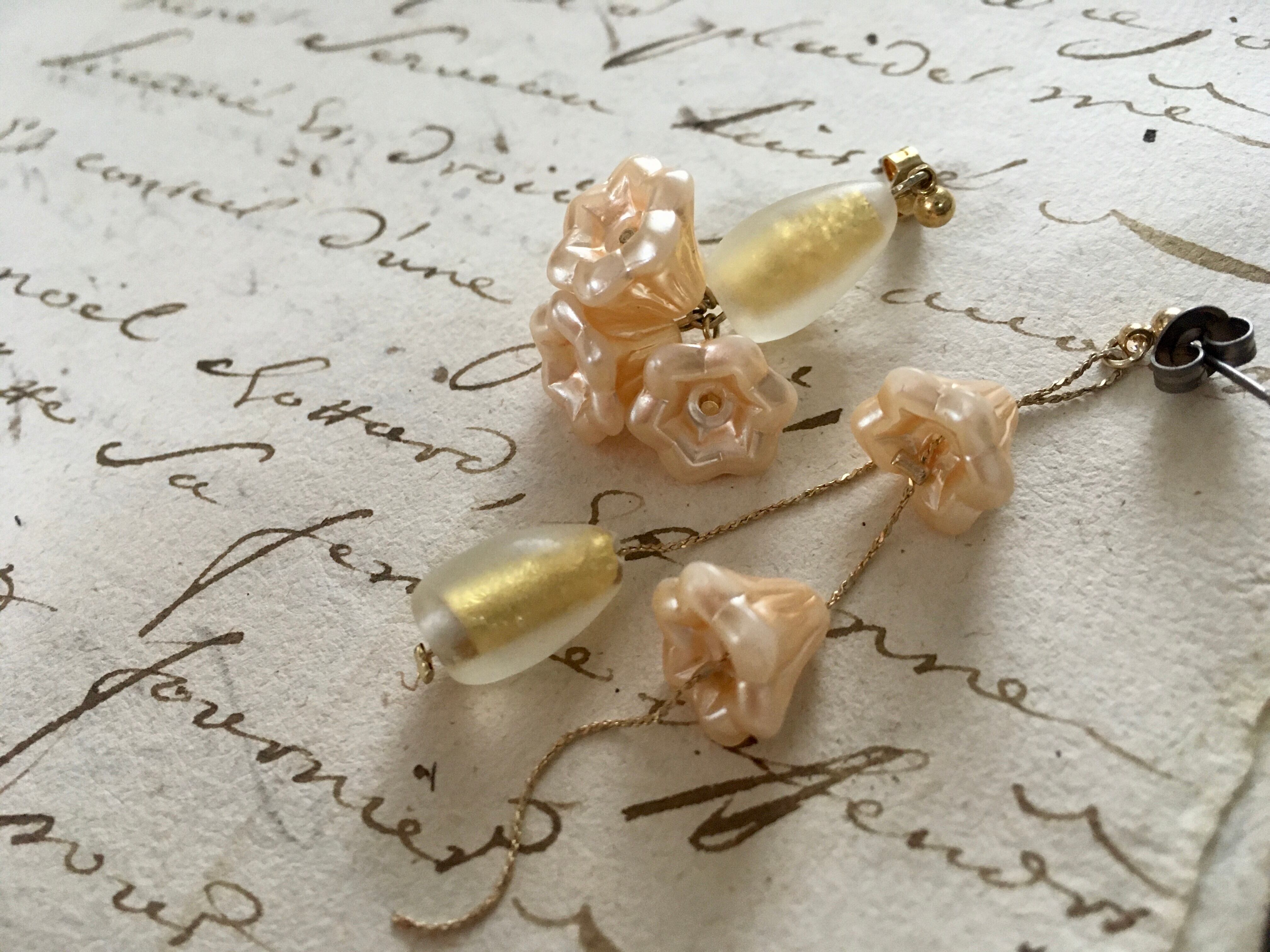 かわいらしいお花のヴィンテージビーズに、ゴールドの磨りガラスを添えて、柔らかく耳元を飾ります。