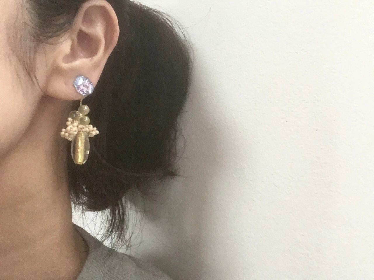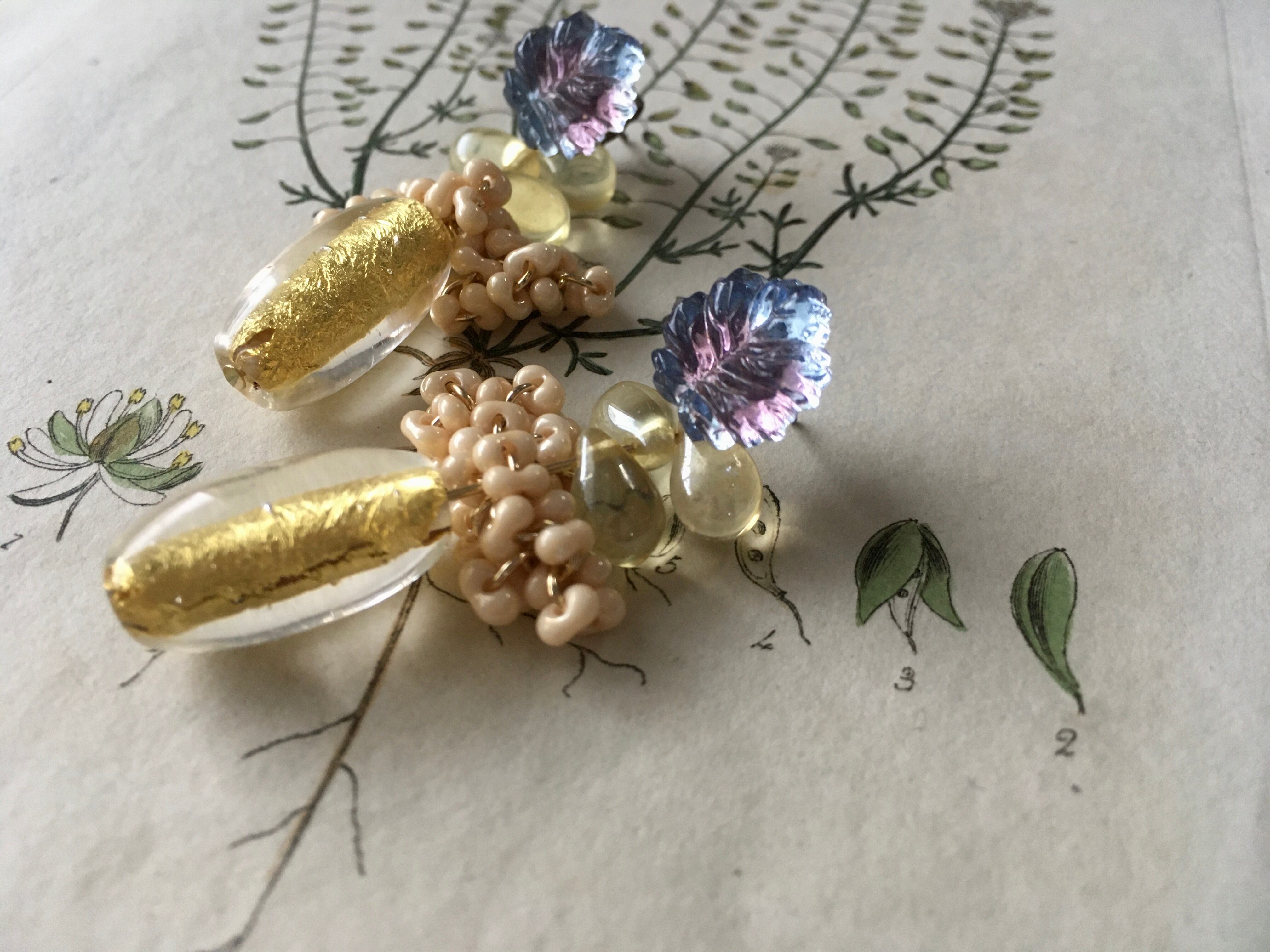 ヴィンテージパーツやヴィンテージガラスビーズ、チェコガラスビーズなどを組み合わせてピアスを作りました。