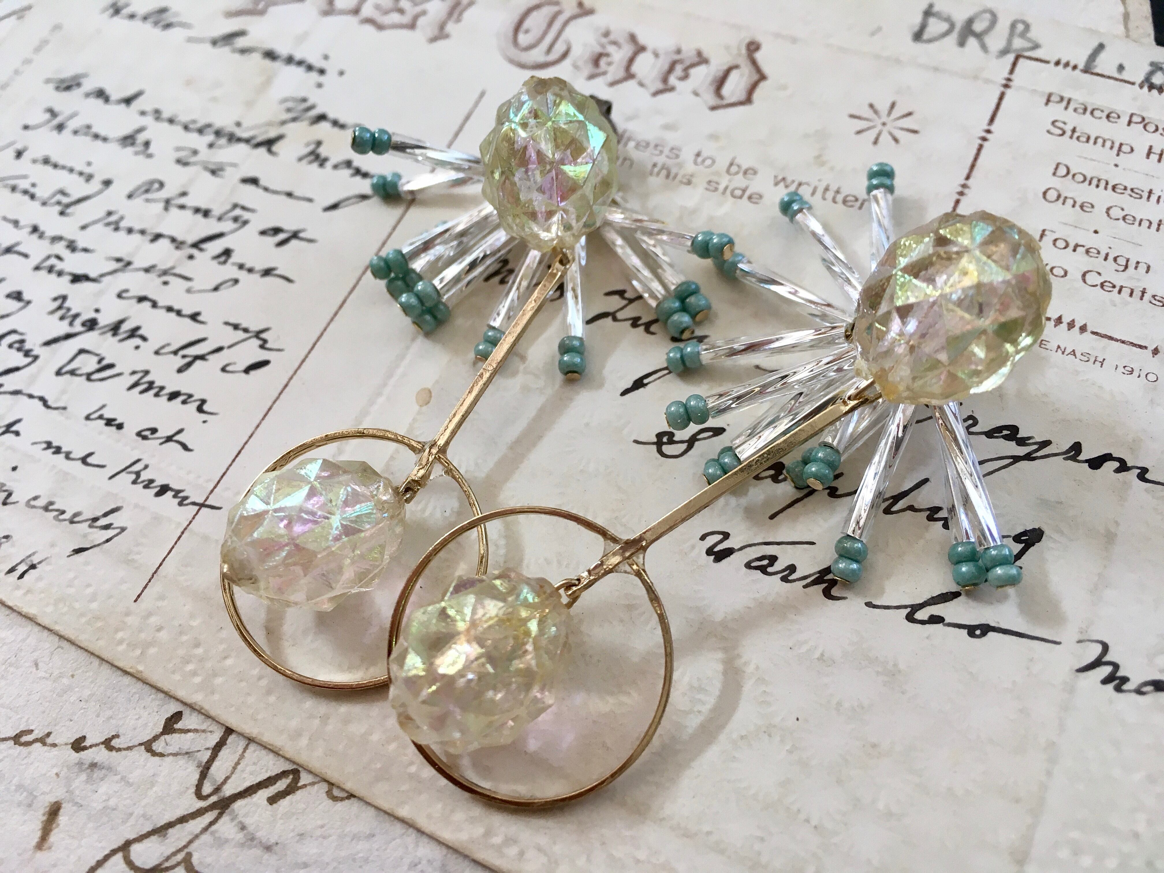 ヴィンテージビーズやガラスチューブ、メタルパーツを使ってピアスに仕上げました。