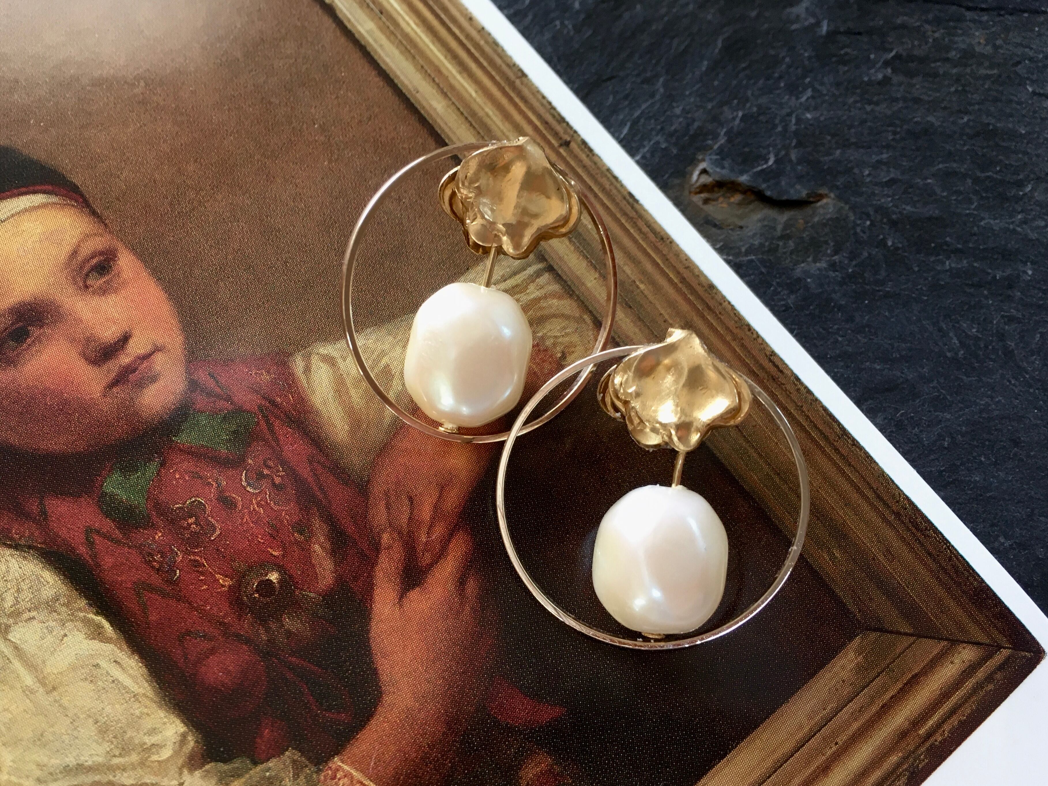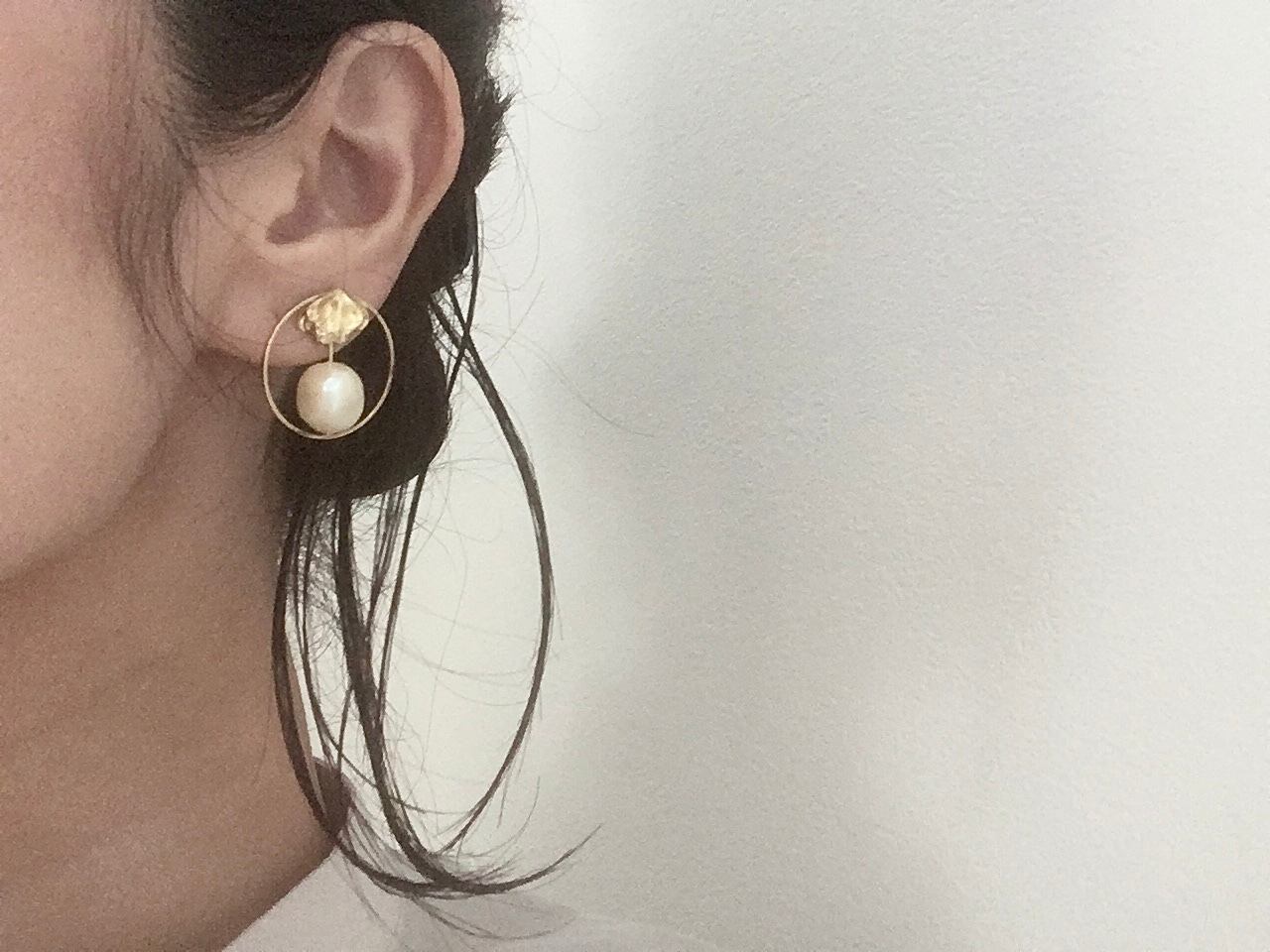 メタルパーツ、ヴィンテージパーツ、ヴィンテージパールビーズを組み合わせて、ピアスを作りました。