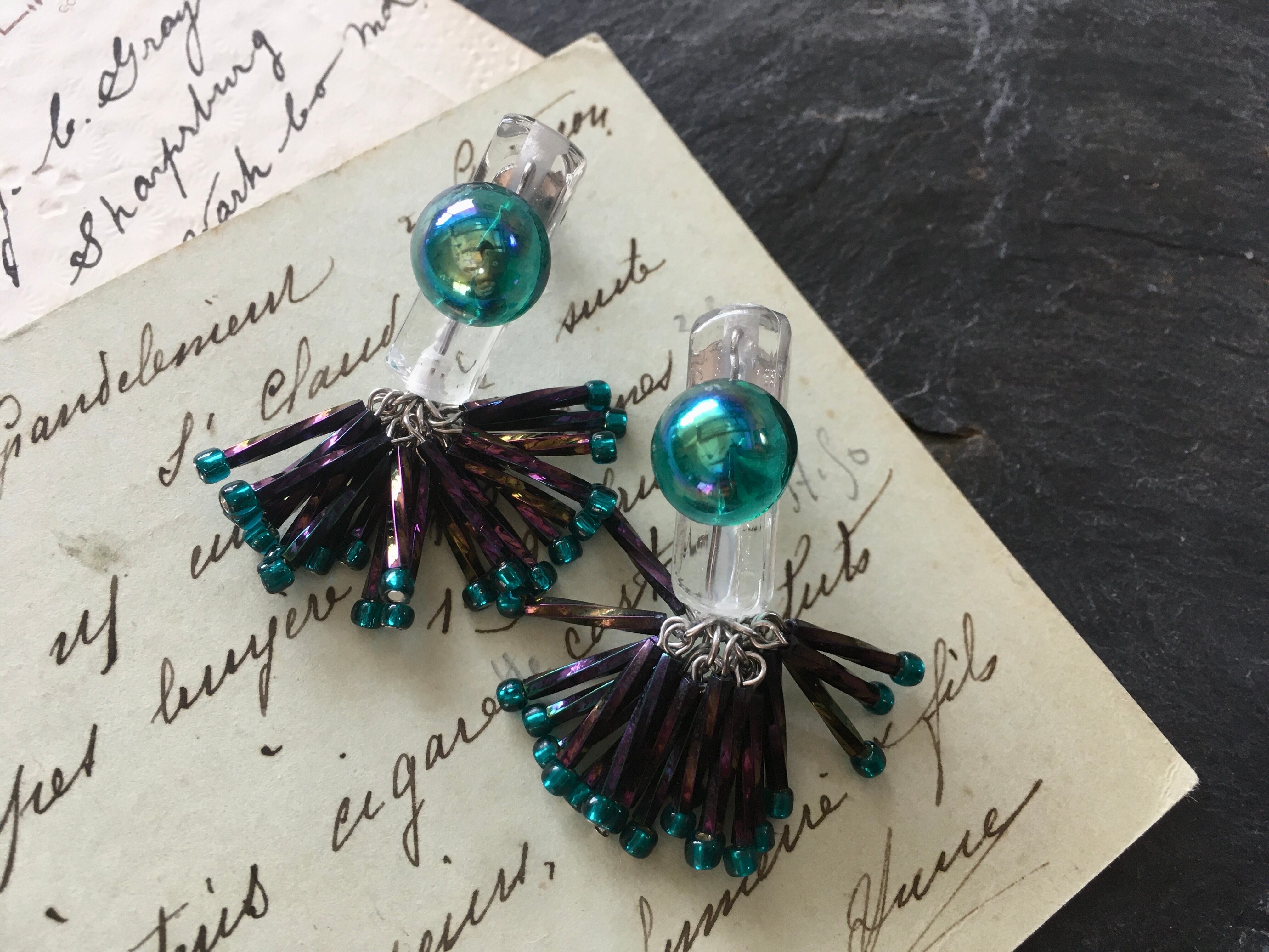 ヴィンテージビーズ、ヴィンテージパーツ、ガラスチューブを組み合わせてピアスを作りました。