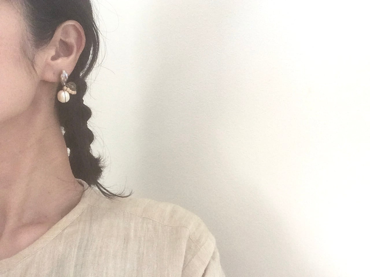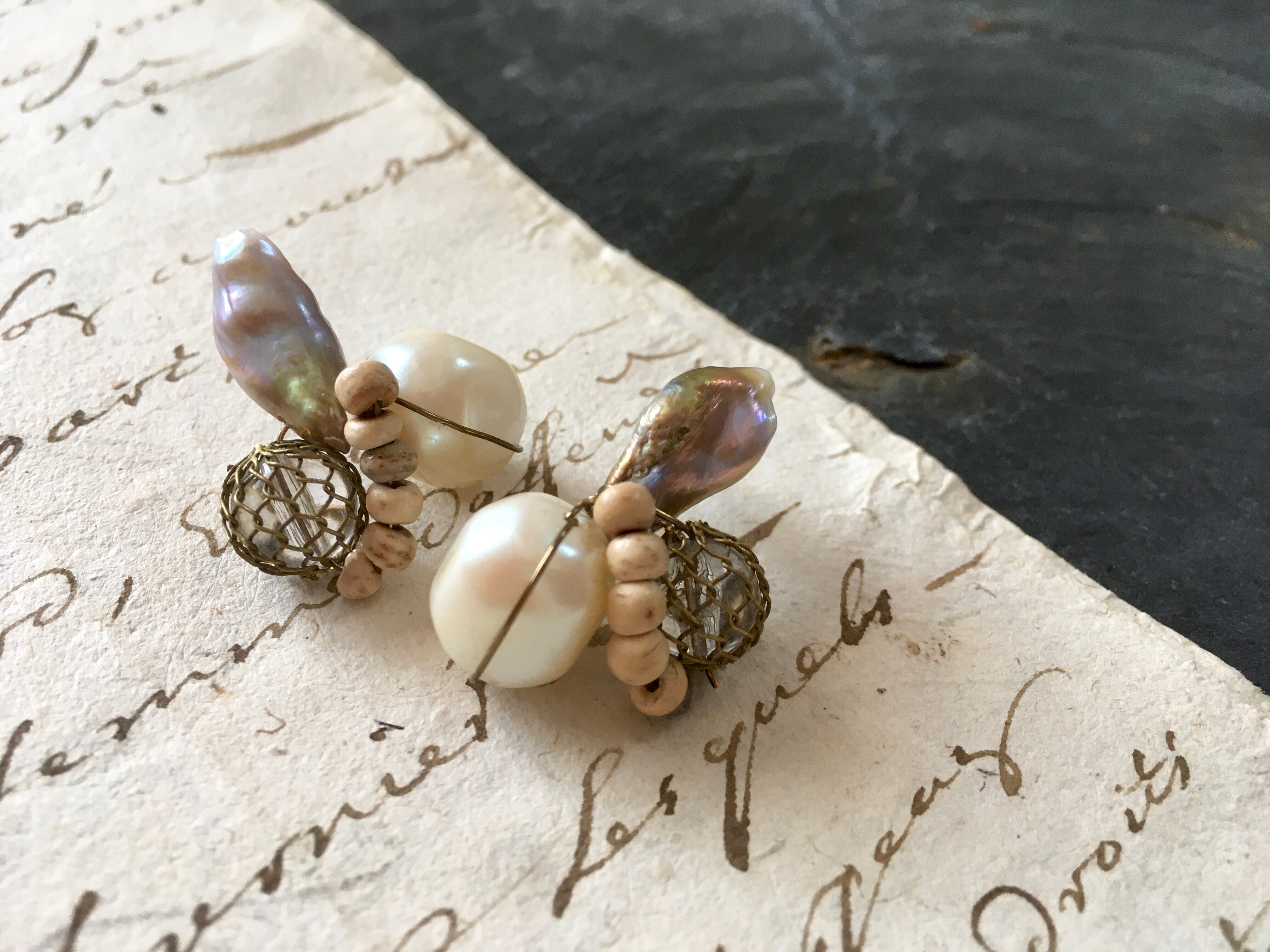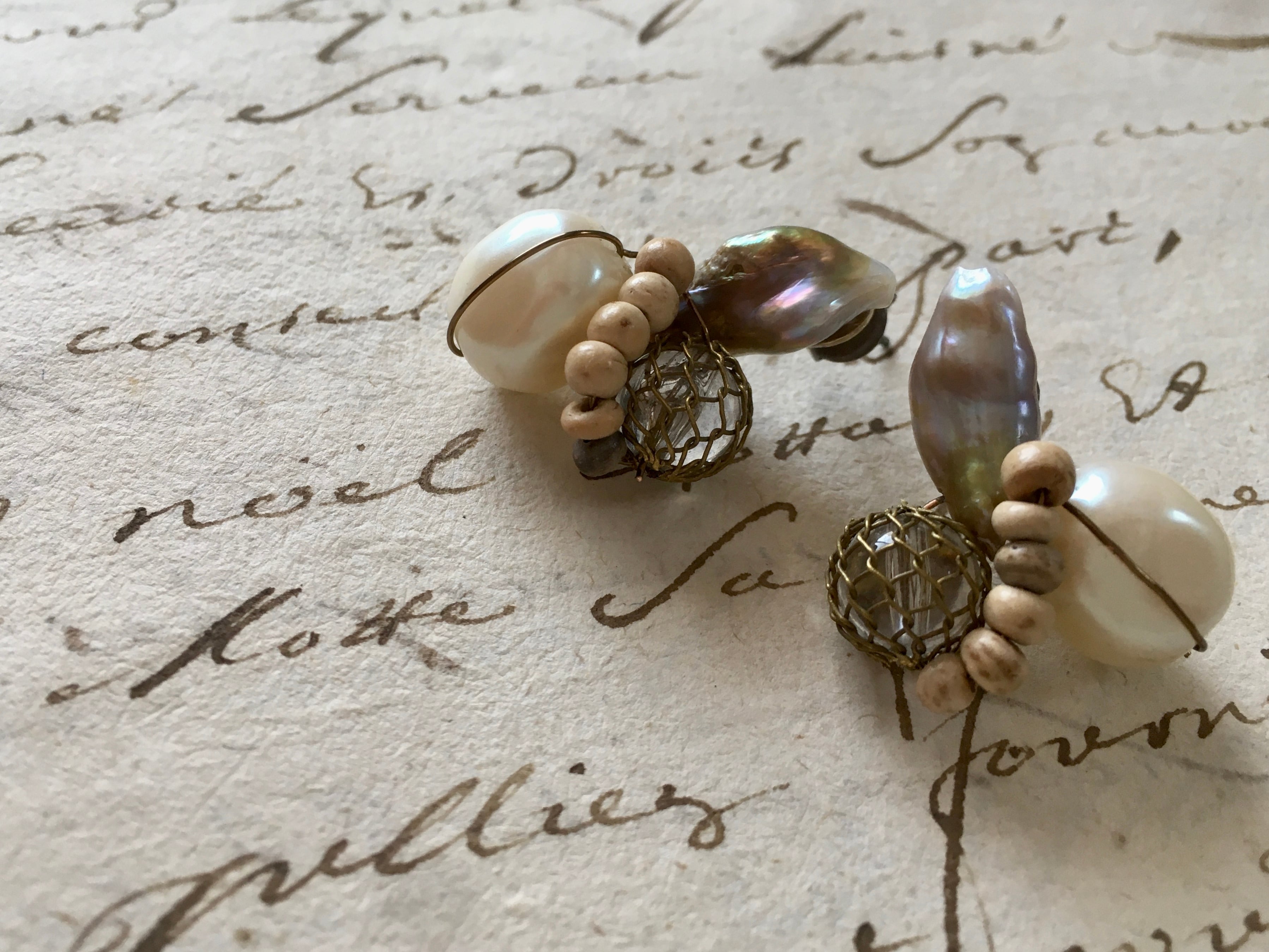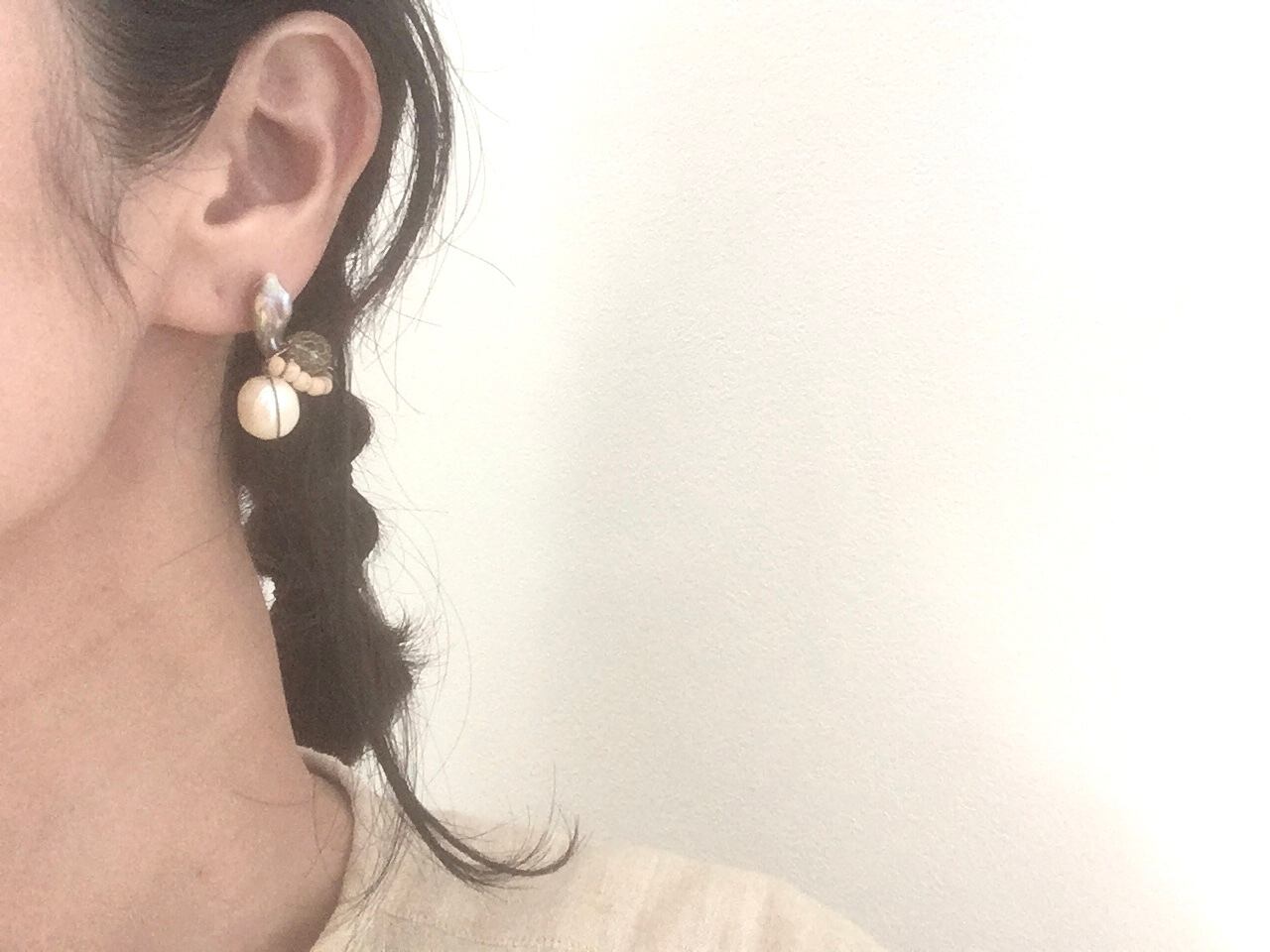 淡水パール、ヴィンテージビーズ、ウッドビーズなど、様々な素材を掛け合わせてピアスに仕上げました。