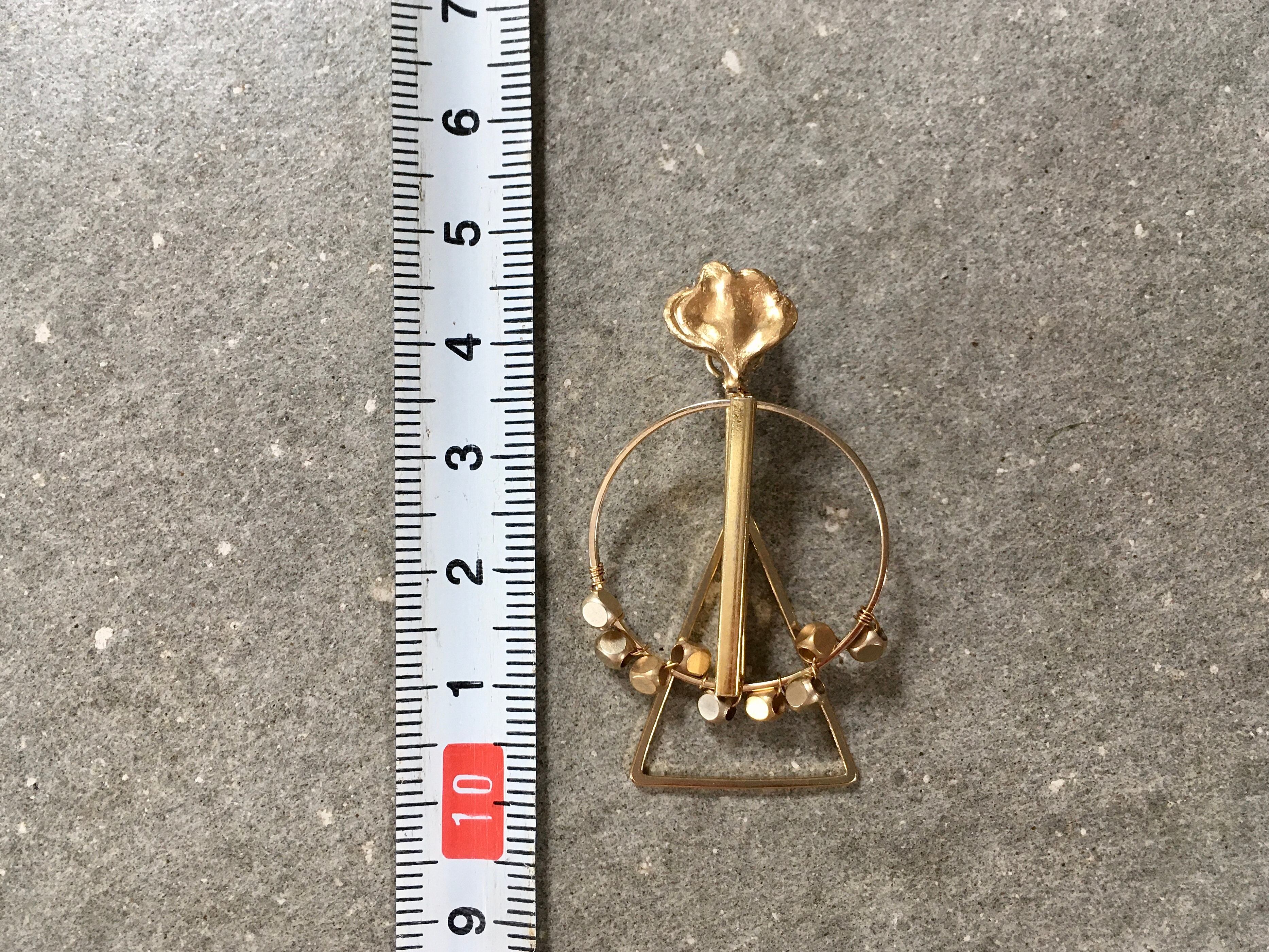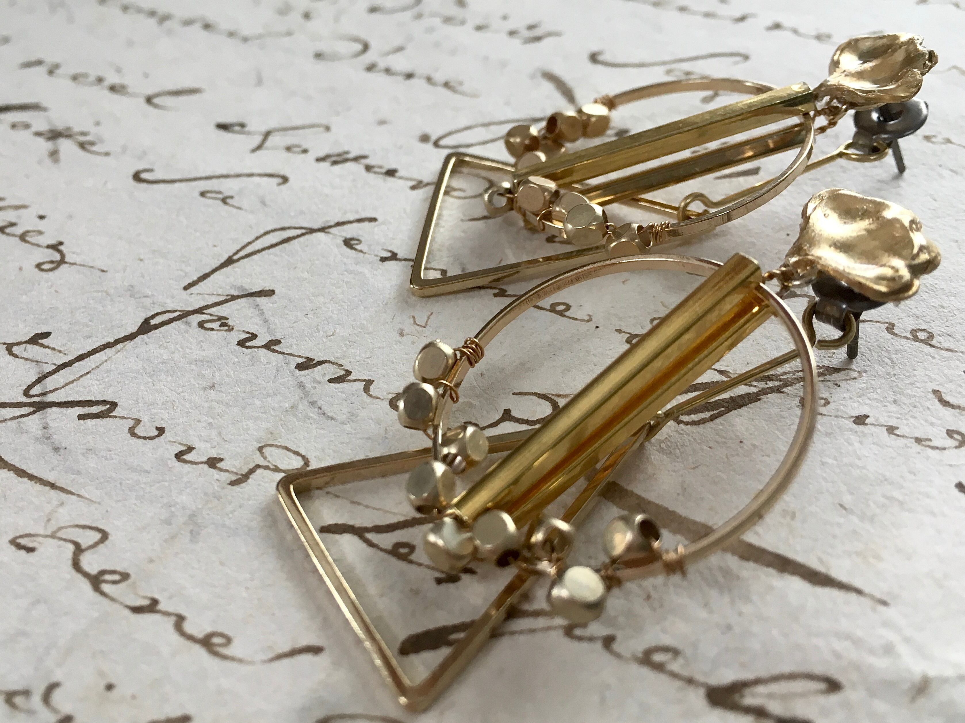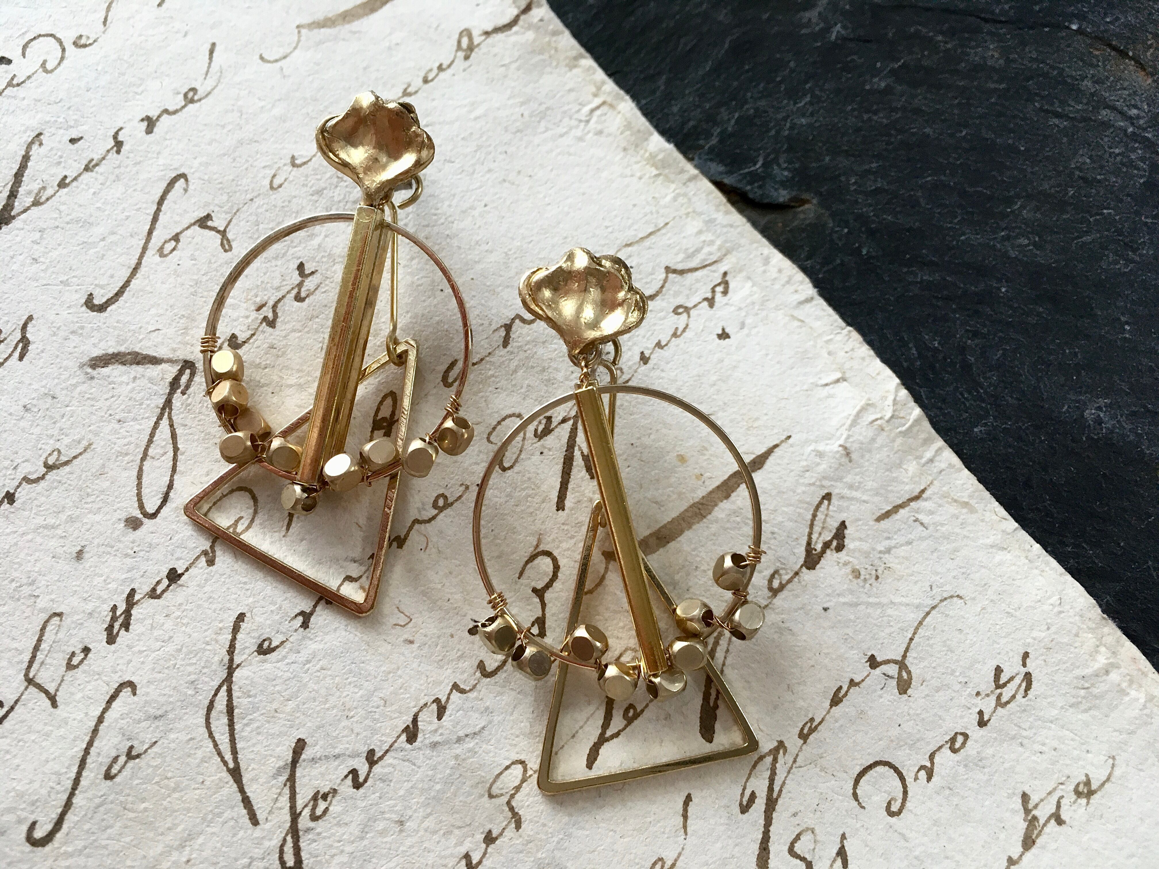 ヴィンテージパーツに○と△のメタルパーツを組み合わせてピアスに仕上げました。