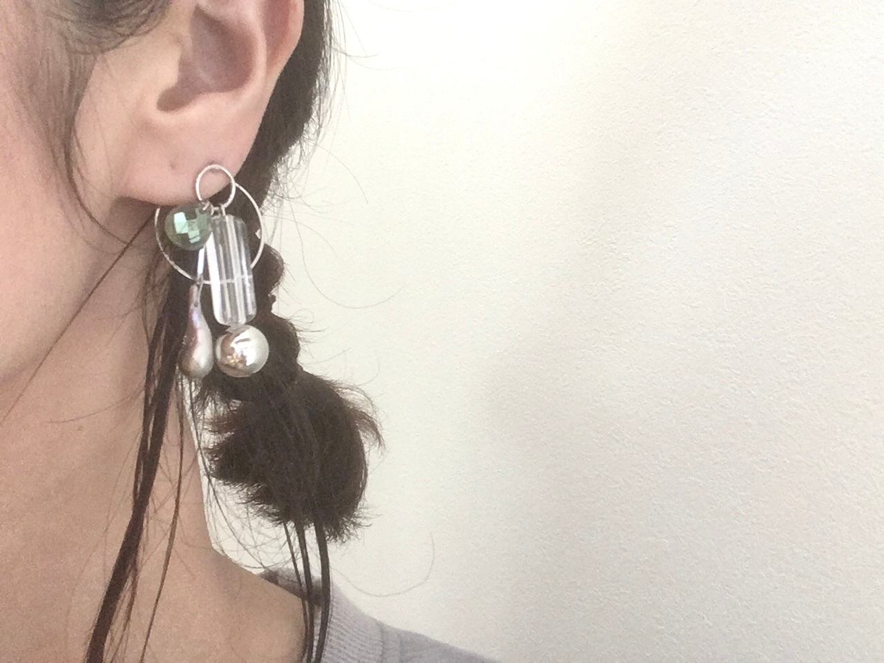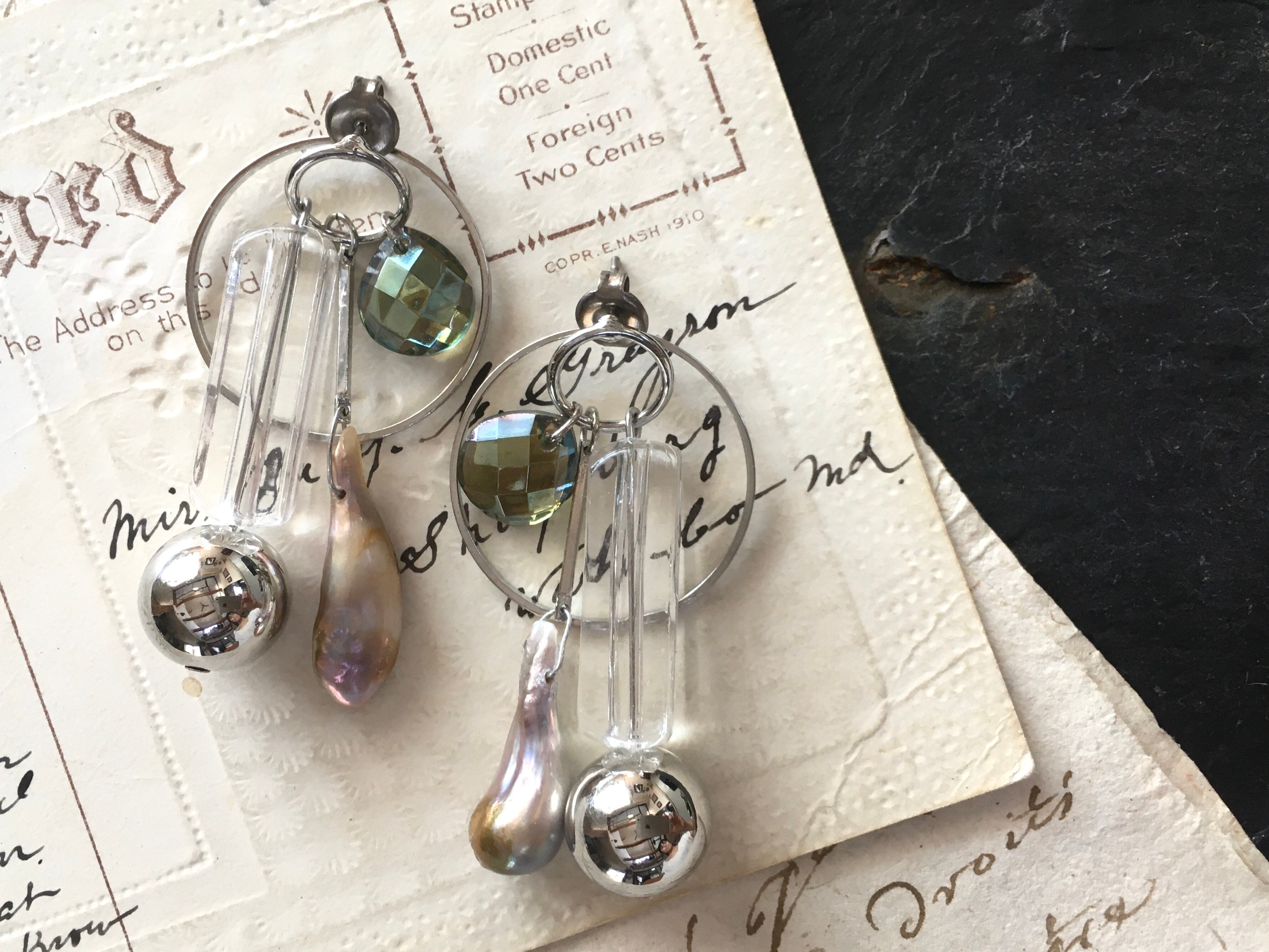 ヴィンテージビーズ、淡水パール、チェコガラス、メタルパーツなど、様々な素材を使ってピアスに仕上げました。