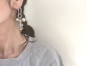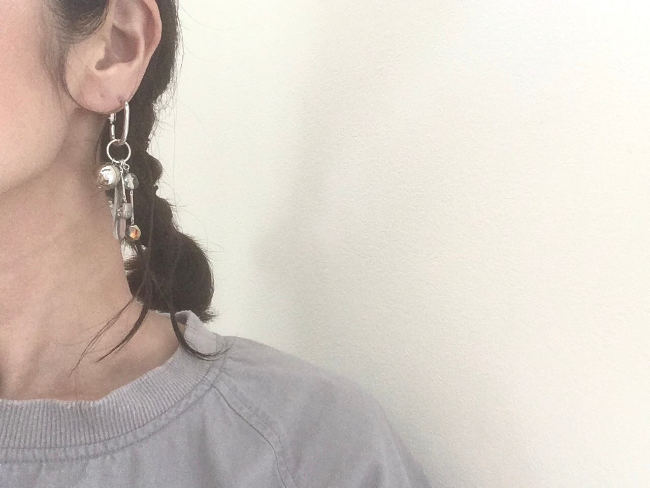 独特な光を放つヴィンテージビーズ、クリアなドロップシェイプのヴィンテージビーズ、大きめのメタルビーズなど、個性豊かなビーズをお楽しみ頂けますが、取り外してシンプルなピアスとしてもお使い頂いたり、片耳にのみボリュームをつけアシンメトリーピアスとして、より一層の個性を感じて頂ける事も可能です。