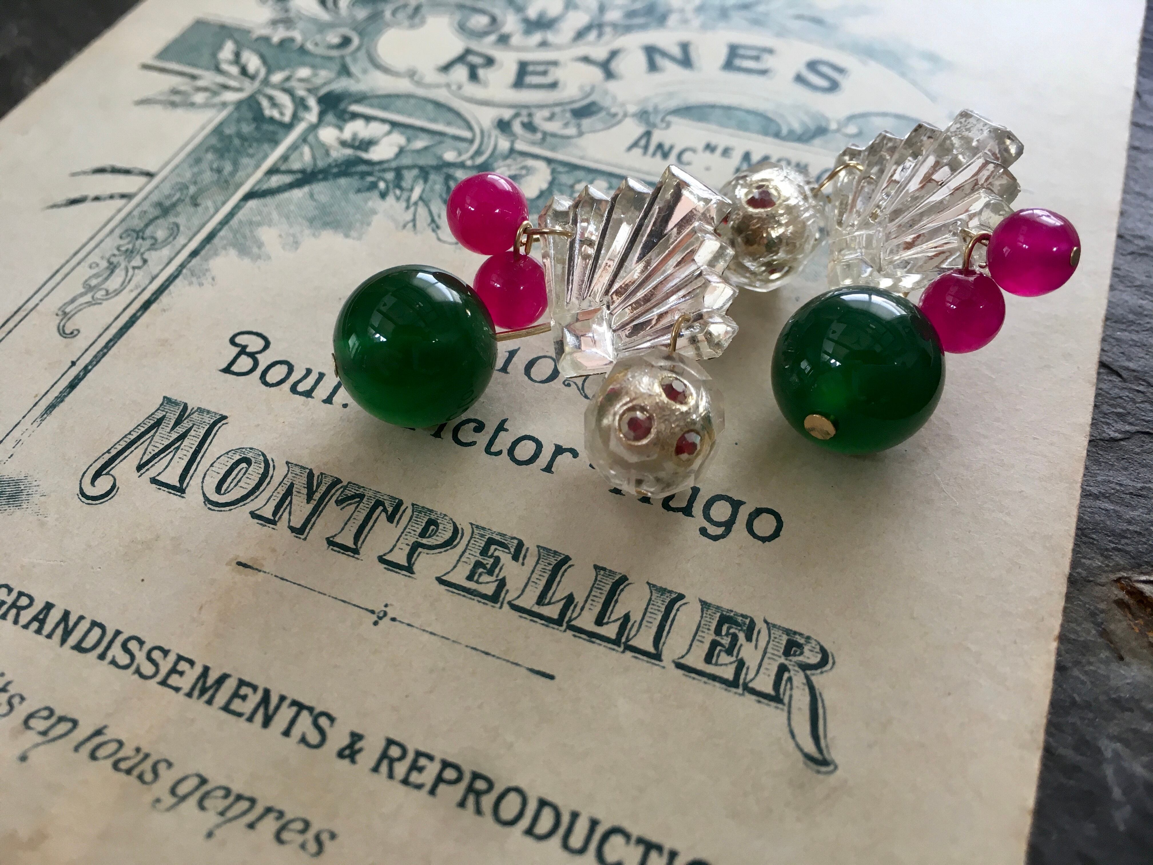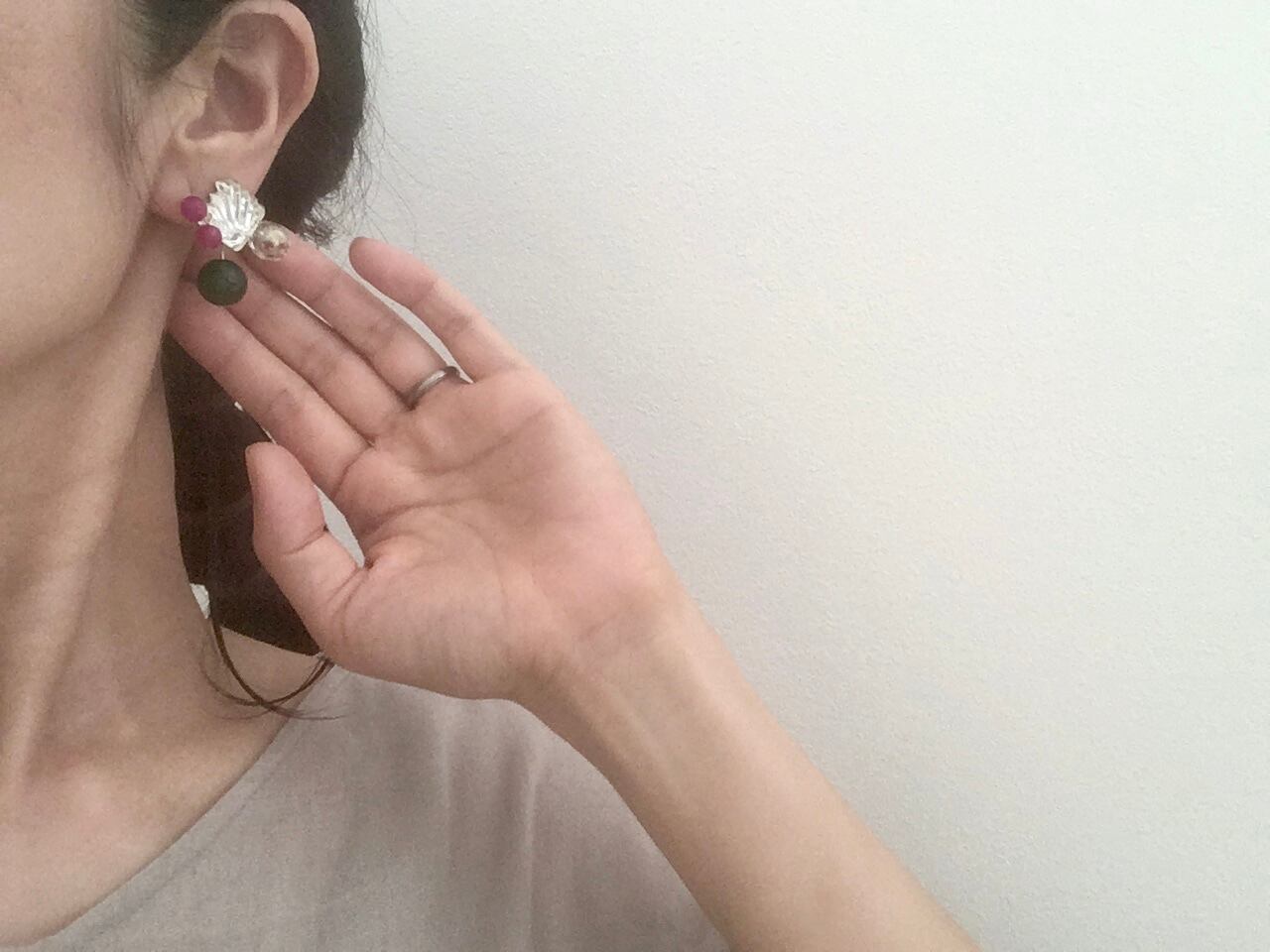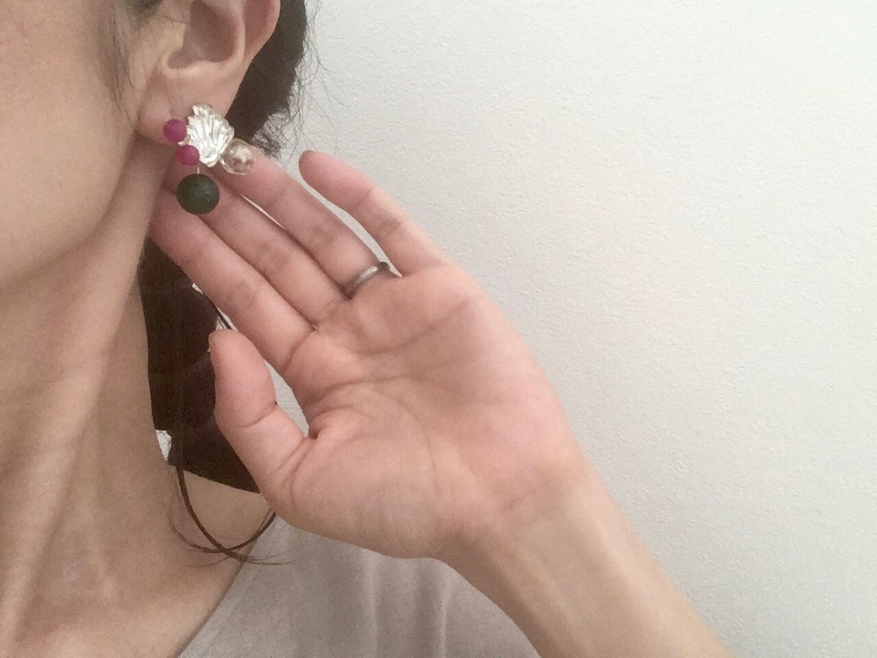 天然石のビビットなピンクとグリーンが、大人っぽい雰囲気の中に可愛らしさを演出しています。