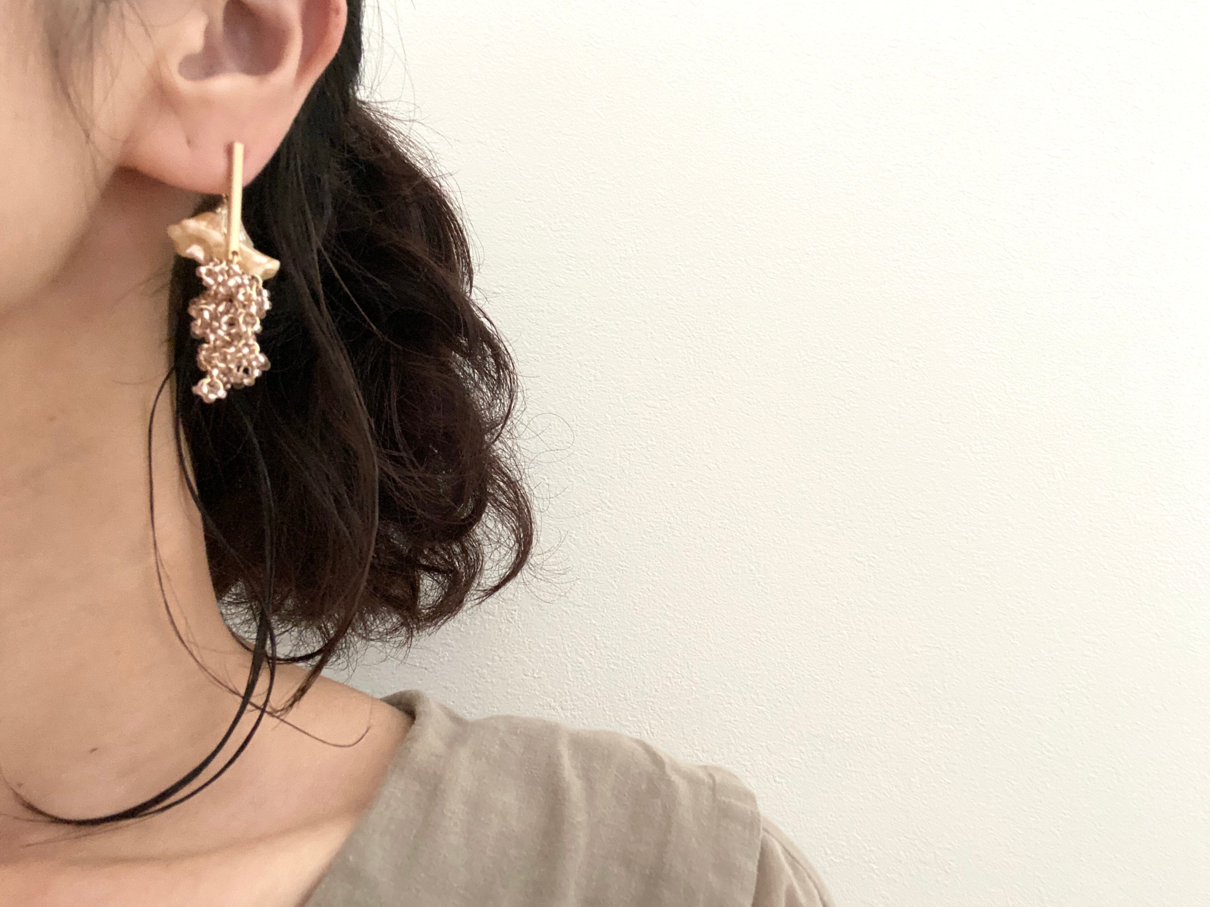 ヴィンテージビーズのミルキーなアイボリーカラーと、シードビーズの透明感溢れるシャンパンピンクのビーズが高相性で、デザイン的にも大人の可憐な雰囲気を感じさせる一品です。