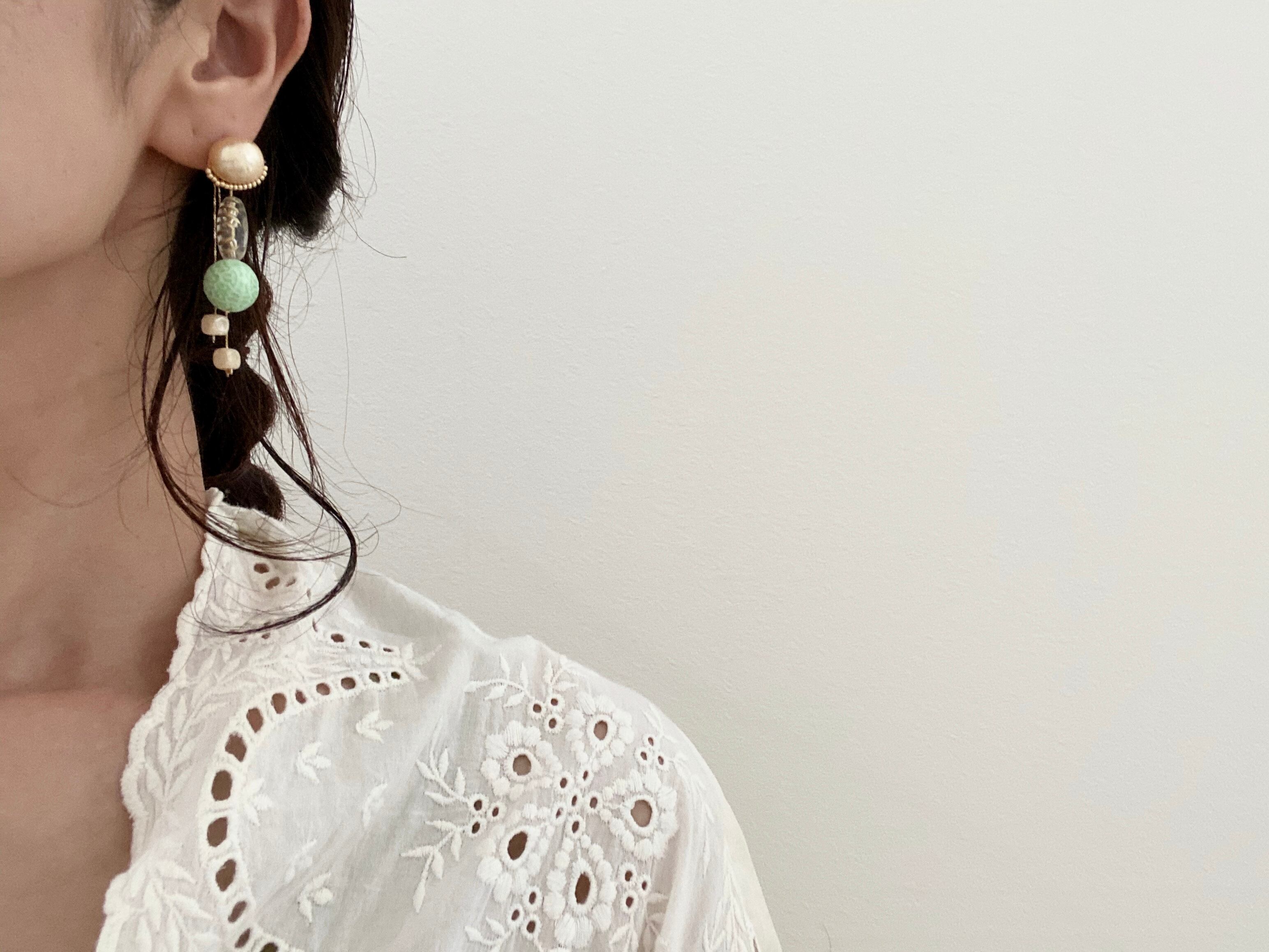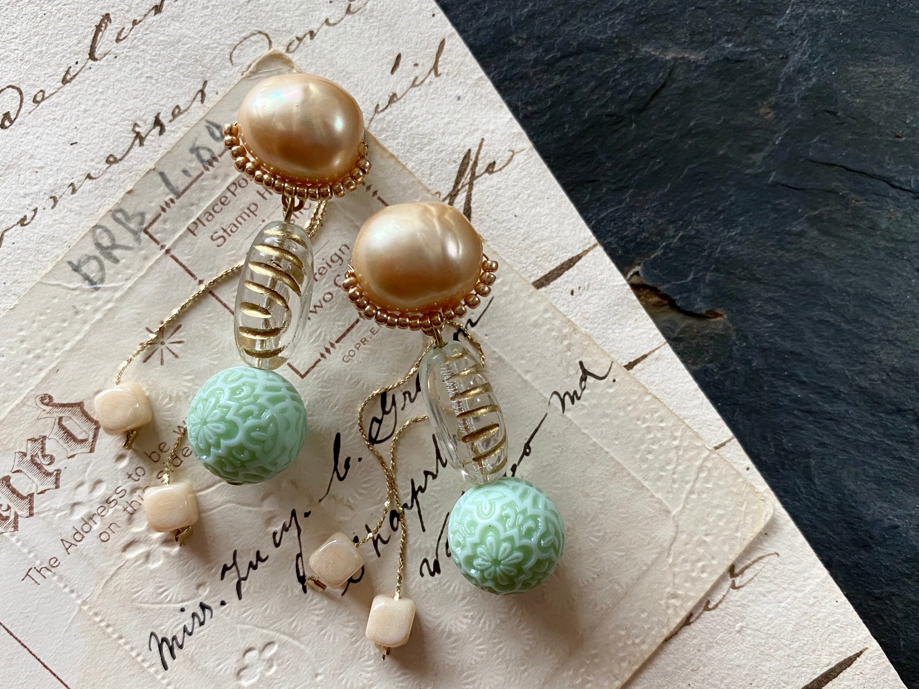 アンティークガラスパールにヴィンテージビーズ、チェコガラスビーズなど、様座な楚材を組み合わせて、ピアスを作りました。