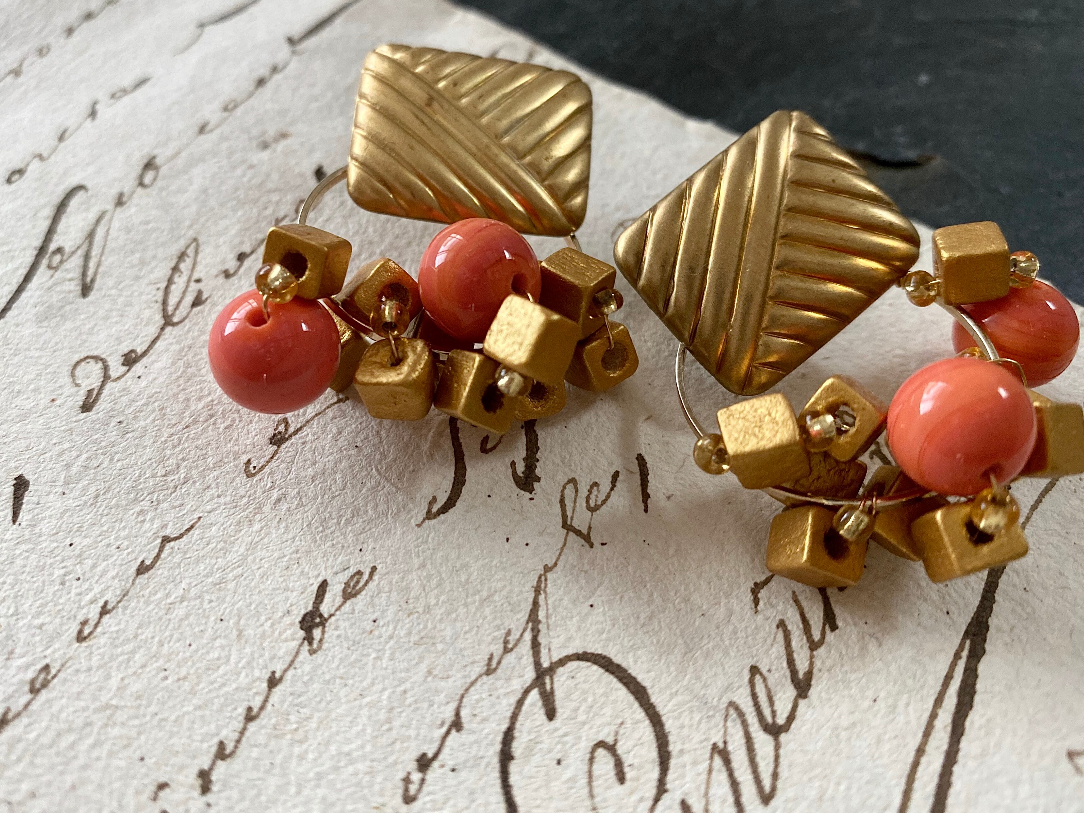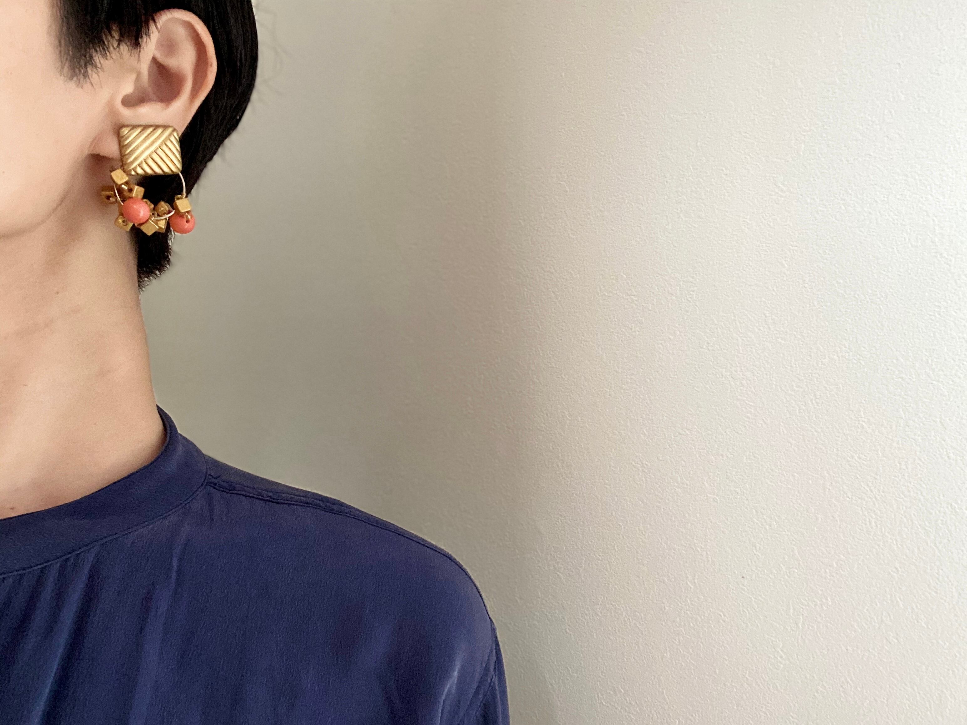 クラシカルな雰囲気の真鍮に、ゴールドのヴィンテージウッドビーズを纏わせ、アクセントとして珊瑚カラーのヴィンテージガラスビーズを添えました。