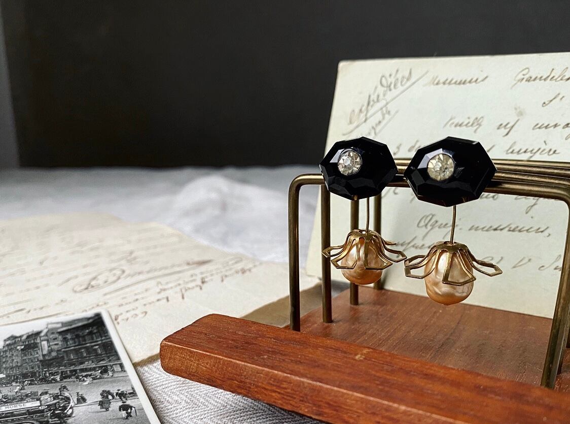 ヴィンテージボタンをカボションに、真鍮パーツとヴィンテージガラスパールを組み合わせてピアスを作りました。
