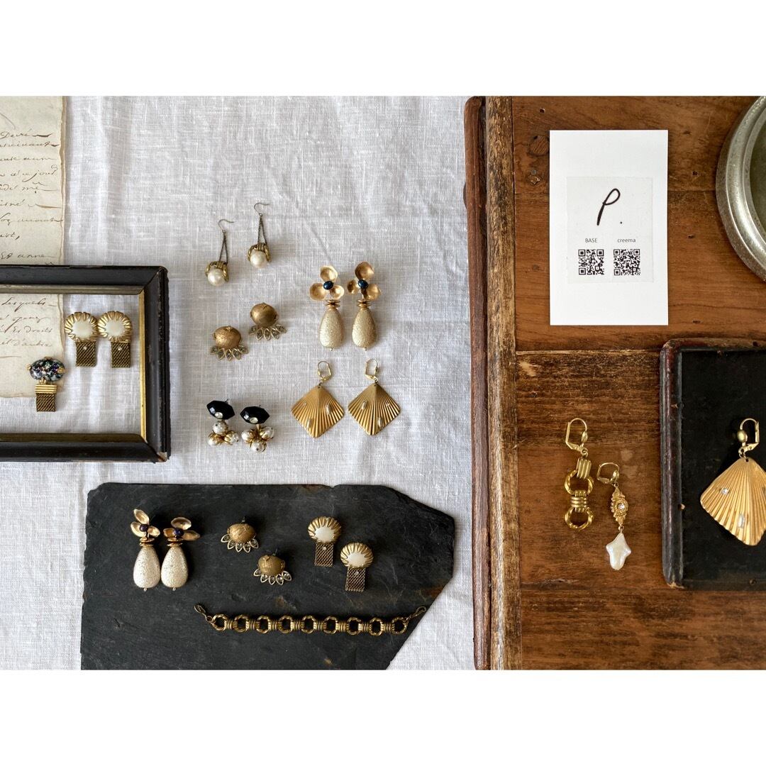 真鍮パーツに散らしたヴィンテージ ガラスビーズは、雨や水粒のイメージです。