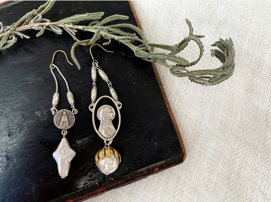 ヴィンテージのメダイパーツや淡水パールなどを組み合わせて、アシンメトリーなピアスを作りました。