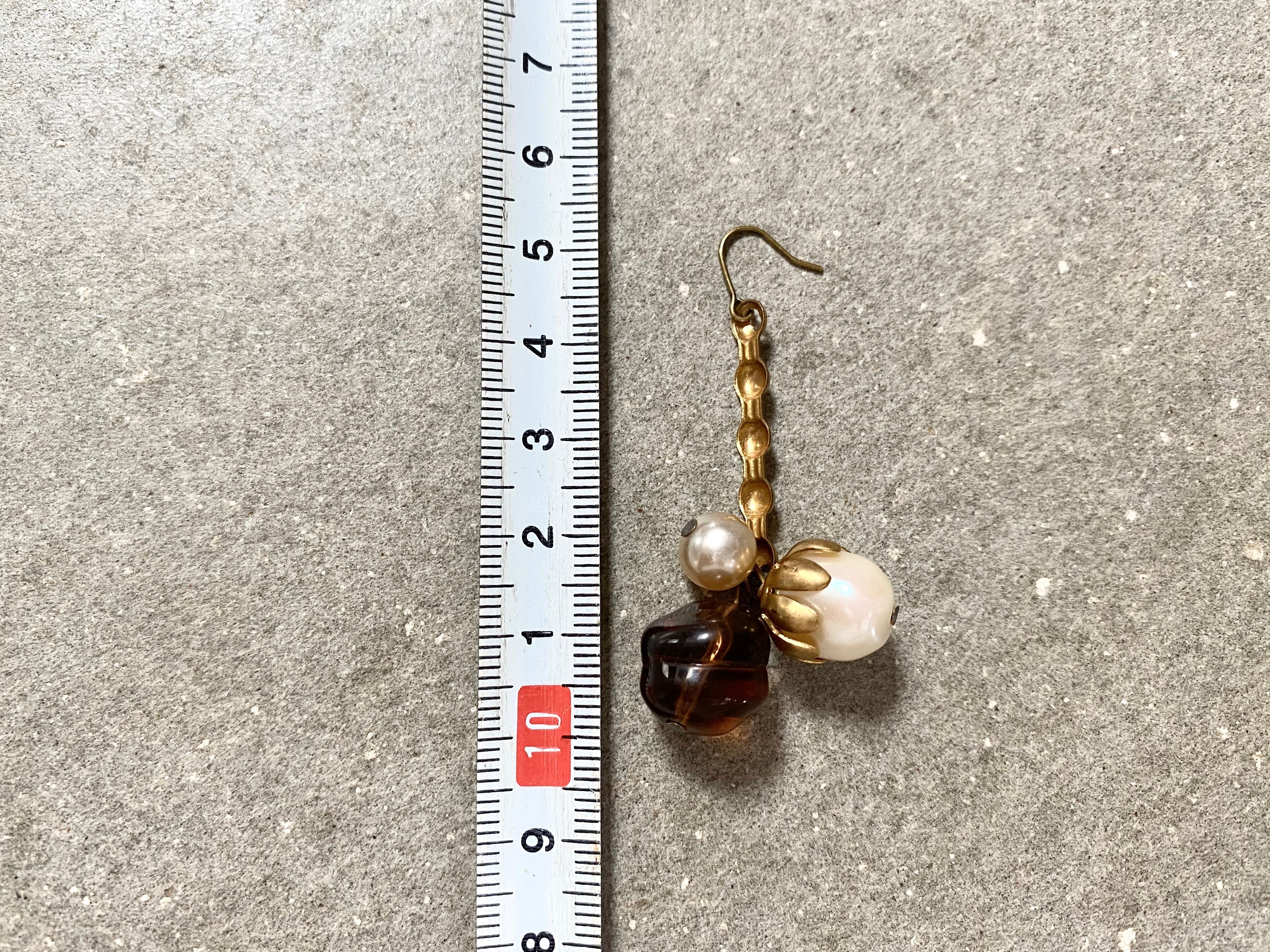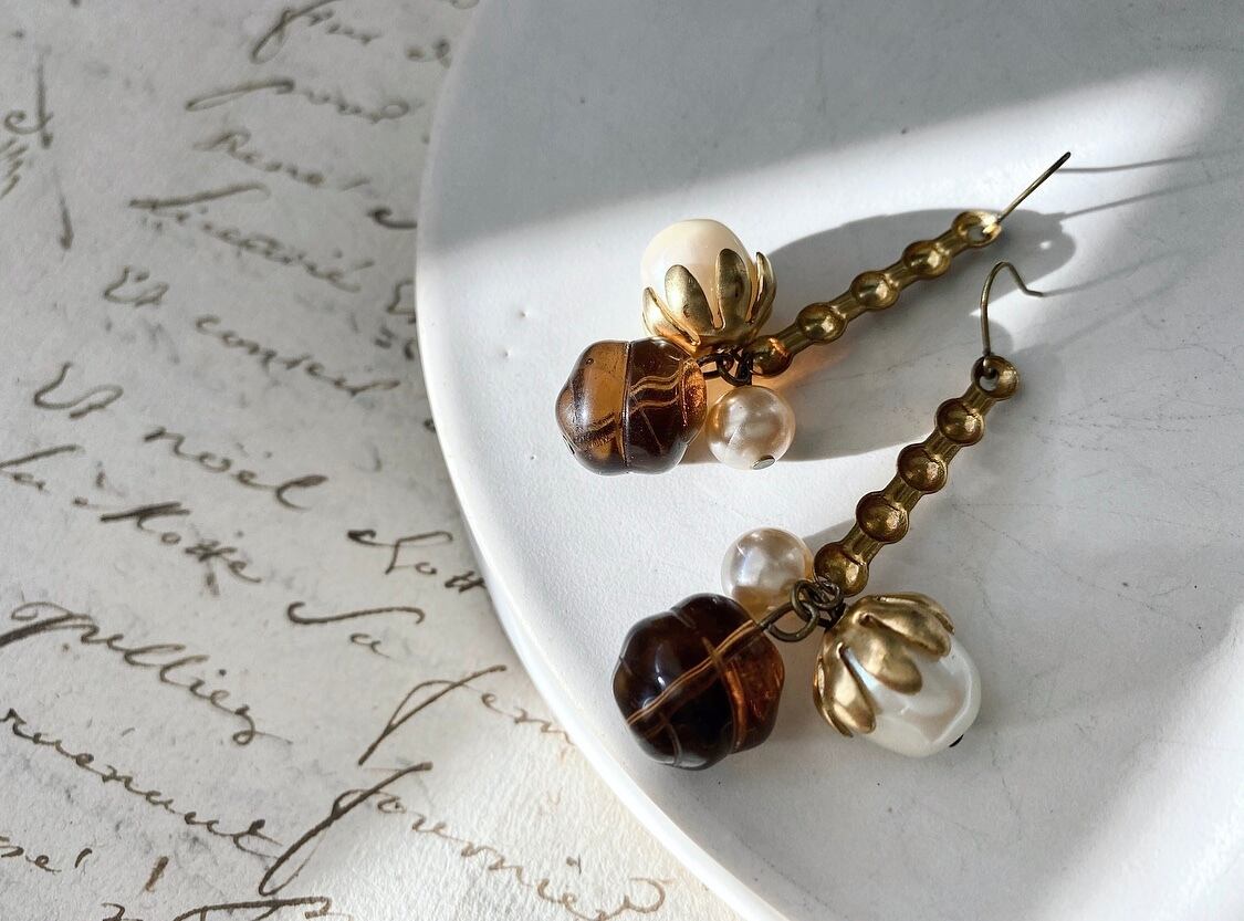 ヴィンテージビーズ、パール、真鍮などを組み合わせて、ピアスを作りました。