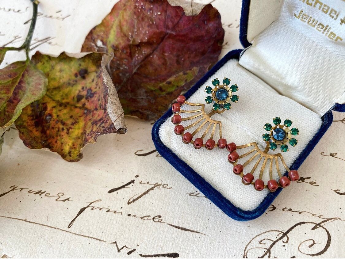 ヴィンテージ真鍮パーツ、ヴィンテージスワロフスキー、ヴィンテージビーズを組み合わせてピアスを作りました。