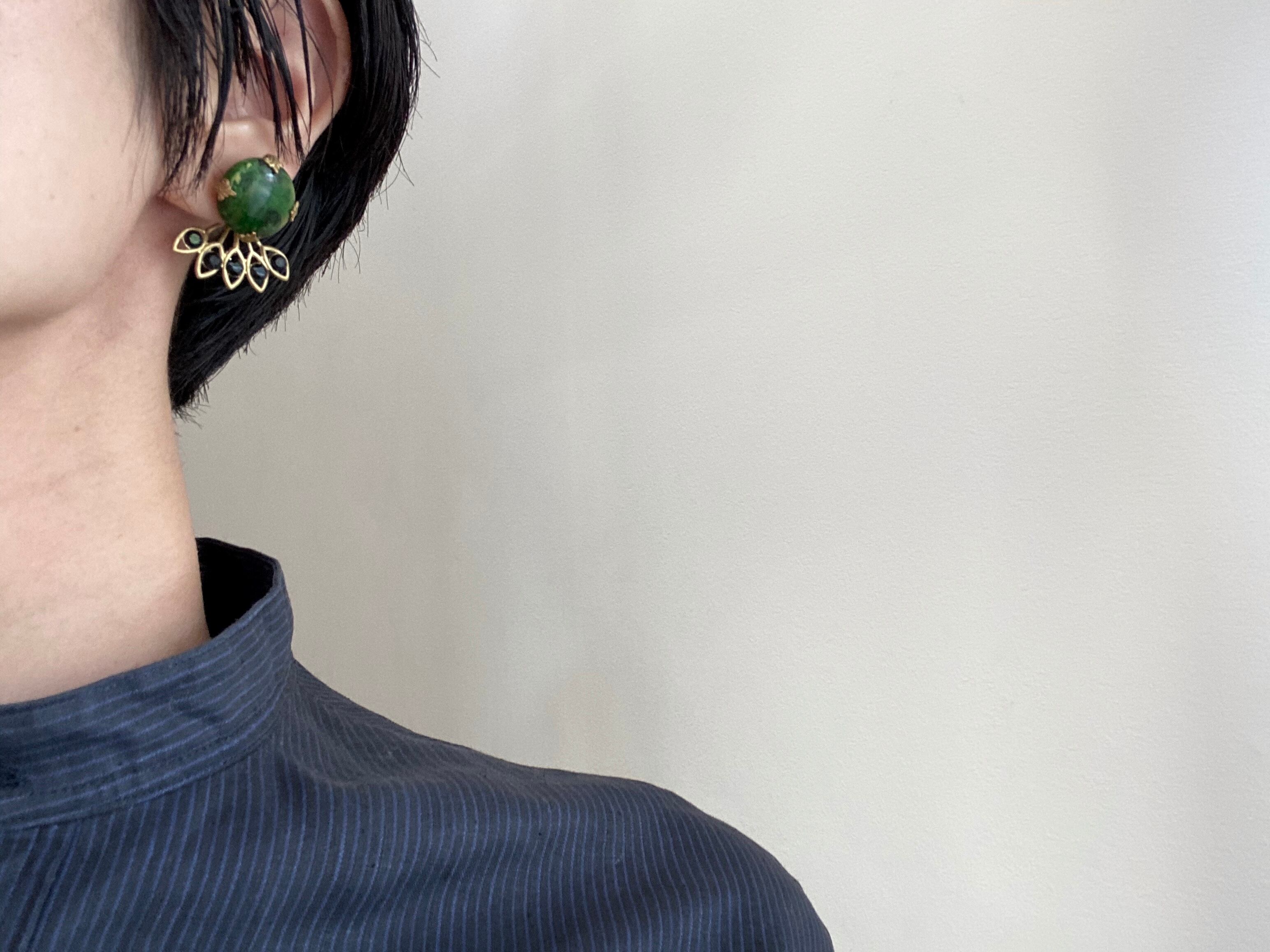 鮮やかだけれど落ち着いた雰囲気のある、独特なグリーンのカボションが印象的な一品です。