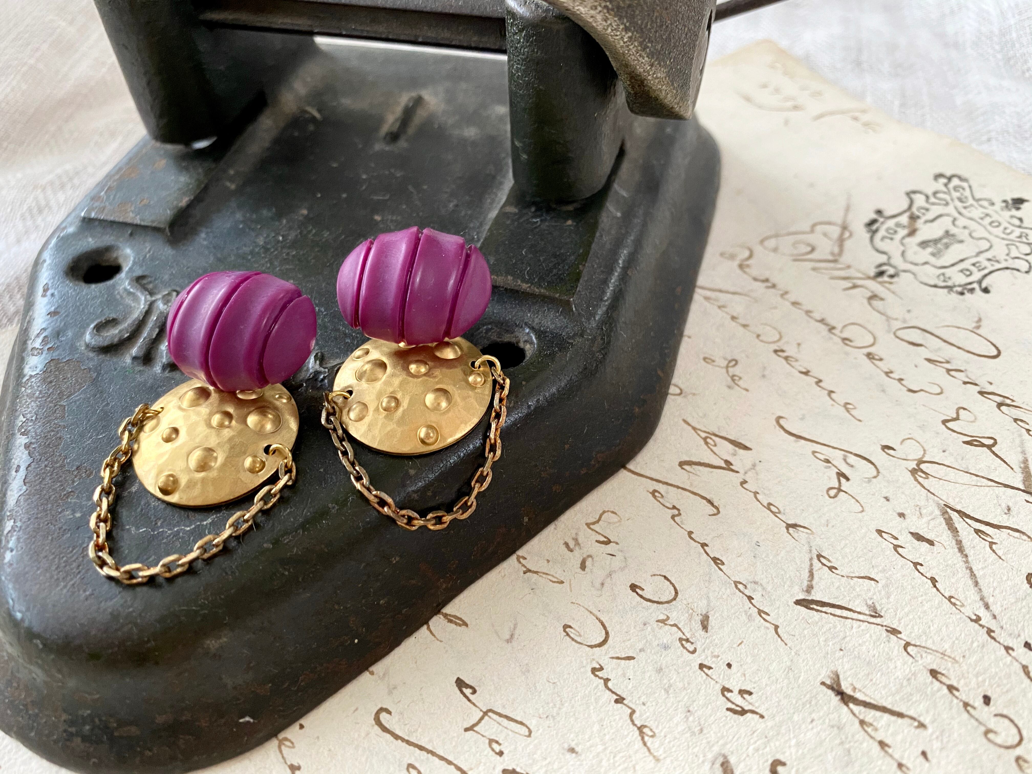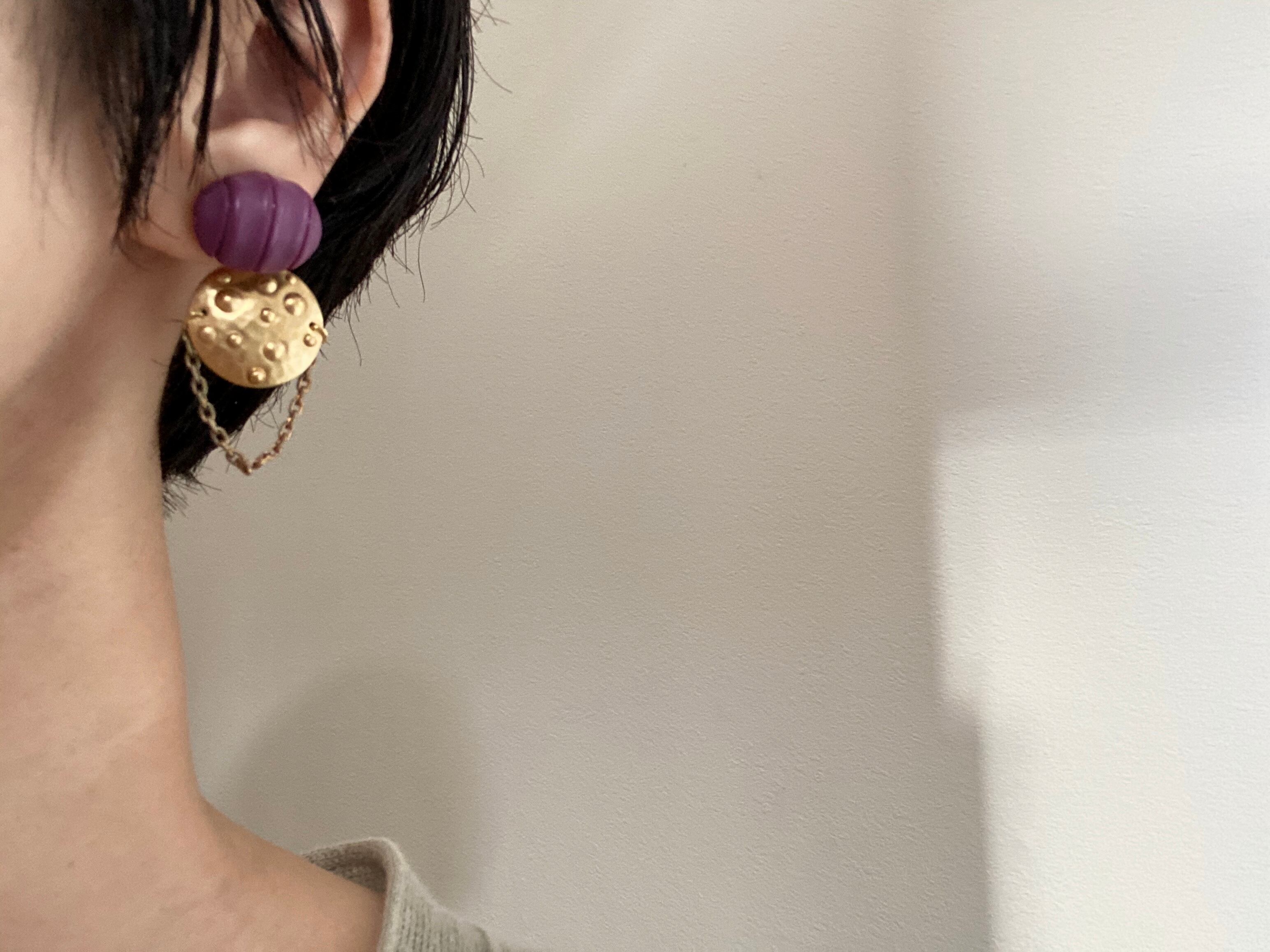 紅紫のカボションに水玉の真鍮プレート、チェーン等、少しアバンギャルドな要素を含んだ、個性的な一品です。