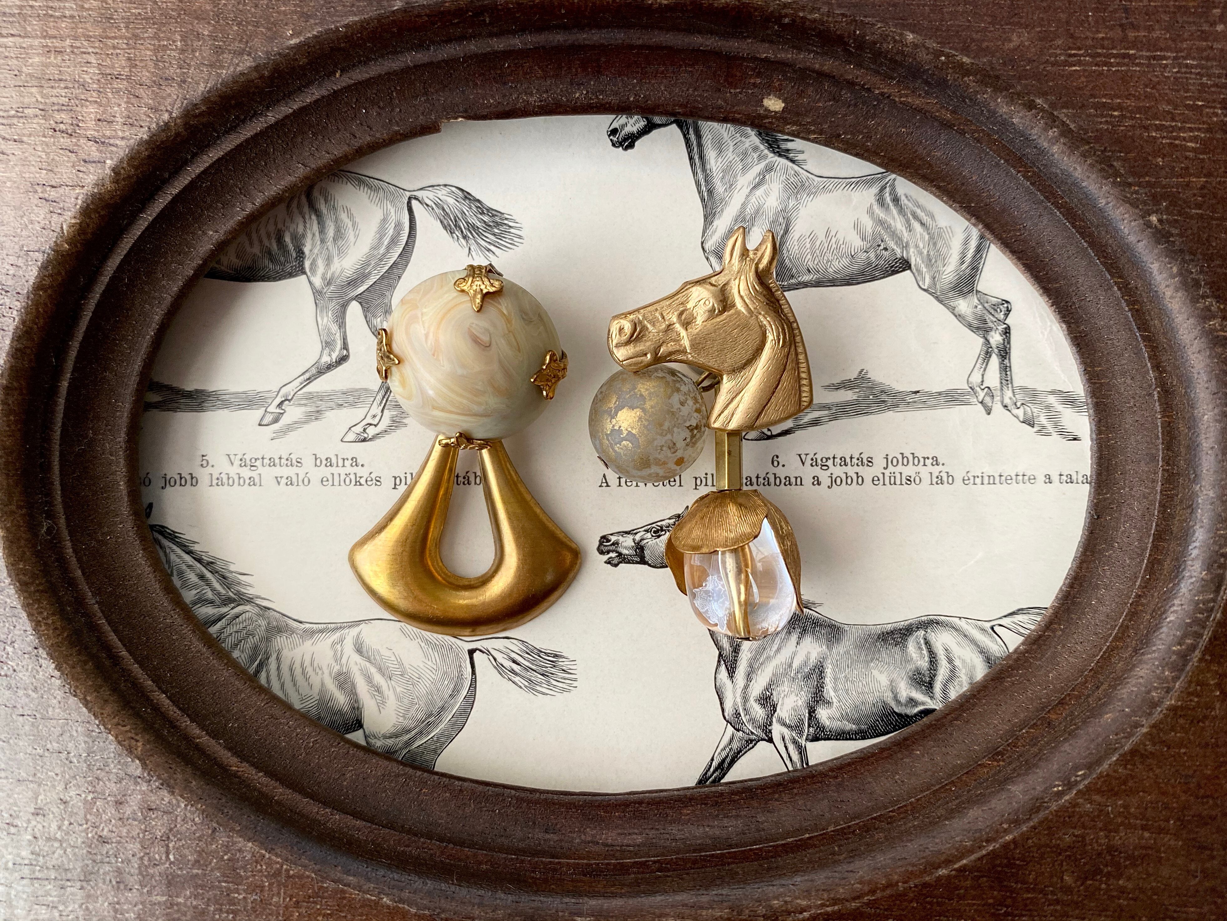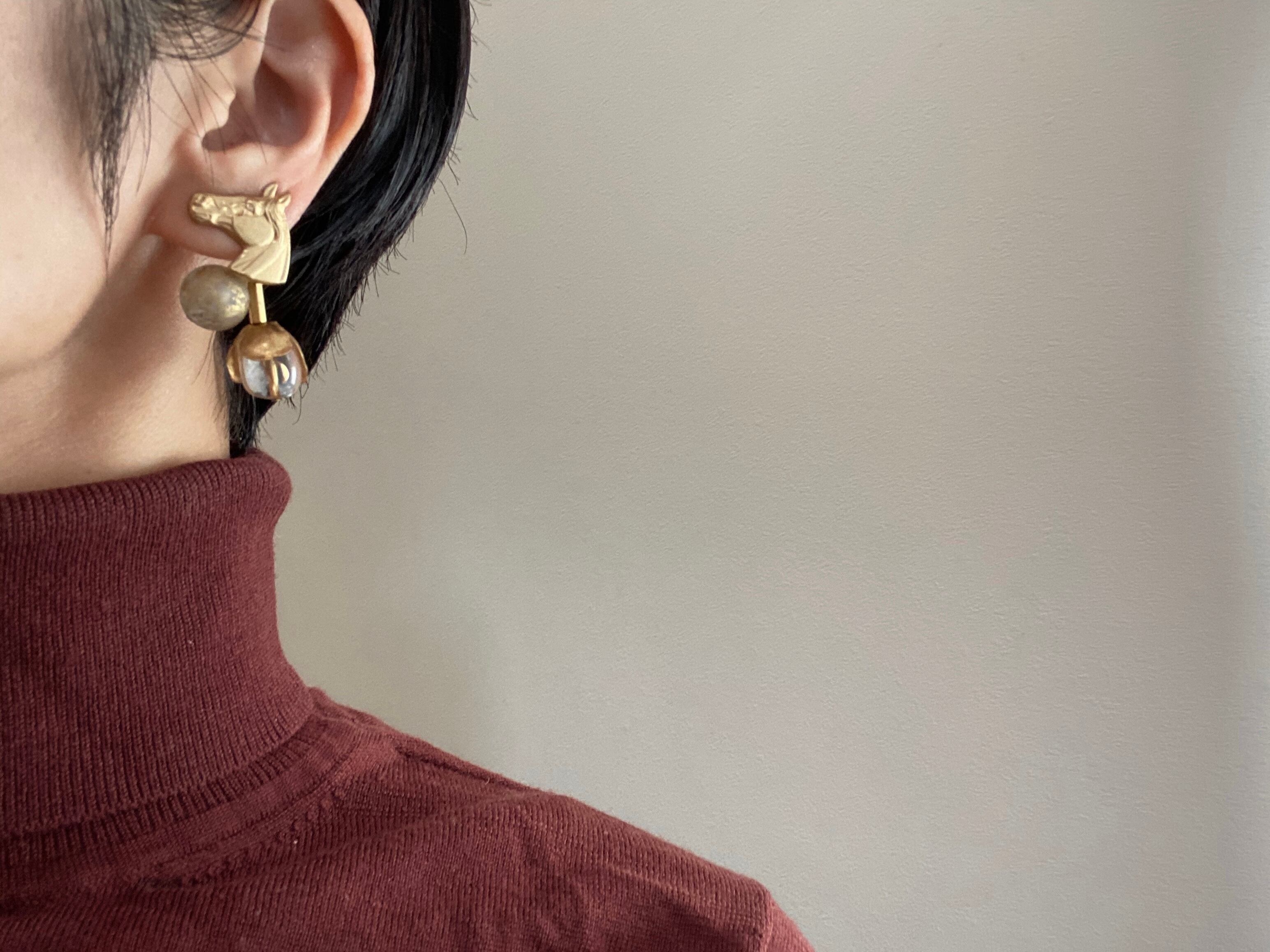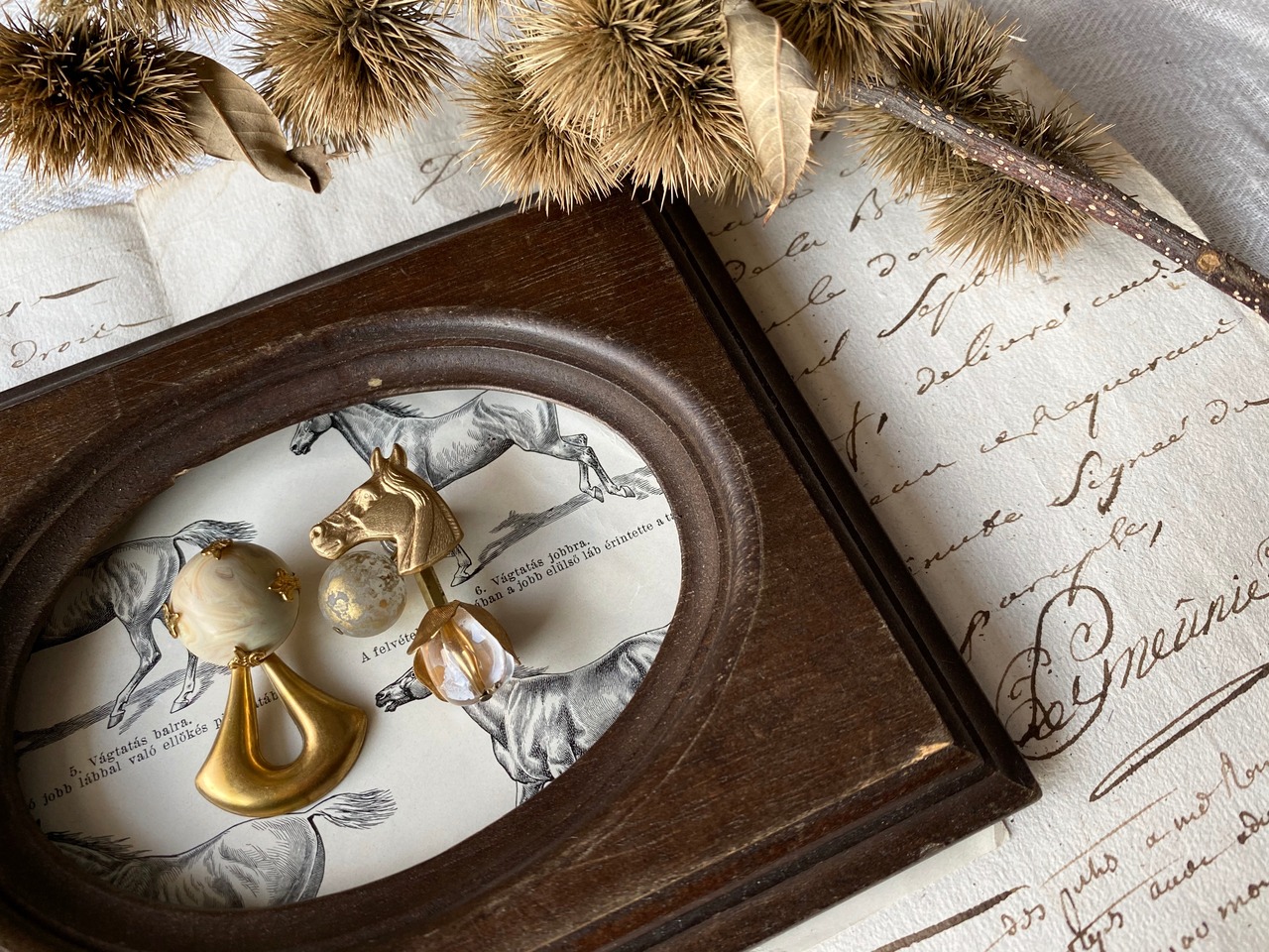 ヴィンテージパーツを組み合わせてアシンメトリーなピアスを作りました。