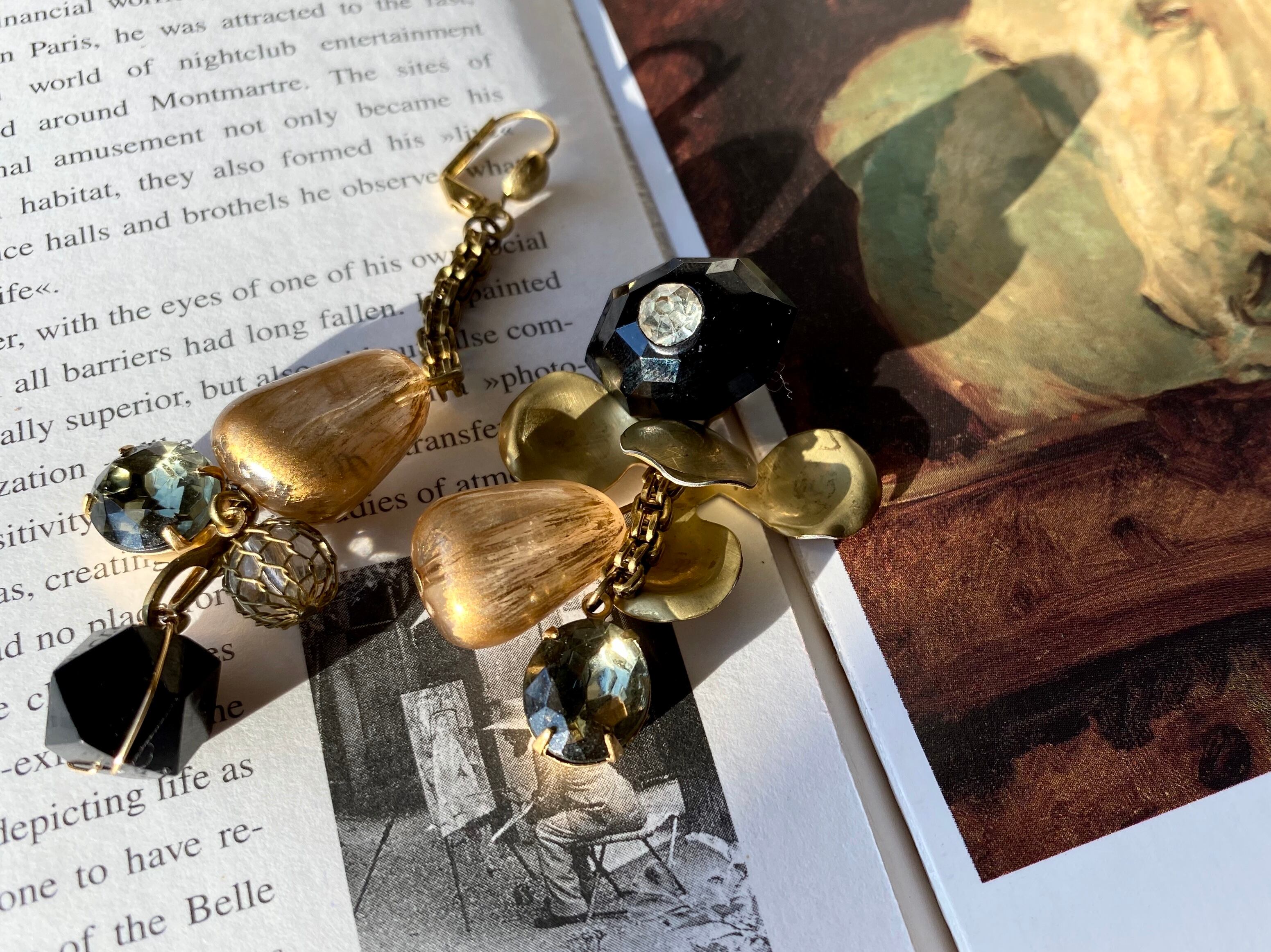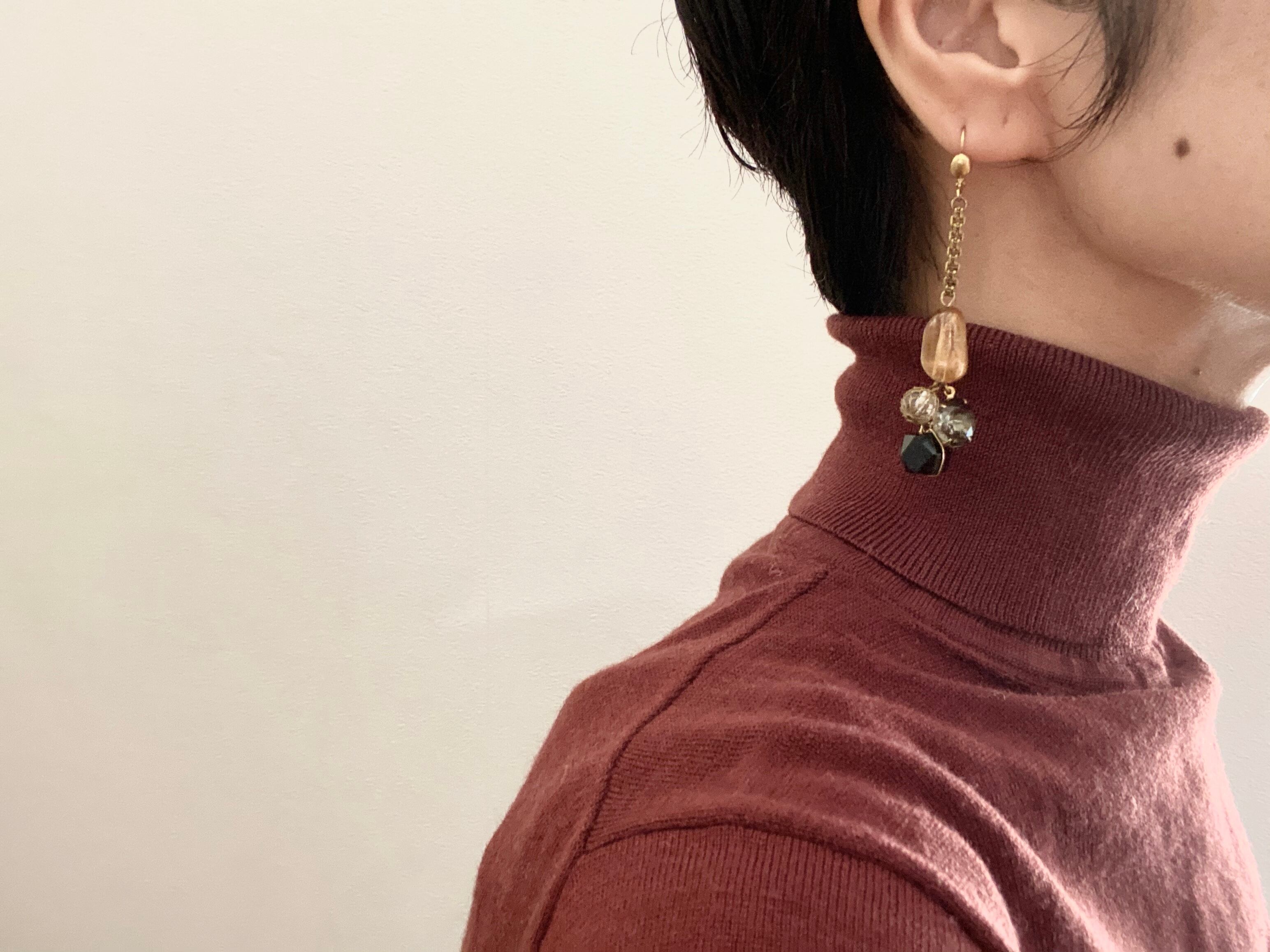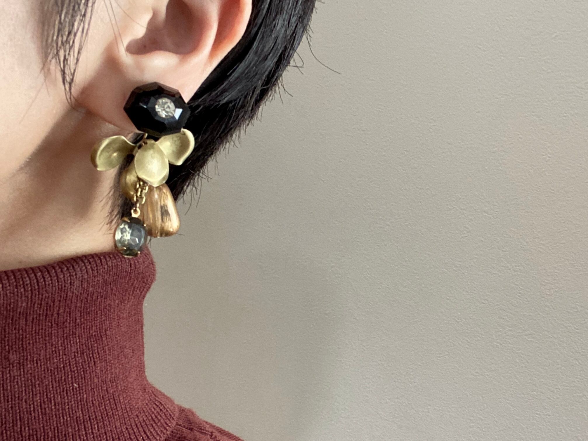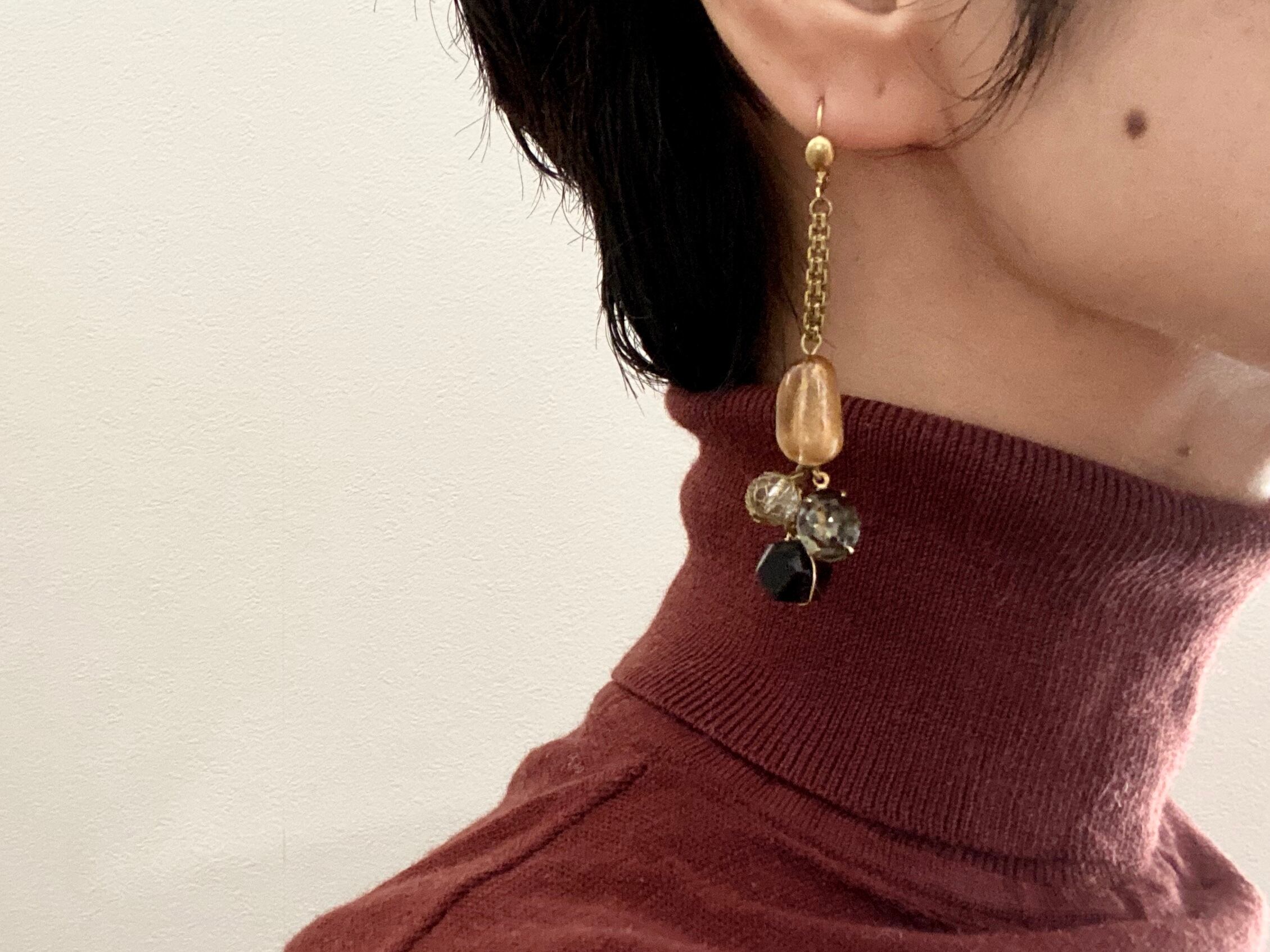 ヴィンテージパーツを組み合わせてアシンメトリーなピアスを作りました。