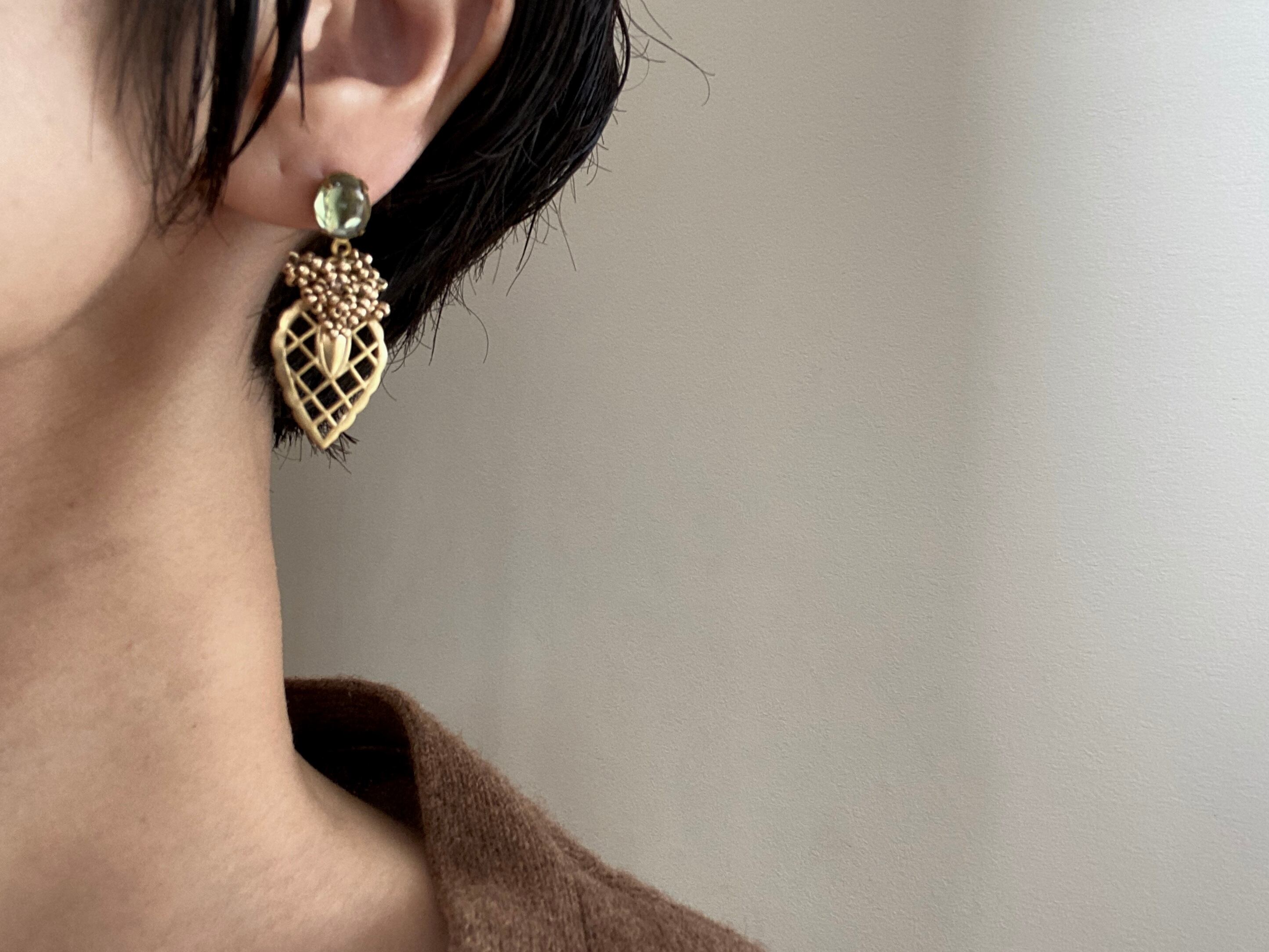 真鍮の葉っぱに艶やかな水滴のようなモスグリーンのヴィンテージガラスが一粒。