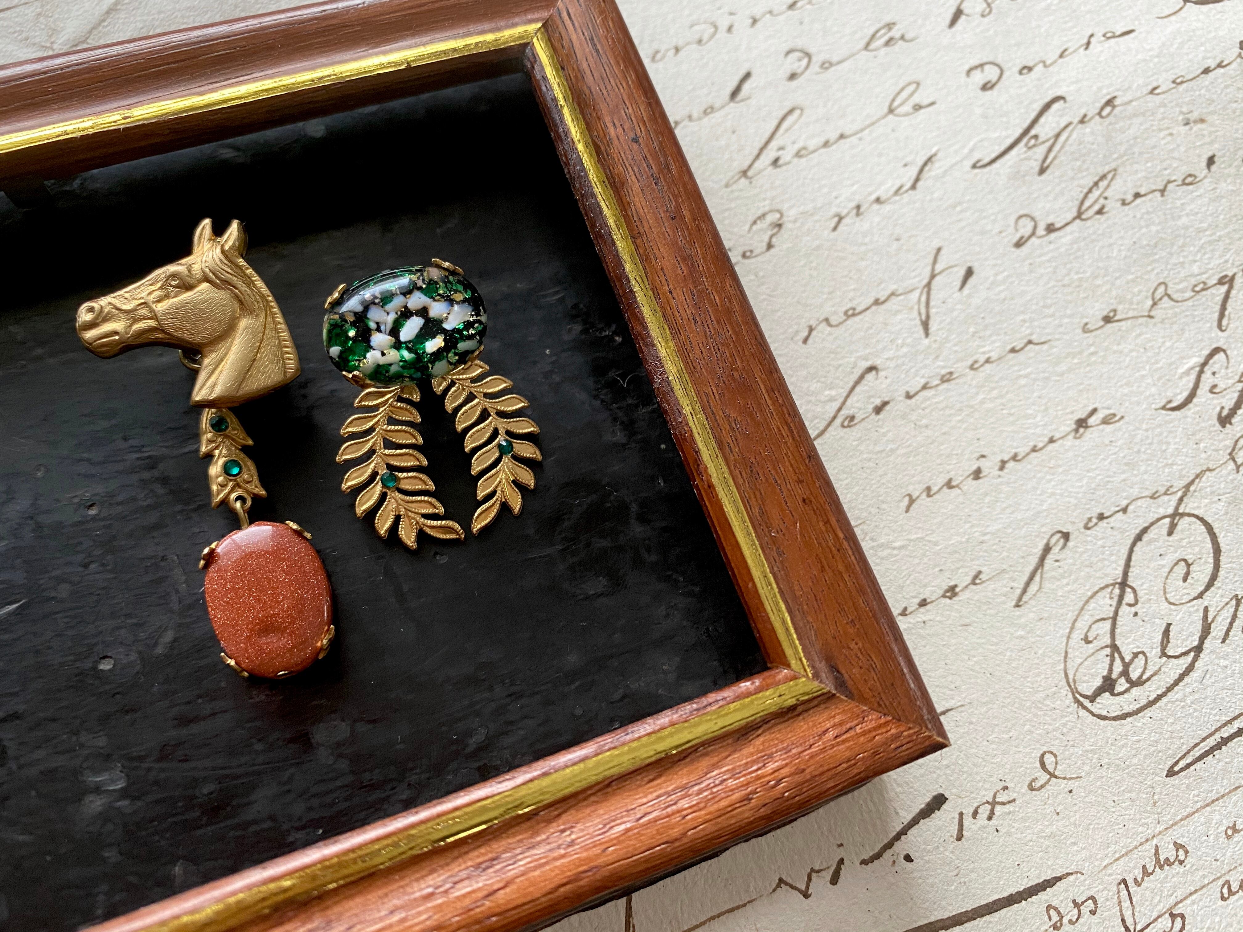ヴィンテージ真鍮パーツやスワロフスキー、ヴィンテージビーズを使って、アシンメトリーなピアスを作りました。