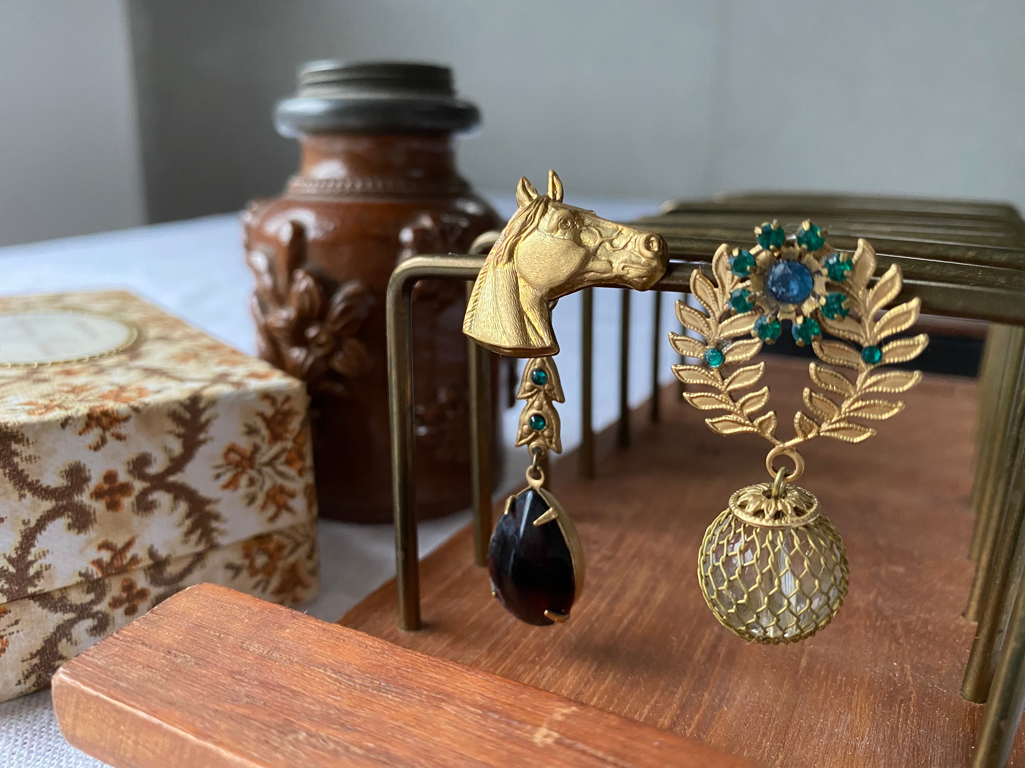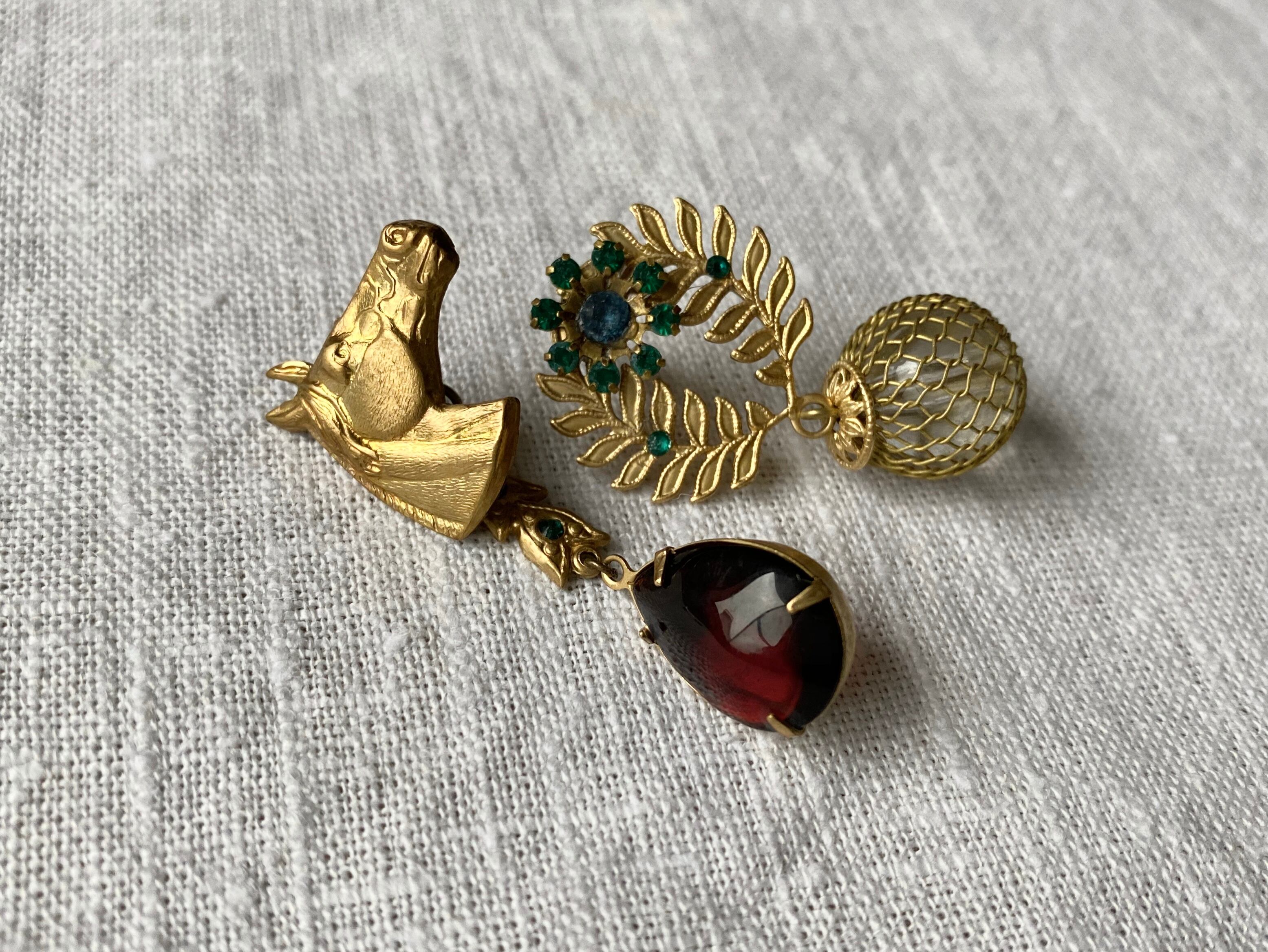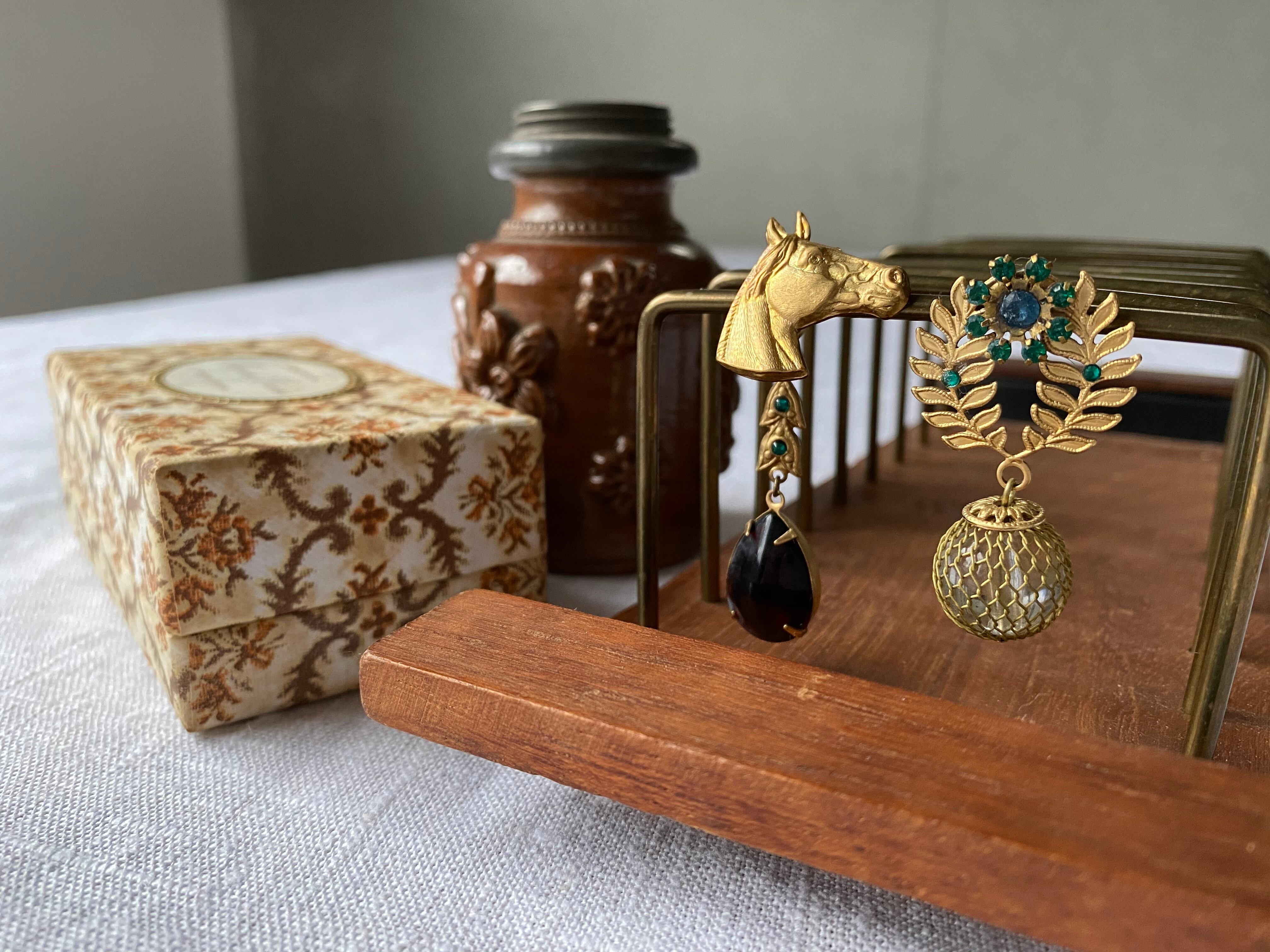 ヴィンテージパーツやスワロフスキーを使って、アシンメトリーピアスを作りました。