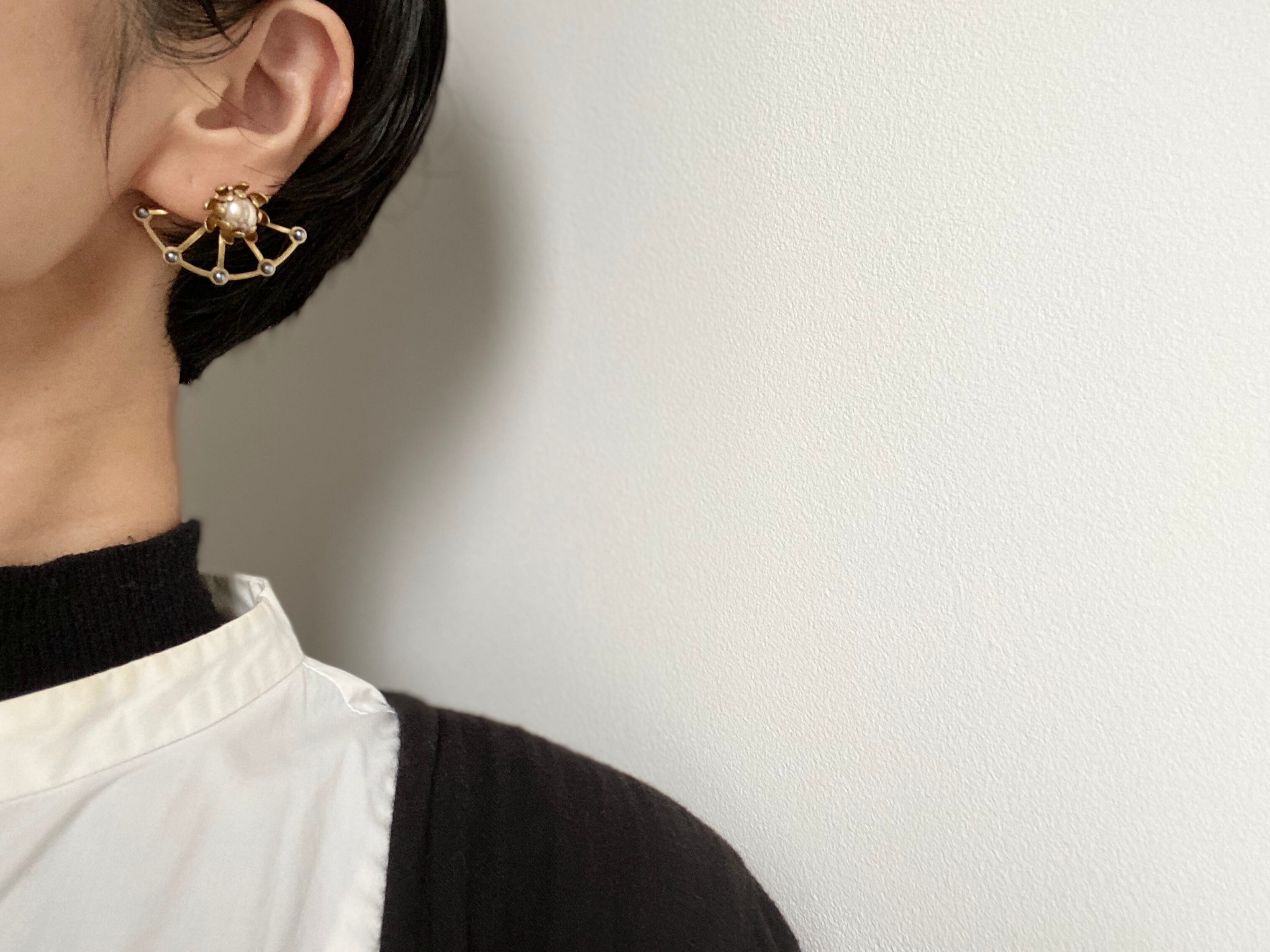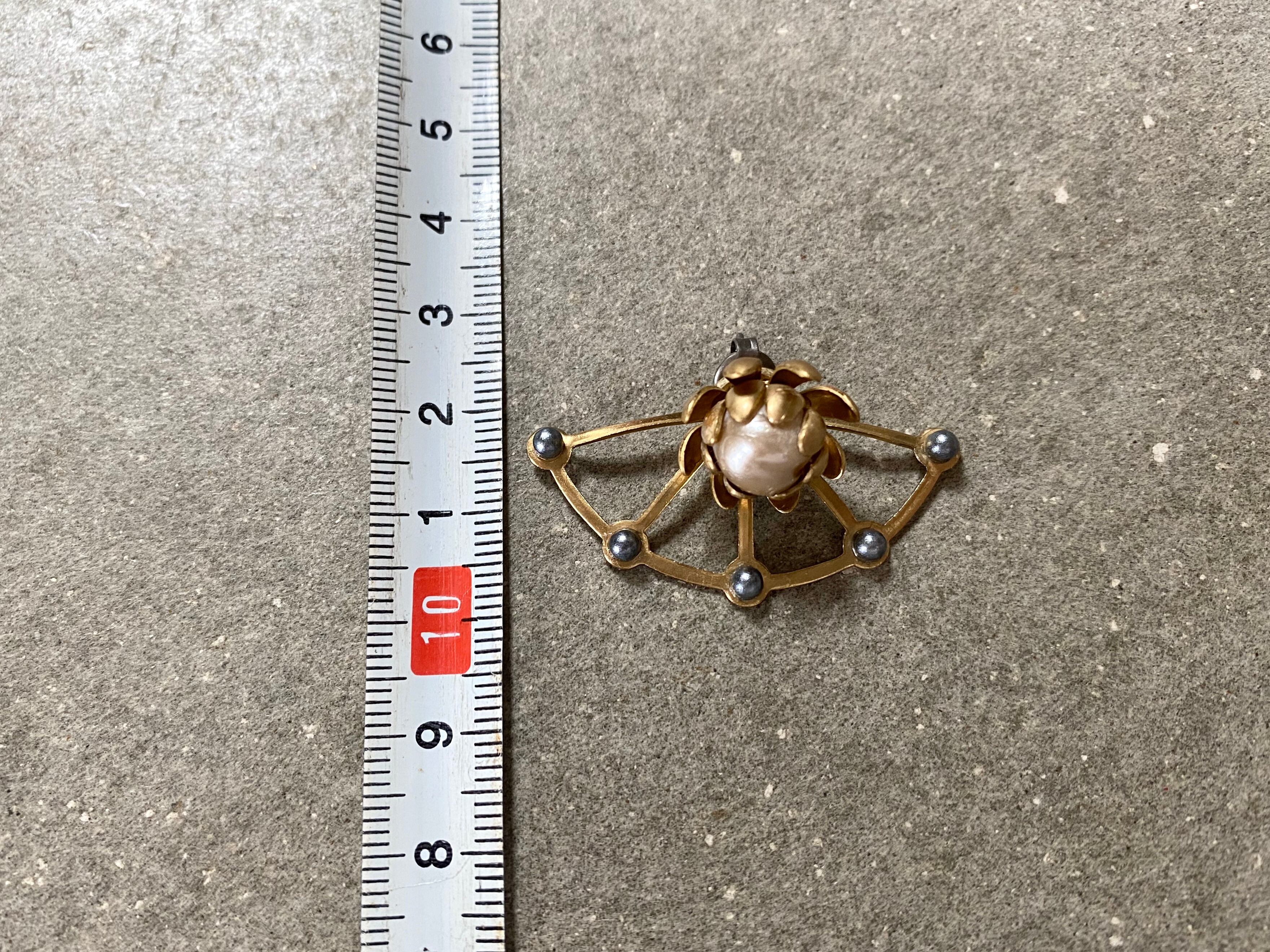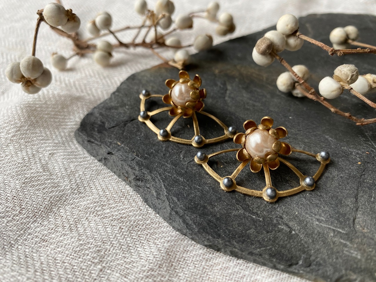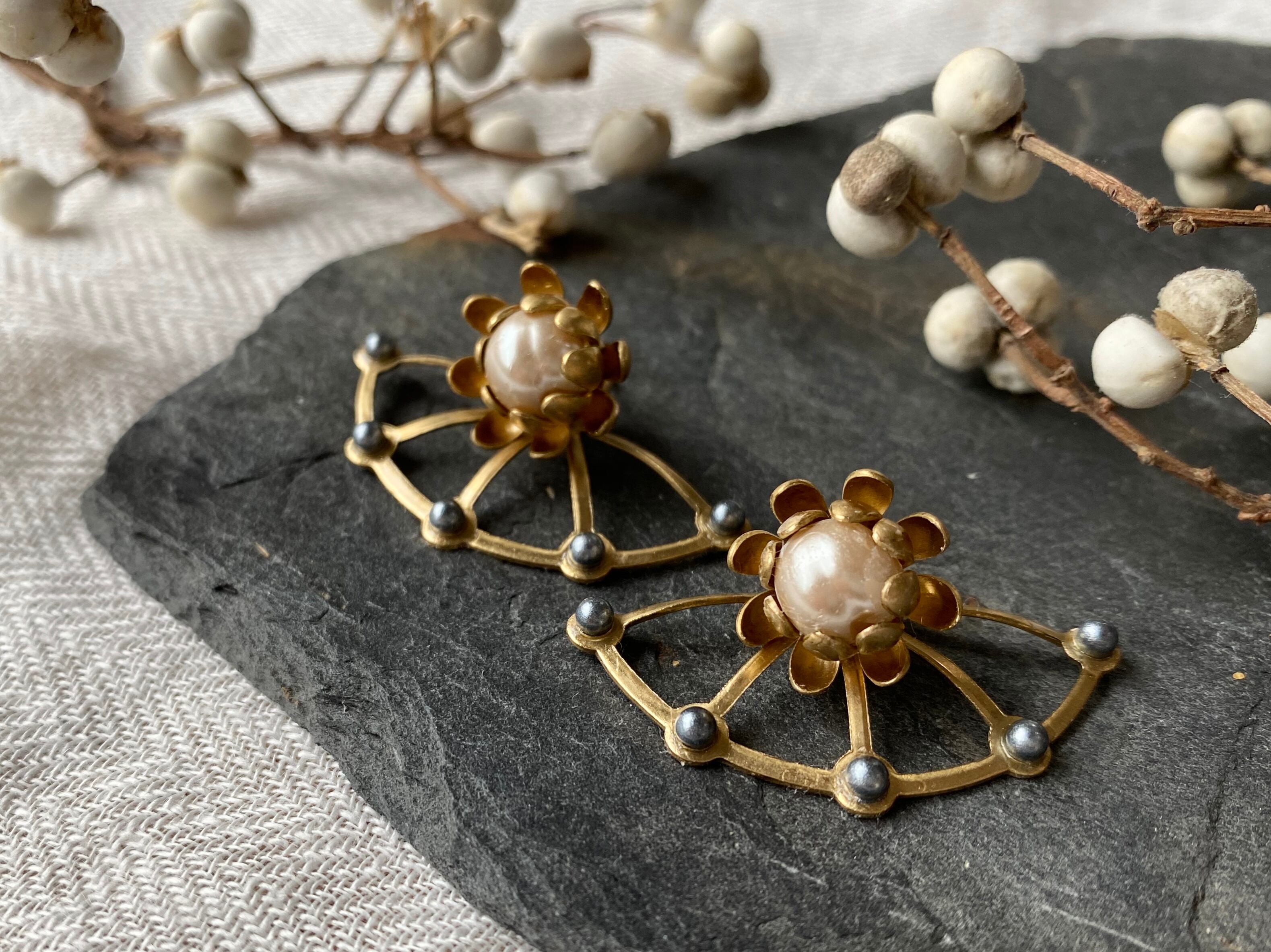 小振りながら華やかなヴィンテージガラスパールのお花から、扇型に広がる真鍮が個性的です。