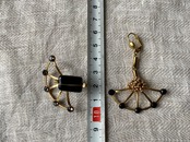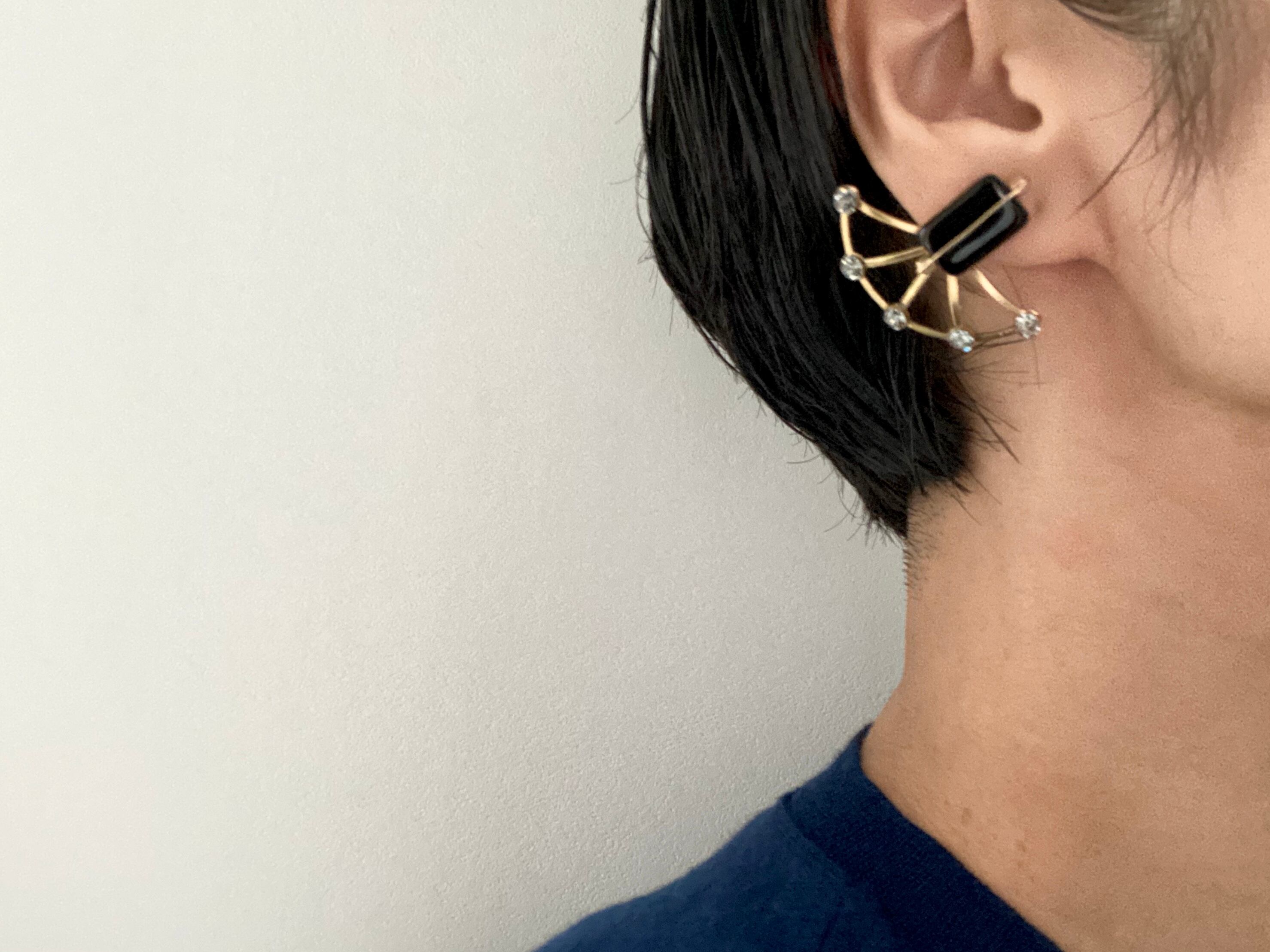 ヴィンテージパーツ、天然石、スワロフスキーを使って、アシンメトリーなピアスを作りました。