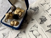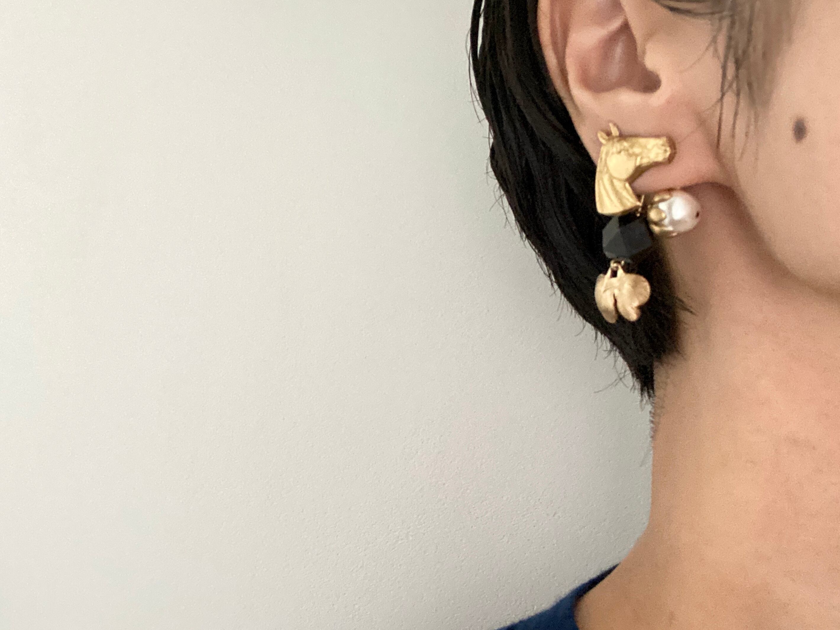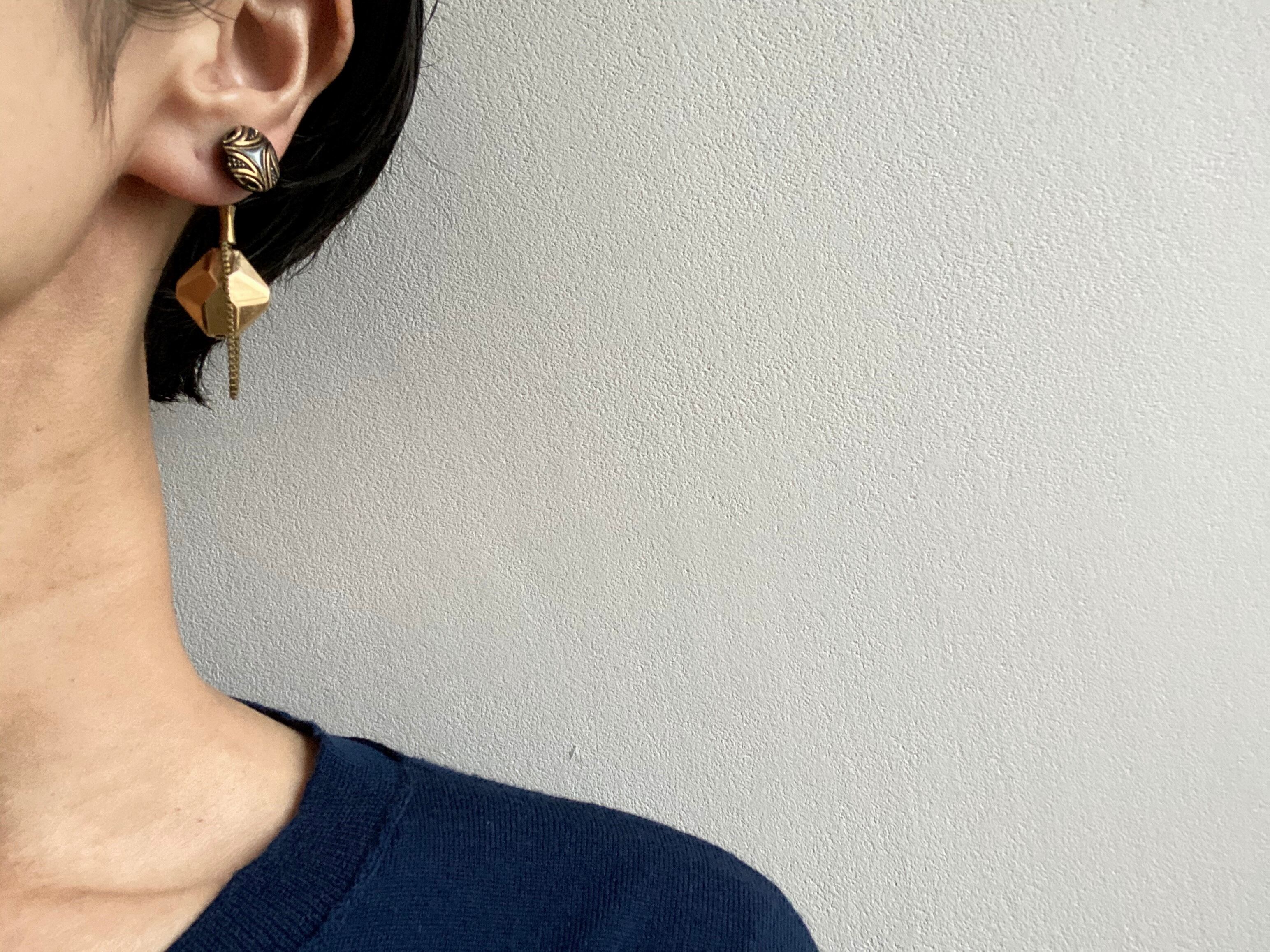 ヴィンテージパーツとヴィンテージボタンを組み合わせて、アシンメトリーなピアスを作りました。