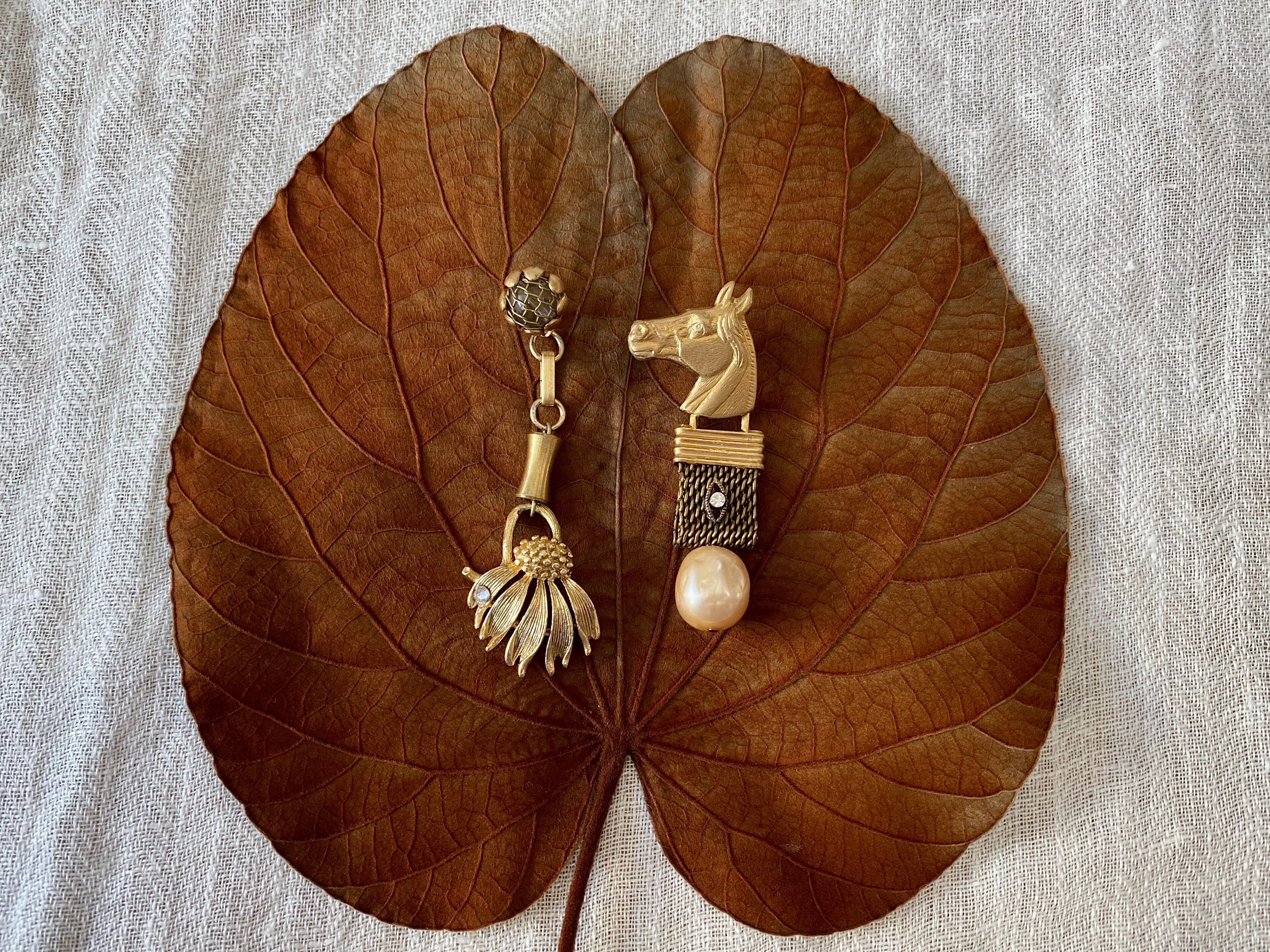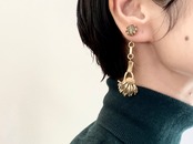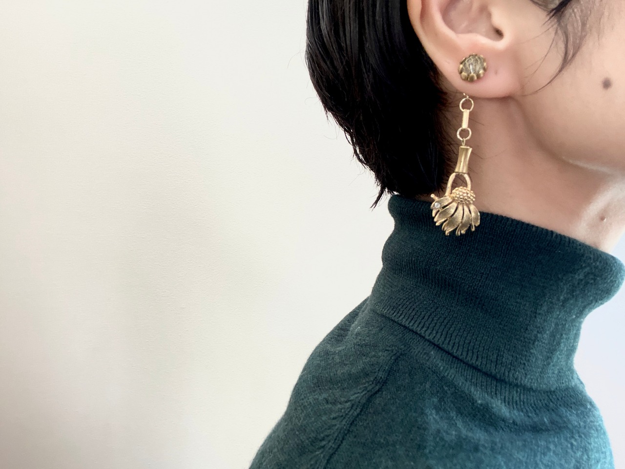 ヴィンテージパーツを組み合わせて、アシンメトリーなピアスを作りました。