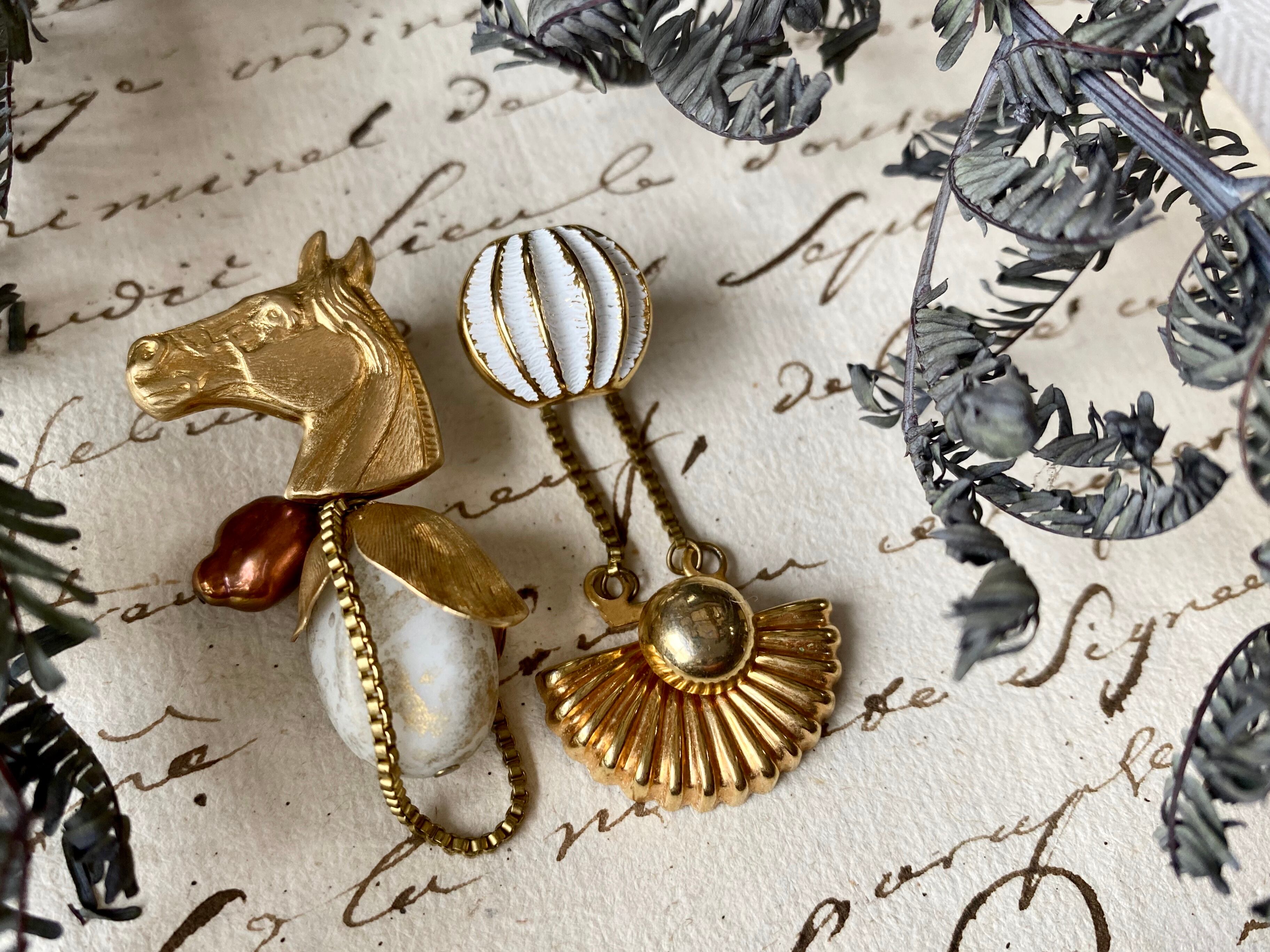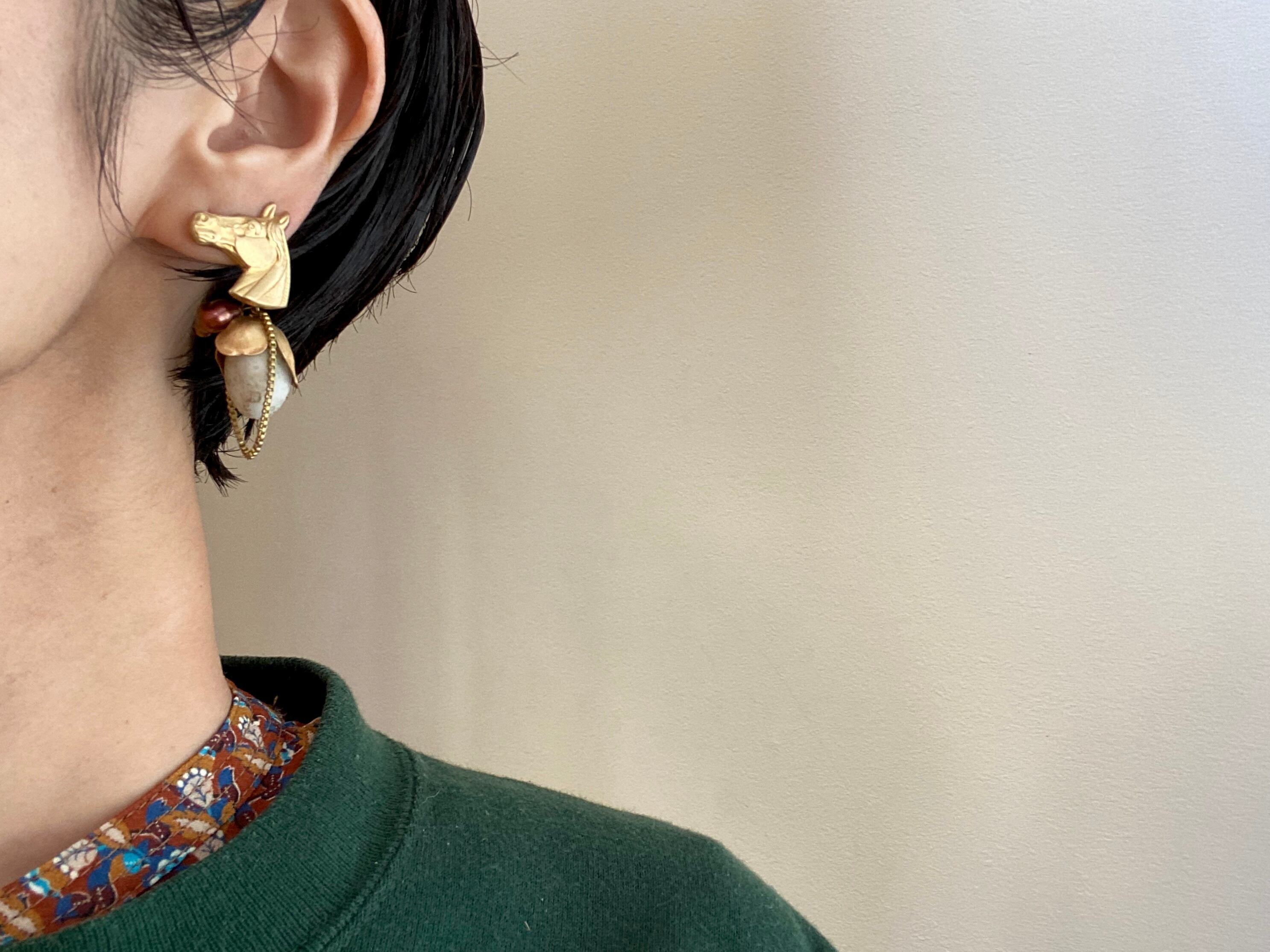 ヴィンテージパーツ、淡水パール、ヴィンテージボタンを組み合わせて、アシンメトリーなピアスを作りました。