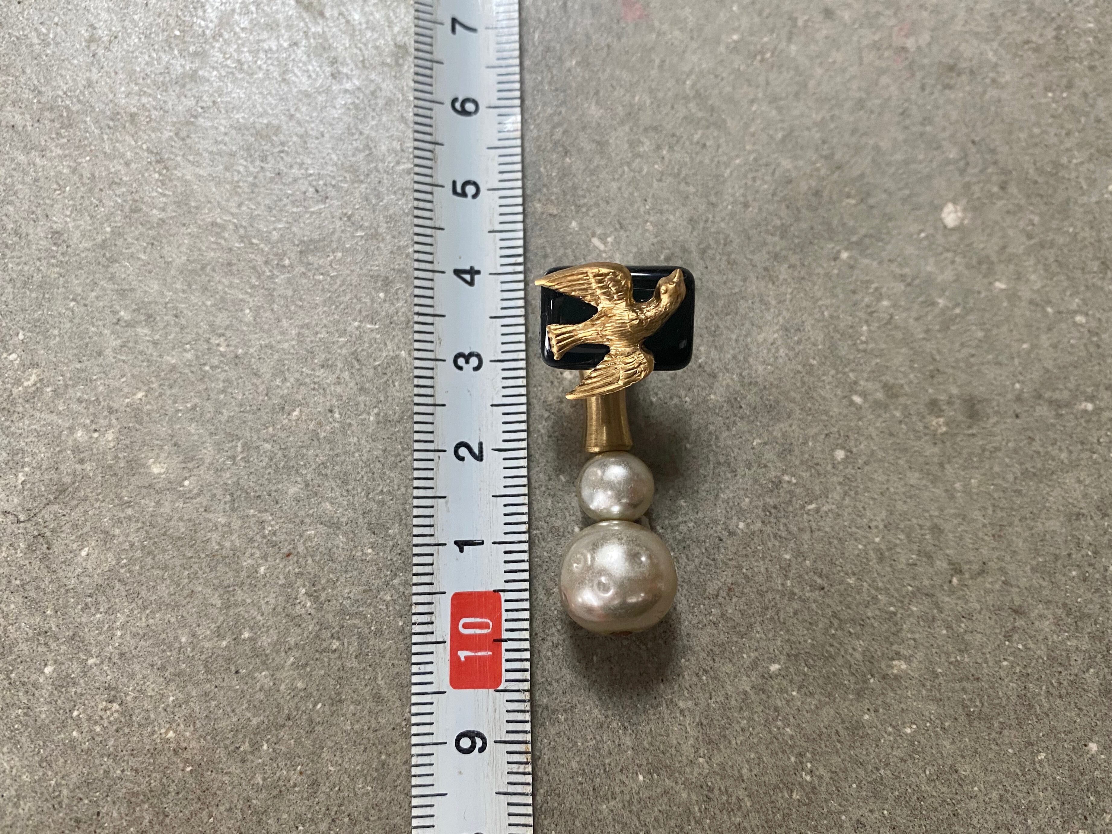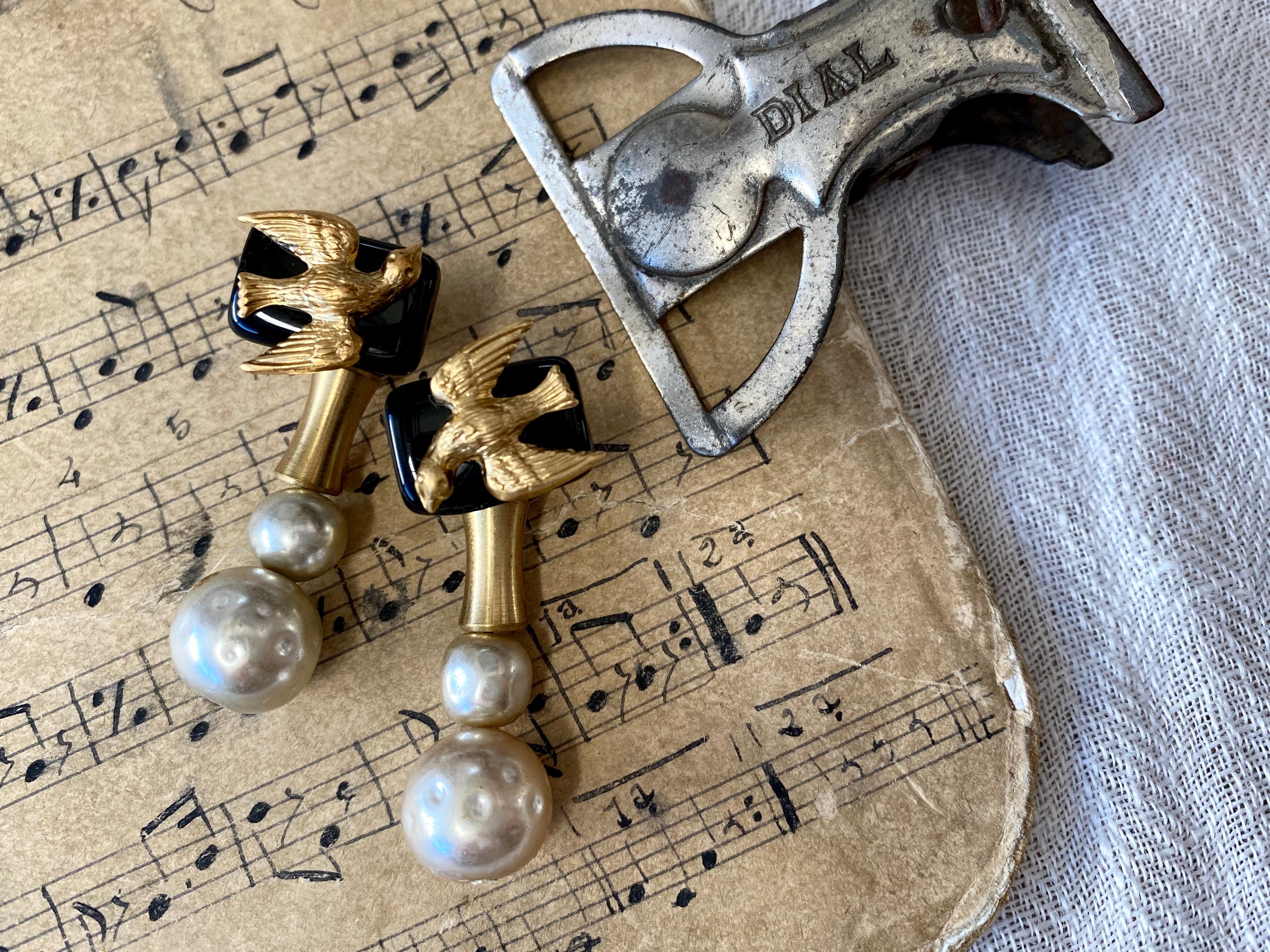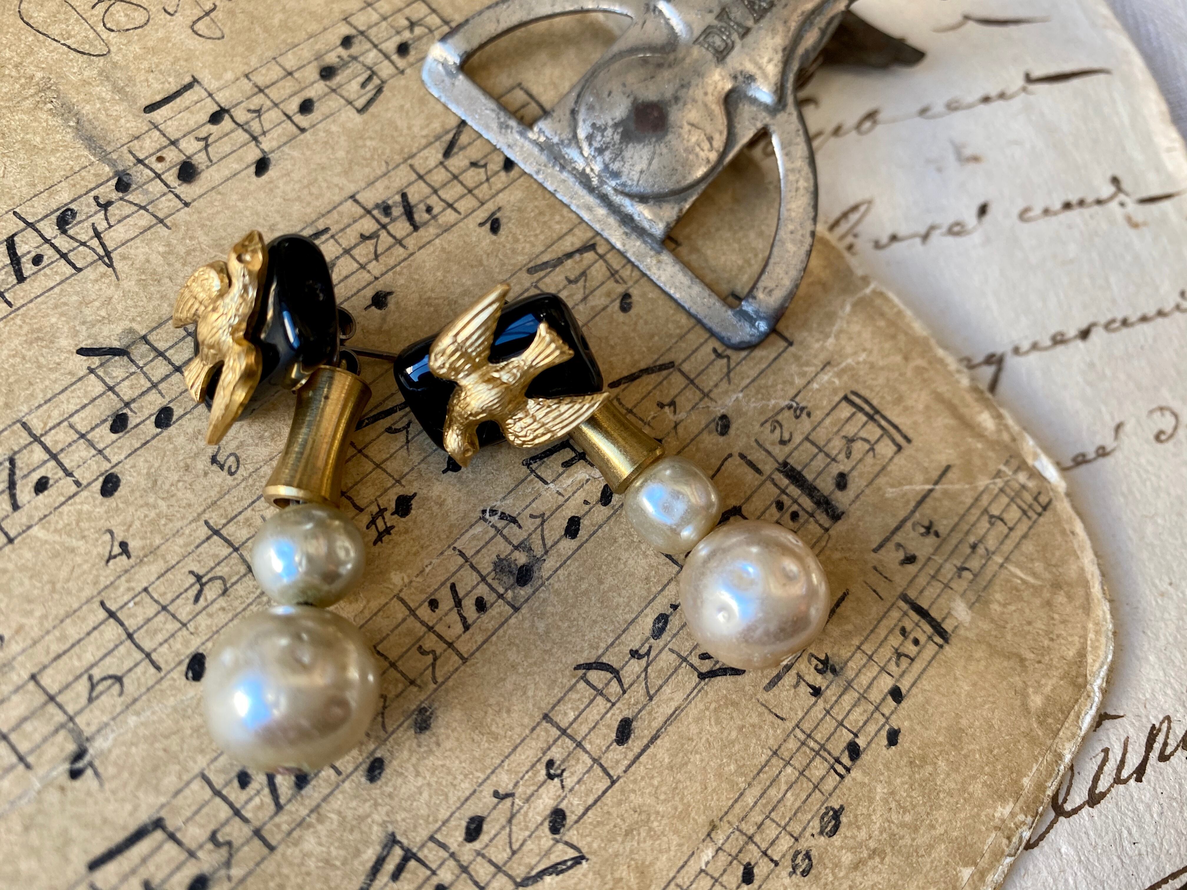 ガラスパールや真鍮の鈍色、艶めく漆黒のガラスに映えるハトのモチーフ。